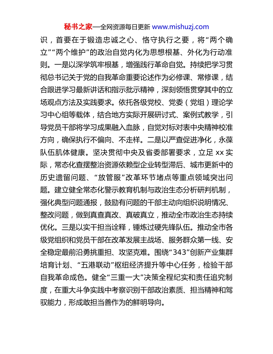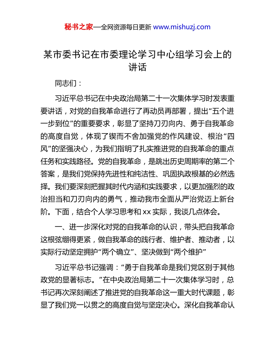 秘书之家—全网资源每日更新 www.mishuzj.com某市委书记在市委理论学习中心组学习会上的讲话同志们:习近平总书记在中央政治局第二十一次集体学习时发表重“要讲话,对党的自我革命进行了再动员再部署,提出 五个进”一步到位 的重要要求,彰显了坚持刀刃向内、勇于自我革命“的高度自觉,体现了锲而不舍加强党的作风建设、根治 四”风 的坚强决心,为我们指明了扎实推进党的自我革命的重点任务和实践路径。党的自我革命,是跳出历史周期率的第二个答案,是我们党保持先进性和纯洁性、巩固执政根基的必然选择。我们要深刻把握其时代内涵和实践要求,以更加强烈的政治担当和刀刃向内的勇气,推动我市全面从严治党迈上新台阶。下面,结合个人学习思考和 xx 实际,我谈几点体会。一、进一步深化对党的自我革命的认识,带头把自我革命这根弦绷得更紧,做自我革命的践行者、维护者、推动者,以“”“”实际行动坚定拥护 两个确立 、坚决做到 两个维护“习近平总书记强调: 勇于自我革命是我们党区别于其他”政党的显著标志。 在中央政治局第二十一次集体学习时,总书记再次深刻阐述了推进党的自我革命这一重大时代课题,彰显了我们党一以贯之的高度自觉与坚定决心。深化自我革命认秘书之家—全网资源每日更新 www.mishuzj.com“识,首要在于锻造忠诚之心、恪守执行之要,将 两个确”“”立两个维护 的政治自觉内化为思想根基、外化为行动准则。一是以深学筑牢根基,增强践行革命自觉。持续把学习贯彻总书记关于党的自我革命重要论述作为必修课、常修课,结合跟进学习最新讲话和指示批示精神,深刻领悟贯穿其中的立场观点方法及实践要求。依托各级党校、党委(党组)理论学习中心组等载体,结合地方实际开展研讨式、案例式教学,引导党员干部将学习成果融入血脉,自觉对标对表中央精神校准方向,确保执行不偏向、不走样。二是以严查促进净化,永葆队伍肌体健康。坚决贯彻中央及省委部署要求,立足 xx 实际,常态化查摆整治资源依赖型企业转型滞后、城市更新中的“”历史遗留问题、 放管服 改革环节堵点等重点领域突出问题。建立健全常态化警示教育机制与政治生态分析研判机制,强化典型问题通报,鼓励有问题的干部主动向组织说明情况、整改问题,做到真查真改、真破真立,推动全市政治生态持续优化。三是以实干担当诠释,锤炼过硬先锋队伍。推动全市各级党组织和党员干部在改革发展主战场、服务群众第一线、安“全稳定最前沿勇挑重担、攻坚克难。围绕 343”创新产业集群“”培育计划、 五港联动 枢纽经济提升等中心任务,检验干部“”自我革命成色。健全 三重一大 决策全程纪实和责任追究制度,在重大斗争实践中考察识别干部政治素质、担当精神和驾驭能力,形成敢担当善作为的鲜明导向。秘书之家—全网资源每日更新 www.mishuzj.com二、进一步深化对增强党性的认识,带头加强党性修养和历练,把政治修养摆在首位,坚守许党之心、报国之志,始终站稳人民立场,为高质量发展凝心聚力“习近平总书记指出: 党性是党员干部立身、立业、立”言、立德的基石。 在多个重要场合反复强调全党同志要自觉加强党性锻炼,不断提高政治觉悟和政治能力。增强党性,必须抓住政治修养这个核心,将对党忠诚的信念、报效国家的壮志、服务人民的情怀熔铸于心、展现于行,成为凝聚全市高质量发展磅礴力量的精神纽带。一是淬炼绝对忠诚第一品格,把政治方向把准把牢。坚持把政治标准放在首位,全市各级党校要强化党章党规党纪学习,将政治训练贯穿干部选育管用全过程。严格执行新形势下党内政治生活若干准则,严肃批评和自“”我批评,增强组织生活 熔炉 温度。重点引导领导干部在贯彻落实中央关于资源型城市转型、促进共同富裕等重大决策部署上态度鲜明、行动坚决,在破解贾汪等老工矿区转型发展难题中展现政治担当,将许党报国信念体现为服务国家发展全局的政治执行力。二是站稳执政为民根本立场,将群众路线走深走实。深入贯彻以人民为中心的发展思想,围绕市委确立的民“”“”“生 七有 目标,坚持 四下基层 制度,畅通 12345”等线上线下民意渠道。建立完善领导干部定...