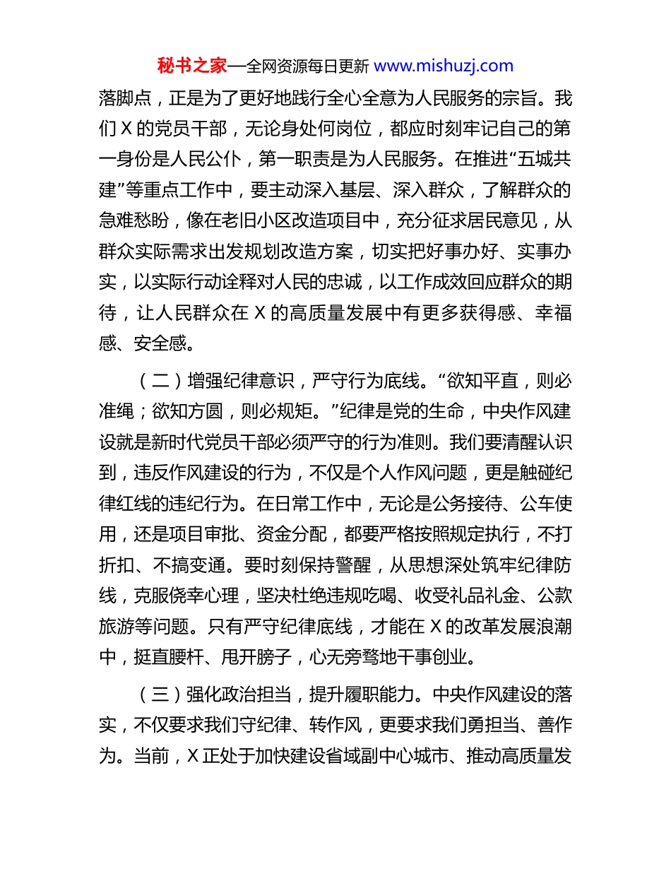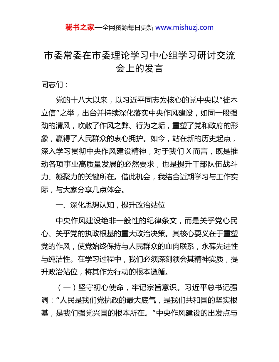 秘书之家—全网资源每日更新 www.mishuzj.com市委常委在市委理论学习中心组学习研讨交流会上的发言同志们:“党的十八大以来,以习近平同志为核心的党中央以 徙木”立信 之举,出台并持续深化落实中央作风建设,如同一股强劲的清风,吹散了作风之弊、行为之垢,重塑了党和政府的形象,赢得了人民群众的衷心拥护。如今,站在新的历史起点,深入学习贯彻中央作风建设精神,对于我们 X 而言,既是推动各项事业高质量发展的必然要求,也是提升干部队伍战斗力、凝聚力的关键所在。借此机会,我结合近期学习与工作实际,与大家分享几点体会。一、深化思想认知,提升政治站位中央作风建设绝非一般性的纪律条文,而是关乎党心民心、关乎党的执政根基的重大政治决策。其核心要义在于重塑党的作风,使党始终保持与人民群众的血肉联系,永葆先进性与纯洁性。在学习过程中,我们必须深刻领会其精神实质,提升政治站位,将其作为行动的根本遵循。(一)坚守初心使命,牢记宗旨意识。习近平总书记强“调: 人民是我们党执政的最大底气,是我们共和国的坚实根”基,是我们强党兴国的根本所在。 中央作风建设的出发点与秘书之家—全网资源每日更新 www.mishuzj.com落脚点,正是为了更好地践行全心全意为人民服务的宗旨。我们 X 的党员干部,无论身处何岗位,都应时刻牢记自己的第“一身份是人民公仆,第一职责是为人民服务。在推进 五城共”建 等重点工作中,要主动深入基层、深入群众,了解群众的急难愁盼,像在老旧小区改造项目中,充分征求居民意见,从群众实际需求出发规划改造方案,切实把好事办好、实事办实,以实际行动诠释对人民的忠诚,以工作成效回应群众的期待,让人民群众在 X 的高质量发展中有更多获得感、幸福感、安全感。“(二)增强纪律意识,严守行为底线。 欲知平直,则必”准绳;欲知方圆,则必规矩。 纪律是党的生命,中央作风建设就是新时代党员干部必须严守的行为准则。我们要清醒认识到,违反作风建设的行为,不仅是个人作风问题,更是触碰纪律红线的违纪行为。在日常工作中,无论是公务接待、公车使用,还是项目审批、资金分配,都要严格按照规定执行,不打折扣、不搞变通。要时刻保持警醒,从思想深处筑牢纪律防线,克服侥幸心理,坚决杜绝违规吃喝、收受礼品礼金、公款旅游等问题。只有严守纪律底线,才能在 X 的改革发展浪潮中,挺直腰杆、甩开膀子,心无旁骛地干事创业。(三)强化政治担当,提升履职能力。中央作风建设的落实,不仅要求我们守纪律、转作风,更要求我们勇担当、善作为。当前,X 正处于加快建设省域副中心城市、推动高质量发秘书之家—全网资源每日更新 www.mishuzj.com展的关键时期,面临着诸多机遇与挑战。我们要以贯彻作风建设为契机,强化政治担当,提升履职能力。在招商引资工作中,既要秉持廉洁自律的原则,又要积极主动作为,精准对接企业需求,为企业提供优质高效的服务,吸引更多优质项目落户 X;在产业转型升级过程中,要敢于创新、勇于突破,积极研究政策、谋划项目,为 X 产业发展注入新动能。以强烈的责任感和使命感,在各自岗位上发光发热,为 X 的发展贡献力量。二、聚焦实践举措,推动作风转变在 X 的工作实践中,我们要将中央作风建设精神融入各项工作的全过程、各环节,以实际行动推动作风转变,提升工作效能。(一)优化调查研究,掌握真实情况。一是要带着问题去调研。当前 X 在推进乡村振兴战略中,存在着农村产业发展不均衡、人才短缺等问题。我们要围绕这些问题,深入农村一线,与农民群众、基层干部面对面交流,了解问题的症结所在,为制定切实可行的政策提供依据。二是要注重调研方式方法。不搞形式主义的调研,轻车简从,减少随行人员,不提前安排路线,多一些随机走访、实地查看。比如在调研城市交通拥堵问题时,要实地体验不同时段、不同路段的交通状况,而不是只听汇报、看材料。三是要善于总结提炼。对调研中发现的问题和经验,要进行深入分析,总结出具有普遍性、规律性秘书之家—全网资源每日更新 www.mishuzj.com的东西,形成高质量的调研报告,为市委、市政府决策提供参考,推动 X...
