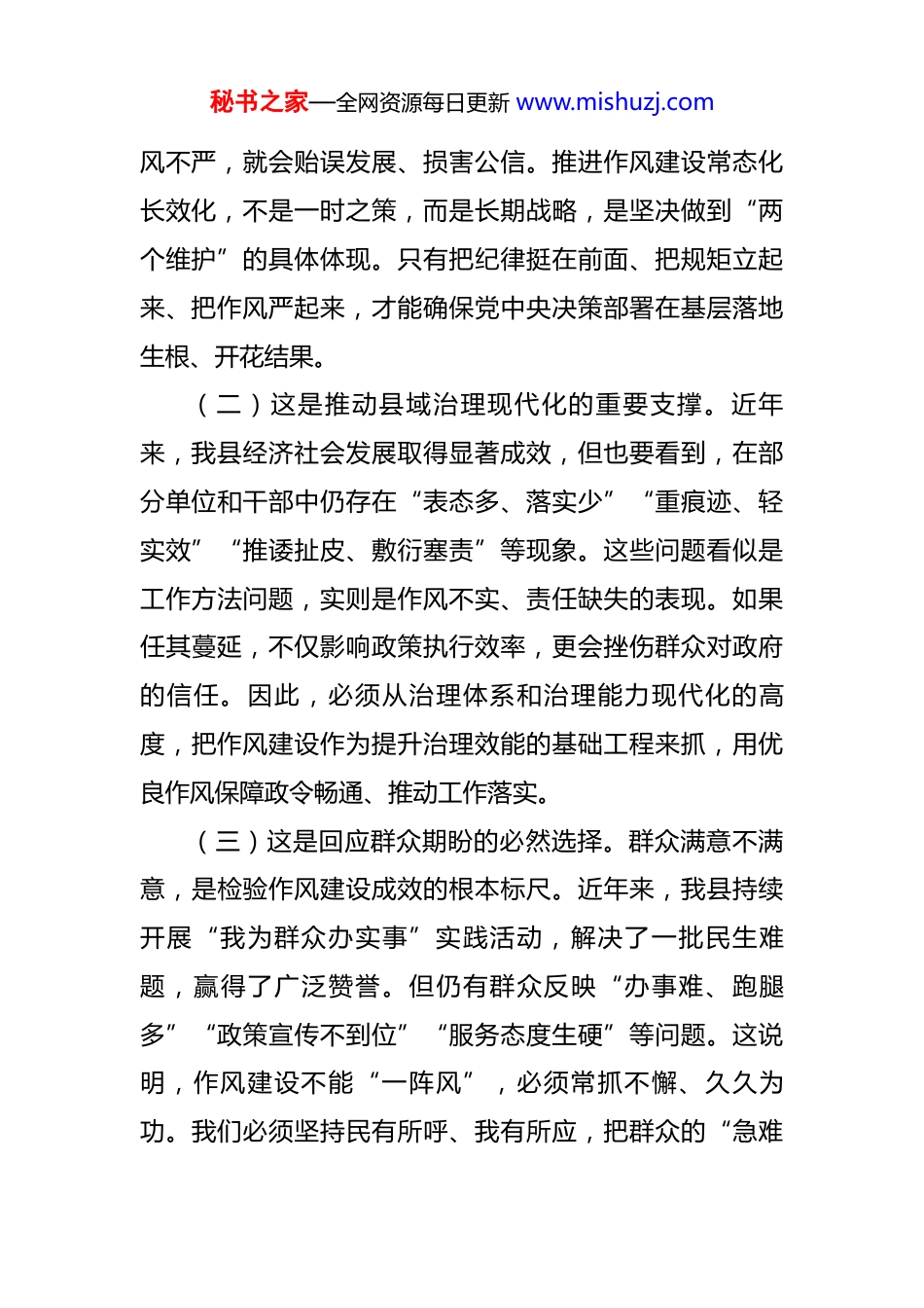 秘书之家—全网资源每日更新 www.mishuzj.com在推进作风建设常态化长效化工作部署会议上的讲话 同志们:作风建设关乎党的形象,关乎事业成败,关乎群众切身利益。党的二十大报告明确提出,“坚持以严的基调强化正风肃纪”,强调要“锲而不舍落实纪律规定精神,持续深化纠治‘四风’,重点纠治形式主义、官僚主义”。这一重要论述为新时代加强作风建设指明了方向、提供了遵循。当前,我县正处于推动高质量发展的关键阶段,改革发展任务艰巨繁重,人民群众期待持续提升,唯有以永远在路上的坚韧和执着推进作风建设常态化长效化,才能凝聚起攻坚克难的强大合力,夯实执政根基、厚植发展优势。一、提高政治站位,深刻把握作风建设常态化长效化的重大意义(一)这是践行“两个维护”的内在要求。作风问题本质上是党性问题,关系到党同人民群众的血肉联系。习近平总书记反复强调,“党的作风就是党的形象,关系人心向背,关系党的生死存亡。”我们每一名党员干部都必须清醒认识到,作风不正,就会脱离群众、背离宗旨;作秘书之家—全网资源每日更新 www.mishuzj.com风不严,就会贻误发展、损害公信。推进作风建设常态化长效化,不是一时之策,而是长期战略,是坚决做到“两个维护”的具体体现。只有把纪律挺在前面、把规矩立起来、把作风严起来,才能确保党中央决策部署在基层落地生根、开花结果。(二)这是推动县域治理现代化的重要支撑。近年来,我县经济社会发展取得显著成效,但也要看到,在部分单位和干部中仍存在“表态多、落实少”“重痕迹、轻实效”“推诿扯皮、敷衍塞责”等现象。这些问题看似是工作方法问题,实则是作风不实、责任缺失的表现。如果任其蔓延,不仅影响政策执行效率,更会挫伤群众对政府的信任。因此,必须从治理体系和治理能力现代化的高度,把作风建设作为提升治理效能的基础工程来抓,用优良作风保障政令畅通、推动工作落实。(三)这是回应群众期盼的必然选择。群众满意不满意,是检验作风建设成效的根本标尺。近年来,我县持续开展“我为群众办实事”实践活动,解决了一批民生难题,赢得了广泛赞誉。但仍有群众反映“办事难、跑腿多”“政策宣传不到位”“服务态度生硬”等问题。这说明,作风建设不能“一阵风”,必须常抓不懈、久久为功。我们必须坚持民有所呼、我有所应,把群众的“急难秘书之家—全网资源每日更新 www.mishuzj.com愁盼”当作自己的“头等大事”,以作风转变带动服务升级,让群众真正感受到变化、见到实效。二、聚焦突出问题,精准发力整治作风顽疾(一)坚决纠治形式主义、官僚主义新表现。当前,一些地方仍存在“文山会海”反弹回潮、“检查考核层层加码”“调研走过场”等问题。有的干部习惯于“以文件落实文件、以会议贯彻会议”,把“做了”当成“做成了”,把“留痕”当作“实效”。对此,必须强化源头治理,严格落实精文减会制度,严禁随意增加基层负担。各级领导干部要带头深入一线,开展“四不两直”式调研,真正把情况摸清、把问题找准、把对策提实。凡是没有实际效果的工作安排,一律不得立项;凡是群众反映强烈的重复检查,一律予以清理规范。(二)切实解决群众身边不正之风。群众身边的腐败和作风问题,最易引发不满情绪。近年来,我们在惠民资金发放、农村集体“三资”管理、行政审批等领域查处了一批典型案件,反映出个别干部责任心缺失、权力滥用的问题。必须紧盯重点领域和关键岗位,健全廉政风险防控机制,完善公开公示制度,推行“阳光操作”。对顶风违纪行为,发现一起、查处一起,绝不姑息。同时,要畅通群众监督渠道,鼓励群众通过信访举报、政务平台等方式秘书之家—全网资源每日更新 www.mishuzj.com反映问题,做到件件有回应、事事有着落。(三)大力弘扬求真务实的工作作风。作风好不好,关键看行动。一些干部面对复杂任务“躺平”应付,遇到矛盾问题“绕道走”,缺乏攻坚克难的勇气和担当。对此,必须树立鲜明导向,坚持凭实绩用干部,让想干事、能干事、干成事的干部有舞台、受尊重。要建立健全容错纠错机制,明确“三个区分开来”标准,保护干部干事创业积极性。对那些敢于创新、勇于突破的探索实践...