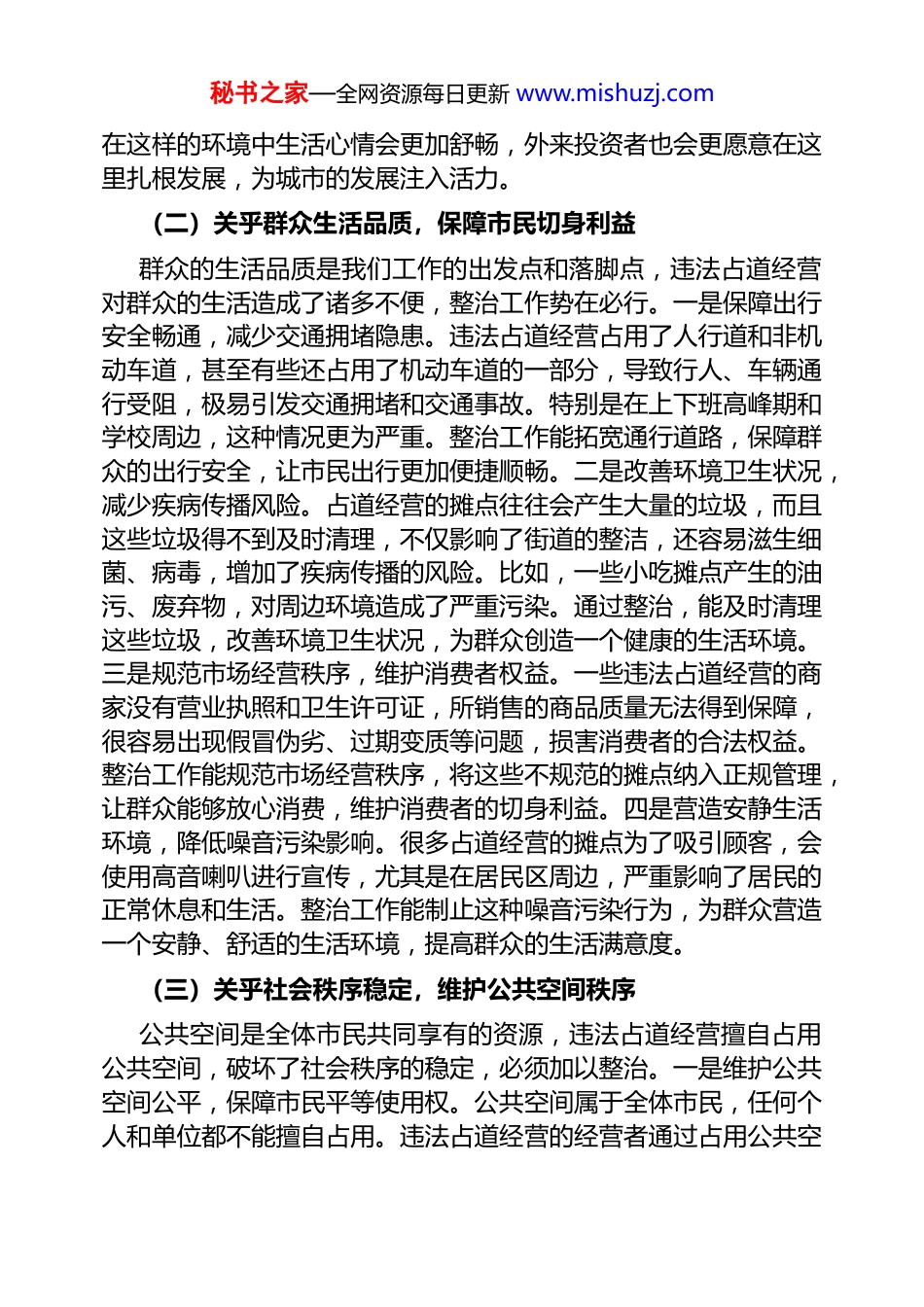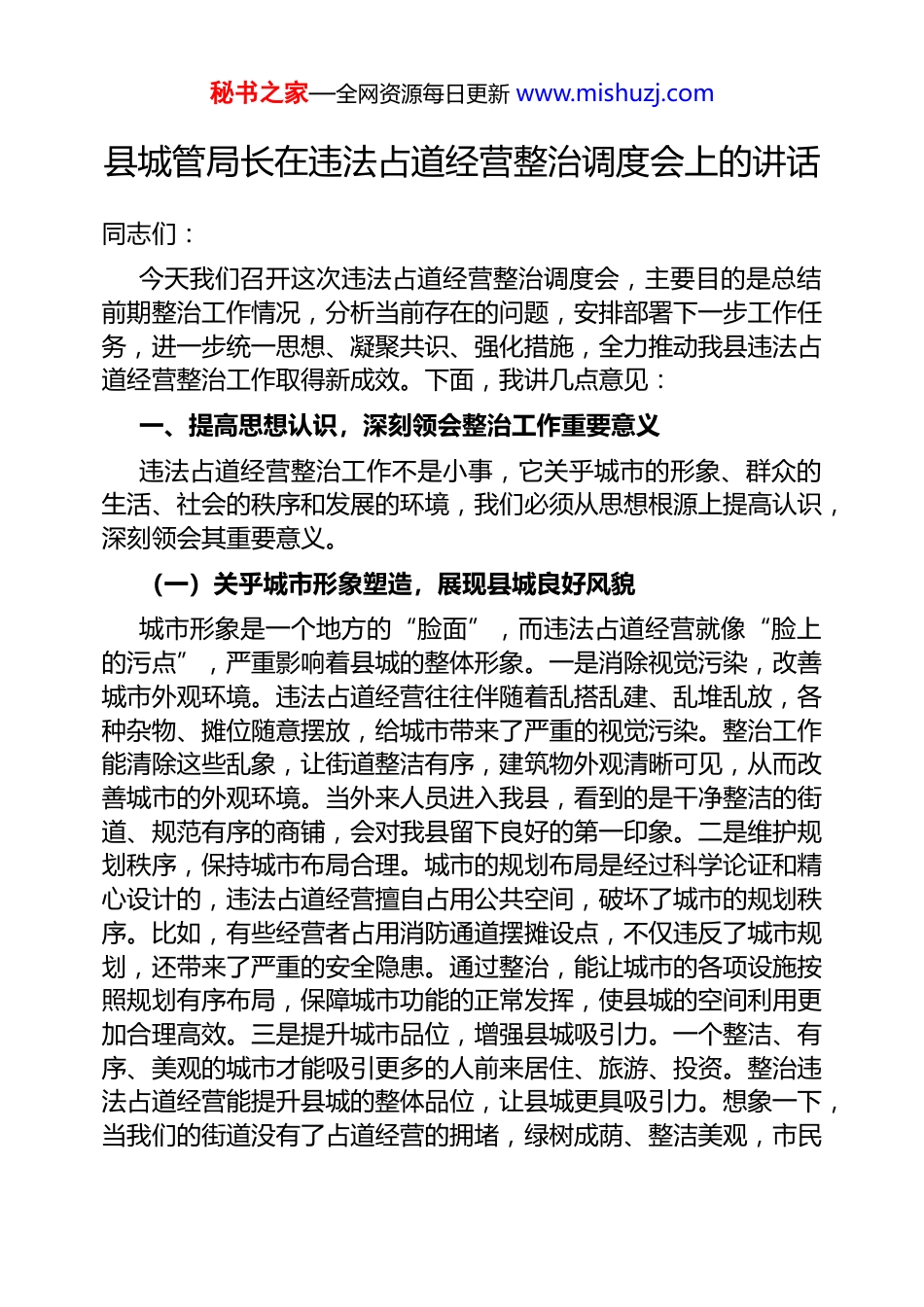 秘书之家—全网资源每日更新 www.mishuzj.com县城管局长在违法占道经营整治调度会上的讲话同志们:今天我们召开这次违法占道经营整治调度会,主要目的是总结前期整治工作情况,分析当前存在的问题,安排部署下一步工作任务,进一步统一思想、凝聚共识、强化措施,全力推动我县违法占道经营整治工作取得新成效。下面,我讲几点意见:一、提高思想认识,深刻领会整治工作重要意义违法占道经营整治工作不是小事,它关乎城市的形象、群众的生活、社会的秩序和发展的环境,我们必须从思想根源上提高认识,深刻领会其重要意义。(一)关乎城市形象塑造,展现县城良好风貌城市形象是一个地方的“脸面”,而违法占道经营就像“脸上的污点”,严重影响着县城的整体形象。一是消除视觉污染,改善城市外观环境。违法占道经营往往伴随着乱搭乱建、乱堆乱放,各种杂物、摊位随意摆放,给城市带来了严重的视觉污染。整治工作能清除这些乱象,让街道整洁有序,建筑物外观清晰可见,从而改善城市的外观环境。当外来人员进入我县,看到的是干净整洁的街道、规范有序的商铺,会对我县留下良好的第一印象。二是维护规划秩序,保持城市布局合理。城市的规划布局是经过科学论证和精心设计的,违法占道经营擅自占用公共空间,破坏了城市的规划秩序。比如,有些经营者占用消防通道摆摊设点,不仅违反了城市规划,还带来了严重的安全隐患。通过整治,能让城市的各项设施按照规划有序布局,保障城市功能的正常发挥,使县城的空间利用更加合理高效。三是提升城市品位,增强县城吸引力。一个整洁、有序、美观的城市才能吸引更多的人前来居住、旅游、投资。整治违法占道经营能提升县城的整体品位,让县城更具吸引力。想象一下,当我们的街道没有了占道经营的拥堵,绿树成荫、整洁美观,市民秘书之家—全网资源每日更新 www.mishuzj.com在这样的环境中生活心情会更加舒畅,外来投资者也会更愿意在这里扎根发展,为城市的发展注入活力。(二)关乎群众生活品质,保障市民切身利益群众的生活品质是我们工作的出发点和落脚点,违法占道经营对群众的生活造成了诸多不便,整治工作势在必行。一是保障出行安全畅通,减少交通拥堵隐患。违法占道经营占用了人行道和非机动车道,甚至有些还占用了机动车道的一部分,导致行人、车辆通行受阻,极易引发交通拥堵和交通事故。特别是在上下班高峰期和学校周边,这种情况更为严重。整治工作能拓宽通行道路,保障群众的出行安全,让市民出行更加便捷顺畅。二是改善环境卫生状况,减少疾病传播风险。占道经营的摊点往往会产生大量的垃圾,而且这些垃圾得不到及时清理,不仅影响了街道的整洁,还容易滋生细菌、病毒,增加了疾病传播的风险。比如,一些小吃摊点产生的油污、废弃物,对周边环境造成了严重污染。通过整治,能及时清理这些垃圾,改善环境卫生状况,为群众创造一个健康的生活环境。三是规范市场经营秩序,维护消费者权益。一些违法占道经营的商家没有营业执照和卫生许可证,所销售的商品质量无法得到保障,很容易出现假冒伪劣、过期变质等问题,损害消费者的合法权益。整治工作能规范市场经营秩序,将这些不规范的摊点纳入正规管理,让群众能够放心消费,维护消费者的切身利益。四是营造安静生活环境,降低噪音污染影响。很多占道经营的摊点为了吸引顾客,会使用高音喇叭进行宣传,尤其是在居民区周边,严重影响了居民的正常休息和生活。整治工作能制止这种噪音污染行为,为群众营造一个安静、舒适的生活环境,提高群众的生活满意度。(三)关乎社会秩序稳定,维护公共空间秩序公共空间是全体市民共同享有的资源,违法占道经营擅自占用公共空间,破坏了社会秩序的稳定,必须加以整治。一是维护公共空间公平,保障市民平等使用权。公共空间属于全体市民,任何个人和单位都不能擅自占用。违法占道经营的经营者通过占用公共空秘书之家—全网资源每日更新 www.mishuzj.com间获取利益,侵犯了其他市民平等使用公共空间的权利。整治工作能收回被占用的公共空间,让全体市民都能平等地享受公共空间带来的便利,维护社会的公平正义。二是减少矛盾纠纷发生,营造和谐社会氛围...