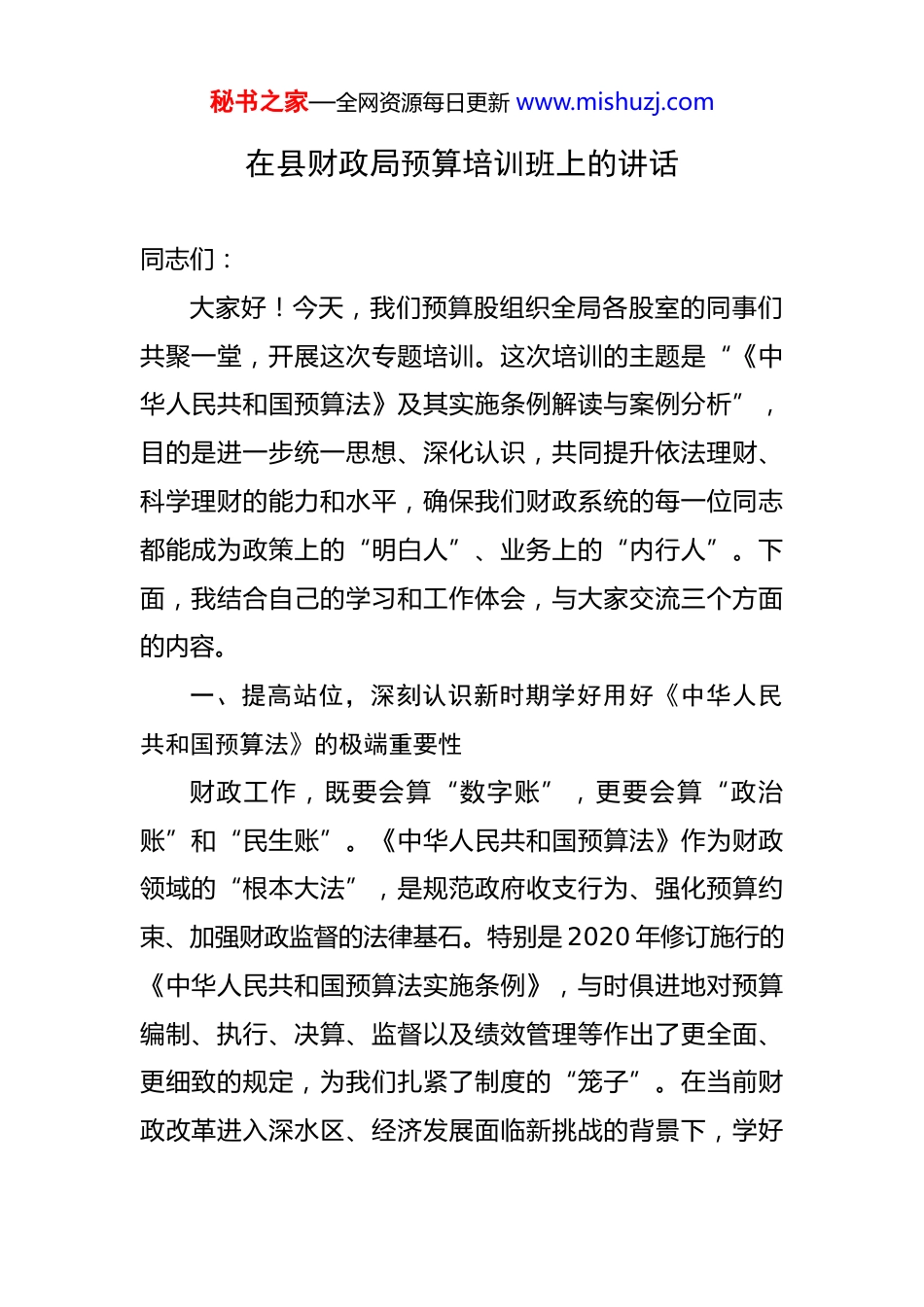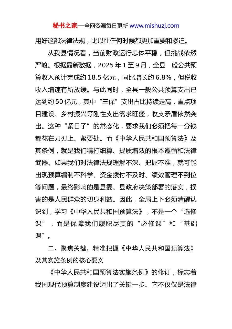 秘书之家—全网资源每日更新 www.mishuzj.com在县财政局预算培训班上的讲话 同志们:大家好!今天,我们预算股组织全局各股室的同事们共聚一堂,开展这次专题培训。这次培训的主题是“《中华人民共和国预算法》及其实施条例解读与案例分析”,目的是进一步统一思想、深化认识,共同提升依法理财、科学理财的能力和水平,确保我们财政系统的每一位同志都能成为政策上的“明白人”、业务上的“内行人”。下面,我结合自己的学习和工作体会,与大家交流三个方面的内容。一、提高站位,深刻认识新时期学好用好《中华人民共和国预算法》的极端重要性财政工作,既要会算“数字账”,更要会算“政治账”和“民生账”。《中华人民共和国预算法》作为财政领域的“根本大法”,是规范政府收支行为、强化预算约束、加强财政监督的法律基石。特别是 2020 年修订施行的《中华人民共和国预算法实施条例》,与时俱进地对预算编制、执行、决算、监督以及绩效管理等作出了更全面、更细致的规定,为我们扎紧了制度的“笼子”。在当前财政改革进入深水区、经济发展面临新挑战的背景下,学好秘书之家—全网资源每日更新 www.mishuzj.com用好这部法律法规,比以往任何时候都更加重要和紧迫。从我县情况看,当前财政运行总体平稳,但挑战依然严峻。根据最新数据,2025 年 1 至 9 月,全县一般公共预算收入预计完成约 18.5 亿元,同比增长约 6.8%,但税收收入增速有所放缓。与此同时,全县一般公共预算支出已达到约 50 亿元,其中“三保”支出占比持续走高,重点项目建设、乡村振兴等刚性支出需求旺盛,收支矛盾依然突出。这种“紧日子”的常态化,要求我们必须把每一分钱都花在刀刃上、紧要处。而《中华人民共和国预算法》及其条例,就是我们精打细算、提质增效的根本遵循和法律武器。如果我们对法律法规理解不深、把握不准,就可能出现预算编制不科学、资金拨付不及时、绩效管理不到位等问题,最终影响的是县委、县政府决策部署的落实,损害的是人民群众的切身利益。因此,全局上下必须清醒认识到,学习《中华人民共和国预算法》,不是一个“选修课”,而是保障我们履职尽责的“必修课”和“基础课”。二、聚焦关键,精准把握《中华人民共和国预算法》及其实施条例的核心要义《中华人民共和国预算法实施条例》的修订,标志着我国现代预算制度建设迈出了关键一步。它不仅仅是法律秘书之家—全网资源每日更新 www.mishuzj.com条文的增加,更是理财观念的深刻变革。作为财政部门的工作人员,我们必须聚焦核心条款,把握精神实质,尤其要关注以下三个方面:一是从“粗放”到“精细”,全面提升预算编制的科学性。过去,有的部门预算编制存在“拍脑袋”“一刀切”的现象,项目支出和基本支出界限不清,导致预算和执行“两张皮”。新条例对此提出了更高要求。它强调预算编制必须“先有项目后有预算”,所有支出均需以项目形式纳入预算项目库管理。它细化了预算草案的编制时间、内容和依据,要求我们财政部门牵头组织对重大政策和项目开展事前绩效评估,将评估结果作为申请预算的必备条件。这背后体现的,是从“要钱”向“要事”的转变。我们财政干部不能再当简单的“账房先生”,而要成为政策的“参谋助手”。在审核部门预算时,不仅要看数字是否合规,更要问这笔钱要干什么事?能达到什么效果?是否符合我县经济社会发展的总体方向?正如局里培训时反复强调的,要深刻理解“资金背后是政策、是民心”。我们要通过科学、精细的预算编制,将有限的财力精准配置到全县发展的最关键领域和民生改善的最迫切需求上。二是从“重支”到“重管”,全程强化预算执行的严肃性。预算一经人大批准,就具有法律效力,任何单位和秘书之家—全网资源每日更新 www.mishuzj.com个人都不得随意调整。新条例进一步强化了预算执行的刚性约束。它明确了财政部门和预算单位在执行中的各自职责,厘清了国库资金拨付流程,严格规范了财政专户管理,严禁无预算、超预算或者随意调整预算支出。尤其值得我们注意的是,条例明确规定“不得在预算执行中,通过改变资金用途等方式,在本级政府预算支出科目之间调剂使用预算资...