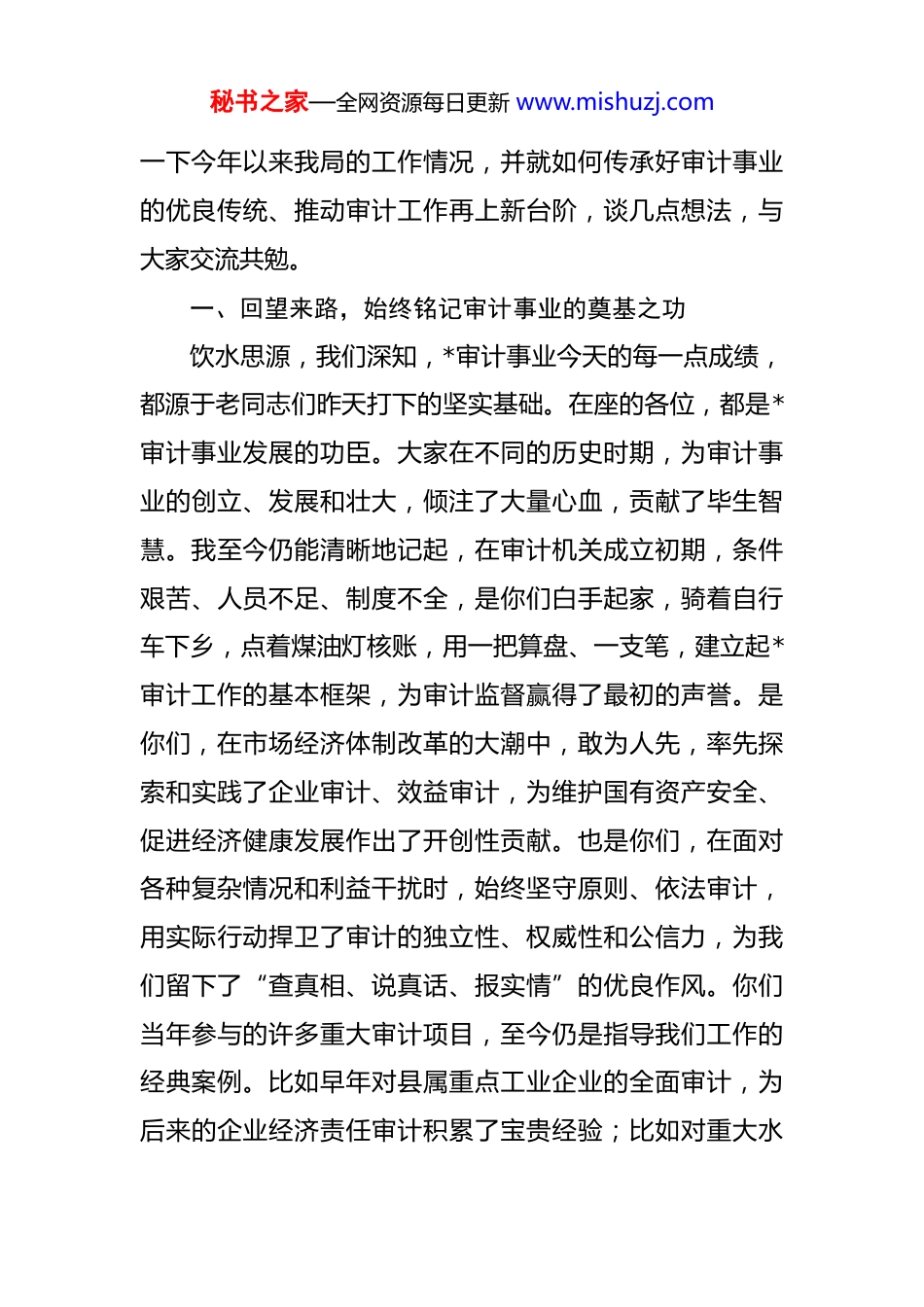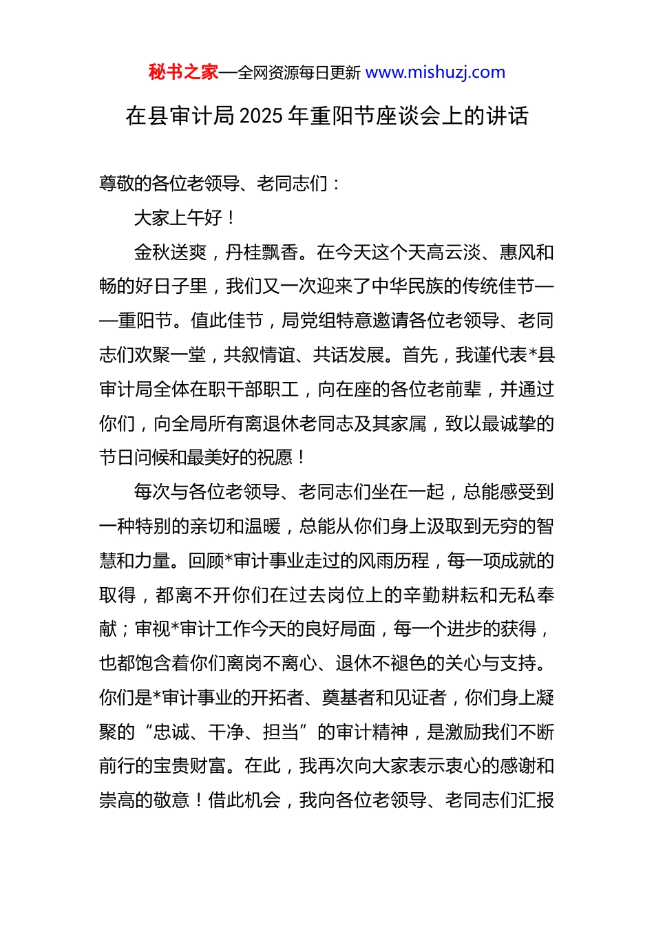 秘书之家—全网资源每日更新 www.mishuzj.com在县审计局 2025 年重阳节座谈会上的讲话 尊敬的各位老领导、老同志们:大家上午好!金秋送爽,丹桂飘香。在今天这个天高云淡、惠风和畅的好日子里,我们又一次迎来了中华民族的传统佳节——重阳节。值此佳节,局党组特意邀请各位老领导、老同志们欢聚一堂,共叙情谊、共话发展。首先,我谨代表*县审计局全体在职干部职工,向在座的各位老前辈,并通过你们,向全局所有离退休老同志及其家属,致以最诚挚的节日问候和最美好的祝愿!每次与各位老领导、老同志们坐在一起,总能感受到一种特别的亲切和温暖,总能从你们身上汲取到无穷的智慧和力量。回顾*审计事业走过的风雨历程,每一项成就的取得,都离不开你们在过去岗位上的辛勤耕耘和无私奉献;审视*审计工作今天的良好局面,每一个进步的获得,也都饱含着你们离岗不离心、退休不褪色的关心与支持。你们是*审计事业的开拓者、奠基者和见证者,你们身上凝聚的“忠诚、干净、担当”的审计精神,是激励我们不断前行的宝贵财富。在此,我再次向大家表示衷心的感谢和崇高的敬意!借此机会,我向各位老领导、老同志们汇报秘书之家—全网资源每日更新 www.mishuzj.com一下今年以来我局的工作情况,并就如何传承好审计事业的优良传统、推动审计工作再上新台阶,谈几点想法,与大家交流共勉。一、回望来路,始终铭记审计事业的奠基之功饮水思源,我们深知,*审计事业今天的每一点成绩,都源于老同志们昨天打下的坚实基础。在座的各位,都是*审计事业发展的功臣。大家在不同的历史时期,为审计事业的创立、发展和壮大,倾注了大量心血,贡献了毕生智慧。我至今仍能清晰地记起,在审计机关成立初期,条件艰苦、人员不足、制度不全,是你们白手起家,骑着自行车下乡,点着煤油灯核账,用一把算盘、一支笔,建立起*审计工作的基本框架,为审计监督赢得了最初的声誉。是你们,在市场经济体制改革的大潮中,敢为人先,率先探索和实践了企业审计、效益审计,为维护国有资产安全、促进经济健康发展作出了开创性贡献。也是你们,在面对各种复杂情况和利益干扰时,始终坚守原则、依法审计,用实际行动捍卫了审计的独立性、权威性和公信力,为我们留下了“查真相、说真话、报实情”的优良作风。你们当年参与的许多重大审计项目,至今仍是指导我们工作的经典案例。比如早年对县属重点工业企业的全面审计,为后来的企业经济责任审计积累了宝贵经验;比如对重大水秘书之家—全网资源每日更新 www.mishuzj.com利设施建设项目的跟踪审计,为今天的政府投资审计项目管理模式提供了重要借鉴。你们用青春和汗水,铸就了*审计的铮铮铁骨,书写了*审计的辉煌历史。这份沉甸甸的功绩,历史不会忘记,人民不会忘记,我们更不会忘记。二、立足当下,奋力谱写审计监督的服务新篇承前启后,继往开来。接过老同志们手中的“接力棒”,我们深感责任重大、使命光荣。今年以来,局党组团结带领全局干部职工,紧紧围绕县委、县政府的中心工作,依法全面履行审计监督职责,各项工作取得了新进展、新成效。截至今年 9 月底,全局共组织实施了 8 个审计项目,类型涵盖了财政预算执行审计、重大政策措施落实情况跟踪审计、领导干部经济责任审计、政府投资项目审计以及自然资源资产离任审计等多个领域。我们聚焦财政资金提质增效,对本级预算执行和决算草案进行了深入审计,促进财政资源优化配置;我们紧盯重大发展战略,对乡村振兴相关资金和项目开展了专项审计调查,确保惠民政策落地生根;我们着眼权力规范运行,完成了对 2 个重点部门主要领导的经济责任审计,推动领导干部履职尽责;我们守护绿水青山,对一个乡镇的党政主要领导开展了自然资源资产离任审计,助力生态文明建设。通过这些审计项目,我们累计促进财政增收节支和挽回损失超过秘书之家—全网资源每日更新 www.mishuzj.com8500 万元,向有关部门提出审计建议 40 余条,其中大部分已被采纳,形成了一批有分量、有影响的审计成果。例如,在对*县重大民生基础设施建设项目的审计中,我们不仅核减了工程造价近 300 万元,更重要的是,我们提出的关于优化...