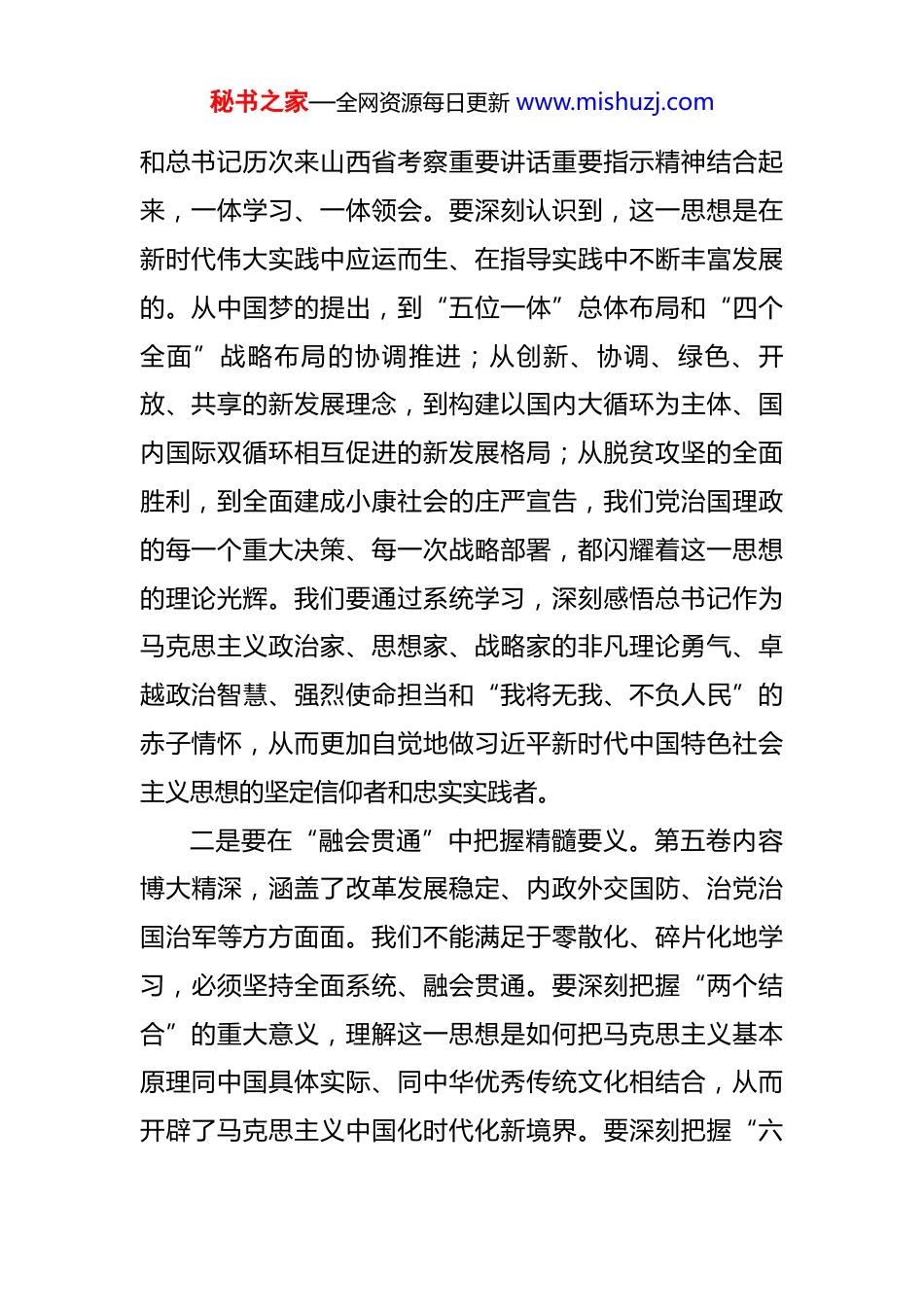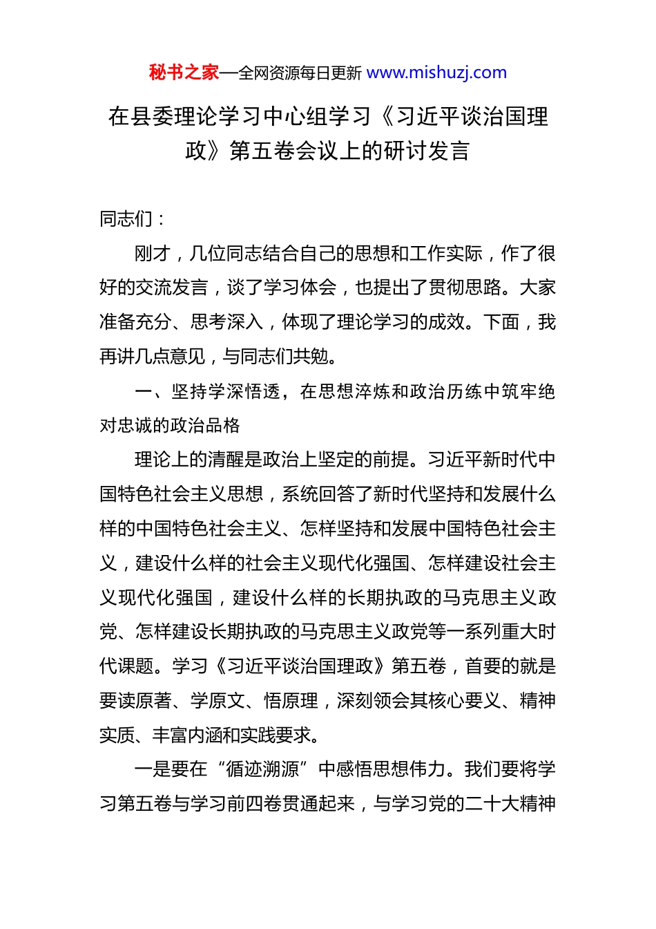 秘书之家—全网资源每日更新 www.mishuzj.com在县委理论学习中心组学习《习近平谈治国理政》第五卷会议上的研讨发言 同志们:刚才,几位同志结合自己的思想和工作实际,作了很好的交流发言,谈了学习体会,也提出了贯彻思路。大家准备充分、思考深入,体现了理论学习的成效。下面,我再讲几点意见,与同志们共勉。一、坚持学深悟透,在思想淬炼和政治历练中筑牢绝对忠诚的政治品格理论上的清醒是政治上坚定的前提。习近平新时代中国特色社会主义思想,系统回答了新时代坚持和发展什么样的中国特色社会主义、怎样坚持和发展中国特色社会主义,建设什么样的社会主义现代化强国、怎样建设社会主义现代化强国,建设什么样的长期执政的马克思主义政党、怎样建设长期执政的马克思主义政党等一系列重大时代课题。学习《习近平谈治国理政》第五卷,首要的就是要读原著、学原文、悟原理,深刻领会其核心要义、精神实质、丰富内涵和实践要求。一是要在“循迹溯源”中感悟思想伟力。我们要将学习第五卷与学习前四卷贯通起来,与学习党的二十大精神秘书之家—全网资源每日更新 www.mishuzj.com和总书记历次来山西省考察重要讲话重要指示精神结合起来,一体学习、一体领会。要深刻认识到,这一思想是在新时代伟大实践中应运而生、在指导实践中不断丰富发展的。从中国梦的提出,到“五位一体”总体布局和“四个全面”战略布局的协调推进;从创新、协调、绿色、开放、共享的新发展理念,到构建以国内大循环为主体、国内国际双循环相互促进的新发展格局;从脱贫攻坚的全面胜利,到全面建成小康社会的庄严宣告,我们党治国理政的每一个重大决策、每一次战略部署,都闪耀着这一思想的理论光辉。我们要通过系统学习,深刻感悟总书记作为马克思主义政治家、思想家、战略家的非凡理论勇气、卓越政治智慧、强烈使命担当和“我将无我、不负人民”的赤子情怀,从而更加自觉地做习近平新时代中国特色社会主义思想的坚定信仰者和忠实实践者。二是要在“融会贯通”中把握精髓要义。第五卷内容博大精深,涵盖了改革发展稳定、内政外交国防、治党治国治军等方方面面。我们不能满足于零散化、碎片化地学习,必须坚持全面系统、融会贯通。要深刻把握“两个结合”的重大意义,理解这一思想是如何把马克思主义基本原理同中国具体实际、同中华优秀传统文化相结合,从而开辟了马克思主义中国化时代化新境界。要深刻把握“六秘书之家—全网资源每日更新 www.mishuzj.com个必须坚持”的世界观和方法论,特别是其中的人民至上、自信自立、守正创新、问题导向、系统观念和胸怀天下。这些立场观点方法,是我们在工作中发现问题、分析问题、解决问题的“金钥匙”。全县各级领导干部都要把自己摆进去、把职责摆进去、把工作摆进去,真正学出坚定信念、学出绝对忠诚、学出使命担当。三是要在“知行合一”中提高政治能力。理论学习的最终目的在于指导实践。衡量我们学习成效的根本标尺,是看我们是否能够不断提高政治判断力、政治领悟力、政治执行力。政治判断力,就是要善于从纷繁复杂的矛盾中把握政治逻辑,在大是大非面前保持清醒头脑,始终在政治立场、政治方向、政治原则、政治道路上同党中央保持高度一致。政治领悟力,就是要对“国之大者”了然于胸,深刻领会党中央的战略意图和决策部署,确保我们*的工作始终沿着总书记指引的正确方向前进。政治执行力,就是要把党中央的决策部署、省委常委的工作要求,不折不扣、雷厉风行地落到实处,做到令行禁止、政令畅通。通过学习,我们要更加深刻领悟“两个确立”的决定性意义,更加自觉地增强“四个意识”、坚定“四个自信”、做到“两个维护”,确保*的各项事业始终是党的事业的重要组成部分。秘书之家—全网资源每日更新 www.mishuzj.com二、聚焦发展要务,在实干担当和攻坚克难中开创高质量发展新局面学习贯彻新思想,最终要体现在推动高质量发展的实际成效上。当前,我们正处在 2025 年的最后一个季度,这也是“十四五”规划的收官之年。时间紧、任务重,我们必须切实把学习成果转化为谋划发展的正确思路、促进发展的政策举措、领导发展的实际能力,全力以赴抓好各项...
