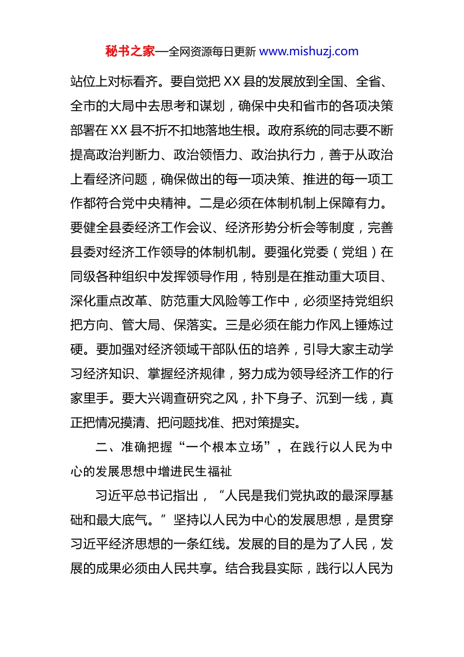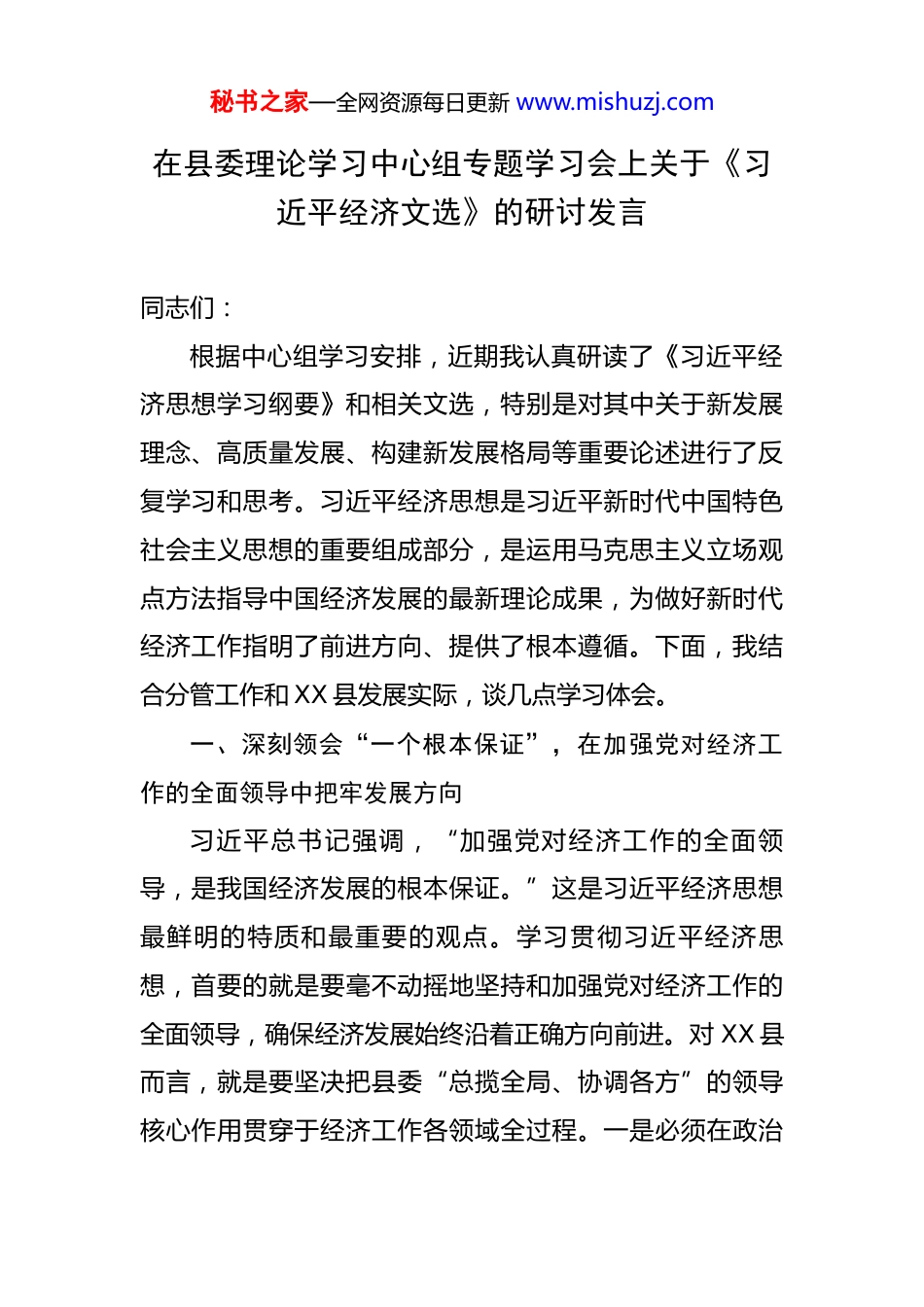 秘书之家—全网资源每日更新 www.mishuzj.com在县委理论学习中心组专题学习会上关于《习近平经济文选》的研讨发言 同志们:根据中心组学习安排,近期我认真研读了《习近平经济思想学习纲要》和相关文选,特别是对其中关于新发展理念、高质量发展、构建新发展格局等重要论述进行了反复学习和思考。习近平经济思想是习近平新时代中国特色社会主义思想的重要组成部分,是运用马克思主义立场观点方法指导中国经济发展的最新理论成果,为做好新时代经济工作指明了前进方向、提供了根本遵循。下面,我结合分管工作和 XX 县发展实际,谈几点学习体会。一、深刻领会“一个根本保证”,在加强党对经济工作的全面领导中把牢发展方向习近平总书记强调,“加强党对经济工作的全面领导,是我国经济发展的根本保证。”这是习近平经济思想最鲜明的特质和最重要的观点。学习贯彻习近平经济思想,首要的就是要毫不动摇地坚持和加强党对经济工作的全面领导,确保经济发展始终沿着正确方向前进。对 XX 县而言,就是要坚决把县委“总揽全局、协调各方”的领导核心作用贯穿于经济工作各领域全过程。一是必须在政治秘书之家—全网资源每日更新 www.mishuzj.com站位上对标看齐。要自觉把 XX 县的发展放到全国、全省、全市的大局中去思考和谋划,确保中央和省市的各项决策部署在 XX 县不折不扣地落地生根。政府系统的同志要不断提高政治判断力、政治领悟力、政治执行力,善于从政治上看经济问题,确保做出的每一项决策、推进的每一项工作都符合党中央精神。二是必须在体制机制上保障有力。要健全县委经济工作会议、经济形势分析会等制度,完善县委对经济工作领导的体制机制。要强化党委(党组)在同级各种组织中发挥领导作用,特别是在推动重大项目、深化重点改革、防范重大风险等工作中,必须坚持党组织把方向、管大局、保落实。三是必须在能力作风上锤炼过硬。要加强对经济领域干部队伍的培养,引导大家主动学习经济知识、掌握经济规律,努力成为领导经济工作的行家里手。要大兴调查研究之风,扑下身子、沉到一线,真正把情况摸清、把问题找准、把对策提实。二、准确把握“一个根本立场”,在践行以人民为中心的发展思想中增进民生福祉习近平总书记指出,“人民是我们党执政的最深厚基础和最大底气。”坚持以人民为中心的发展思想,是贯穿习近平经济思想的一条红线。发展的目的是为了人民,发展的成果必须由人民共享。结合我县实际,践行以人民为秘书之家—全网资源每日更新 www.mishuzj.com中心的发展思想,就是要聚焦群众最关心最直接最现实的利益问题,办好民生实事。一是要在促进共同富裕上持续用力。要坚持就业优先,支持多渠道灵活就业,确保零就业家庭动态清零。要大力发展县域富民产业,完善利益联结机制,让更多群众在家门口实现增收致富。要健全社会保障体系,兜住、兜准、兜牢民生底线。二是要在提升公共服务品质上持续用力。要深入推进教育、医疗、养老等领域的改革,努力解决好群众“上好学、看好病、养好老”等急难愁盼问题。要加快补齐城乡基础设施短板,推进城乡基本公共服务均等化。三是要在创造优美生态环境上持续用力。要牢固树立和践行“绿水青山就是金山银山”的理念,协同推进降碳、减污、扩绿、增长,打好蓝天、碧水、净土保卫战,让优良生态环境成为人民幸福生活的增长点。三、深入贯彻“一个新发展理念”,在推动高质量发展中加快转型升级新发展理念是习近平经济思想的主要内容,是管全局、管根本、管长远的战略指引。创新、协调、绿色、开放、共享的发展理念,系统回答了关于发展的目的、动力、方式、路径等一系列理论和实践问题。当前,XX 县正处于传统动能减弱、新动能培育的关键时期,必须坚定不秘书之家—全网资源每日更新 www.mishuzj.com移用新发展理念引领发展行动。一是要以“创新”激活力。要把创新摆在发展的核心位置,大力实施创新驱动发展战略。要强化企业创新主体地位,支持企业建设研发平台,开展关键核心技术攻关。要优化人才发展环境,积极引进和培育高层次创新人才和团队。二是要以“协调”促均衡。要深入实施乡村振兴战略,促进城乡融合发展。...