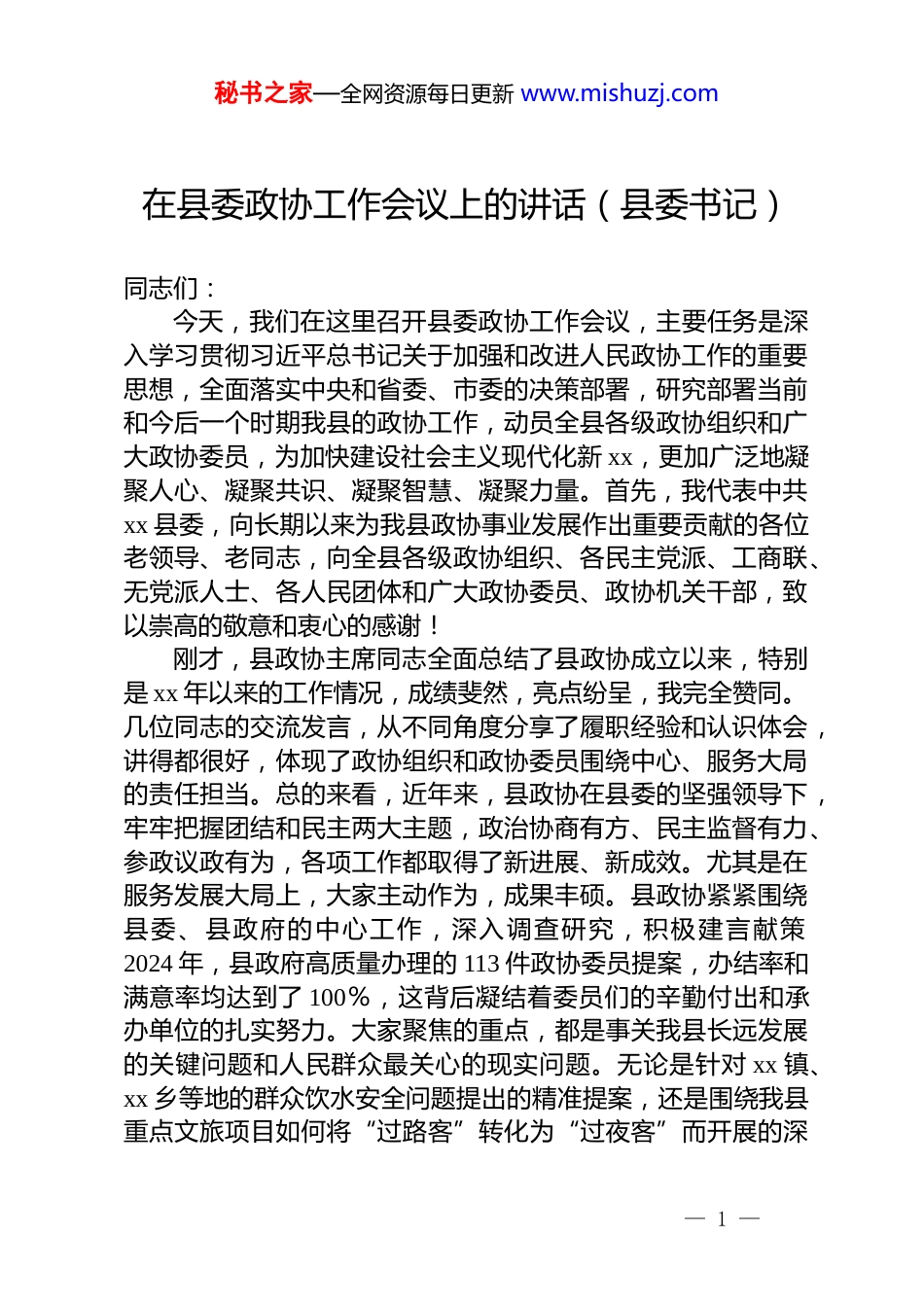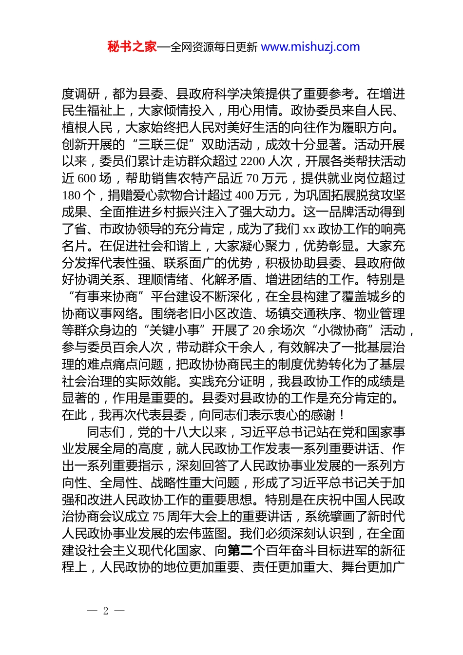 秘书之家—全网资源每日更新 www.mishuzj.com在县委政协工作会议上的讲话(县委书记)同志们:今天,我们在这里召开县委政协工作会议,主要任务是深入学习贯彻习近平总书记关于加强和改进人民政协工作的重要思想,全面落实中央和省委、市委的决策部署,研究部署当前和今后一个时期我县的政协工作,动员全县各级政协组织和广大政协委员,为加快建设社会主义现代化新 xx,更加广泛地凝聚人心、凝聚共识、凝聚智慧、凝聚力量。首先,我代表中共xx 县委,向长期以来为我县政协事业发展作出重要贡献的各位老领导、老同志,向全县各级政协组织、各民主党派、工商联、无党派人士、各人民团体和广大政协委员、政协机关干部,致以崇高的敬意和衷心的感谢!刚才,县政协主席同志全面总结了县政协成立以来,特别是 xx 年以来的工作情况,成绩斐然,亮点纷呈,我完全赞同。几位同志的交流发言,从不同角度分享了履职经验和认识体会,讲得都很好,体现了政协组织和政协委员围绕中心、服务大局的责任担当。总的来看,近年来,县政协在县委的坚强领导下,牢牢把握团结和民主两大主题,政治协商有方、民主监督有力、参政议政有为,各项工作都取得了新进展、新成效。尤其是在服务发展大局上,大家主动作为,成果丰硕。县政协紧紧围绕县委、县政府的中心工作,深入调查研究,积极建言献策2024 年,县政府高质量办理的 113 件政协委员提案,办结率和满意率均达到了 100%,这背后凝结着委员们的辛勤付出和承办单位的扎实努力。大家聚焦的重点,都是事关我县长远发展的关键问题和人民群众最关心的现实问题。无论是针对 xx 镇、xx 乡等地的群众饮水安全问题提出的精准提案,还是围绕我县重点文旅项目如何将“过路客”转化为“过夜客”而开展的深— 1 —秘书之家—全网资源每日更新 www.mishuzj.com度调研,都为县委、县政府科学决策提供了重要参考。在增进民生福祉上,大家倾情投入,用心用情。政协委员来自人民、植根人民,大家始终把人民对美好生活的向往作为履职方向。创新开展的“三联三促”双助活动,成效十分显著。活动开展以来,委员们累计走访群众超过 2200 人次,开展各类帮扶活动近 600 场,帮助销售农特产品近 70 万元,提供就业岗位超过180 个,捐赠爱心款物合计超过 400 万元,为巩固拓展脱贫攻坚成果、全面推进乡村振兴注入了强大动力。这一品牌活动得到了省、市政协领导的充分肯定,成为了我们 xx 政协工作的响亮名片。在促进社会和谐上,大家凝心聚力,优势彰显。大家充分发挥代表性强、联系面广的优势,积极协助县委、县政府做好协调关系、理顺情绪、化解矛盾、增进团结的工作。特别是“有事来协商”平台建设不断深化,在全县构建了覆盖城乡的协商议事网络。围绕老旧小区改造、场镇交通秩序、物业管理等群众身边的“关键小事”开展了 20 余场次“小微协商”活动,参与委员百余人次,带动群众千余人,有效解决了一批基层治理的难点痛点问题,把政协协商民主的制度优势转化为了基层社会治理的实际效能。实践充分证明,我县政协工作的成绩是显著的,作用是重要的。县委对县政协的工作是充分肯定的。在此,我再次代表县委,向同志们表示衷心的感谢!同志们,党的十八大以来,习近平总书记站在党和国家事业发展全局的高度,就人民政协工作发表一系列重要讲话、作出一系列重要指示,深刻回答了人民政协事业发展的一系列方向性、全局性、战略性重大问题,形成了习近平总书记关于加强和改进人民政协工作的重要思想。特别是在庆祝中国人民政治协商会议成立 75 周年大会上的重要讲话,系统擘画了新时代人民政协事业发展的宏伟蓝图。我们必须深刻认识到,在全面建设社会主义现代化国家、向第二个百年奋斗目标进军的新征程上,人民政协的地位更加重要、责任更加重大、舞台更加广— 2 —秘书之家—全网资源每日更新 www.mishuzj.com阔。当前,我们 xx 县正处在转型发展、跨越赶超的关键时期。外部环境的复杂性、严峻性、不确定性上升,我们自身也面临着产业结构优化升级、城乡区域协调发展、民生保障持续改善等多重任务。越是任务艰巨、挑战严峻,越需要我们把各...