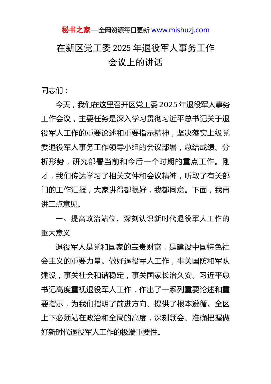 秘书之家—全网资源每日更新 www.mishuzj.com在新区党工委 2025 年退役军人事务工作会议上的讲话 同志们:今天,我们在这里召开区党工委 2025 年退役军人事务工作会议,主要任务是深入学习贯彻习近平总书记关于退役军人工作的重要论述和重要指示精神,坚决落实上级党委退役军人事务工作领导小组的会议部署,总结成绩、分析形势,研究部署当前和今后一个时期的重点工作。刚才,我们传达学习了相关文件和会议精神,听取了有关部门的工作汇报,大家讲得都很好,我都同意。下面,我再讲三点意见。一、提高政治站位,深刻认识新时代退役军人工作的重大意义退役军人是党和国家的宝贵财富,是建设中国特色社会主义的重要力量。做好退役军人工作,事关国防和军队建设,事关社会和谐稳定,事关国家长治久安。习近平总书记高度重视退役军人工作,作出了一系列重要论述和重要指示,为我们指明了前进方向、提供了根本遵循。全区上下必须站在政治和全局的高度,深刻领会、准确把握做好新时代退役军人工作的极端重要性。秘书之家—全网资源每日更新 www.mishuzj.com第一,这是践行“两个维护”的政治要求。做好退役军人工作,是检验我们政治判断力、政治领悟力、政治执行力的“试金石”。我们必须始终坚持党对退役军人工作的全面领导,将总书记的关心关怀转化为具体行动,把做好退役军人工作作为坚定拥护“两个确立”、坚决做到“两个维护”的现实检验。要不折不扣地推动中央和上级党委的决策部署在 XX 新区落地生根、开花结果,确保退役军人工作始终沿着正确政治方向前进。第二,这是服务强国兴军的战略支撑。“国无防不立,民无兵不安。”巩固国防和强大人民军队,离不开广大退役军人的无私奉献,也离不开坚实可靠的服务保障。做好退役军人工作,让军人成为全社会尊崇的职业,能够有效激励广大官兵安心服役、建功军营,吸引更多优秀青年投身国防,为实现建军一百年奋斗目标、开创国防和军队现代化新局面提供有力支撑。我们必须把这项工作摆在更加突出的位置,以服务保障的“暖色调”彰显强国兴军的“主色调”。第三,这是传承红色基因的时代使命。XX 新区是一片有着光荣革命传统的红色热土。无数革命先辈在这里抛头颅、洒热血,铸就了不朽的精神丰碑。退役军人身上,传承着人民军队的光荣传统和优良作风。我们要充分用好本秘书之家—全网资源每日更新 www.mishuzj.com地丰富的红色资源,深化革命传统和理想信念教育,引导广大退役军人“退役不褪色、退伍不褪志”,激励他们永葆军人本色,在新的岗位上继续发光发热,让红色基因在新时代绽放出更加璀璨的光芒。二、聚焦核心任务,精准施策推动退役军人工作高质量发展做好退役军人工作,必须坚持问题导向、需求导向,聚焦广大退役军人最关心、最直接、最现实的利益问题,用心用情用力解决他们的“急难愁盼”。今年,区党工委、管委会下定决心,将退役军人事务工作经费纳入财政重点保障范畴,全年共计安排专项预算 1.28 亿元,统筹用于就业安置、创业扶持、医疗保障、住房安居、技能提升、优抚抚恤等六大核心领域。我们要管好用好这笔资金,确保每一分钱都花在刀刃上,真正把好事办好、实事办实。一是以“安置优”为基础,筑牢就业保障的“压舱石”。就业是民生之本,也是退役军人安身立命之基。我们要将退役军人就业安置作为重中之重,动用 0.68 亿元专项资金,多措并举拓宽就业渠道。今年,我们的目标是实现就业安置率不低于 95%。为此,要重点抓好两项工作:一是“协议稳就业”,要深化与本地重点企业、重大项目秘书之家—全网资源每日更新 www.mishuzj.com的合作,建立“退役军人就业合作单位名录”,力争全年签订“退役军人就业协议书”2000 份以上,为他们提供一批高质量、高稳定性的就业岗位。二是“招聘促就业”,要提升招聘活动的精准度和实效性,全年计划开展线上线下相结合的“退役军人专场招聘会”不少于 12 场,做到“月月有招聘、周周有信息”,打通就业服务“最后一公里”。二是以“创业兴”为引擎,打造事业发展的“助推器”。广大退役军人经过部队的淬炼,具备敢闯敢拼、纪律严明的优秀品质,是创业创新的生...