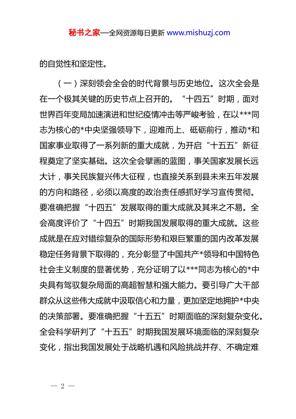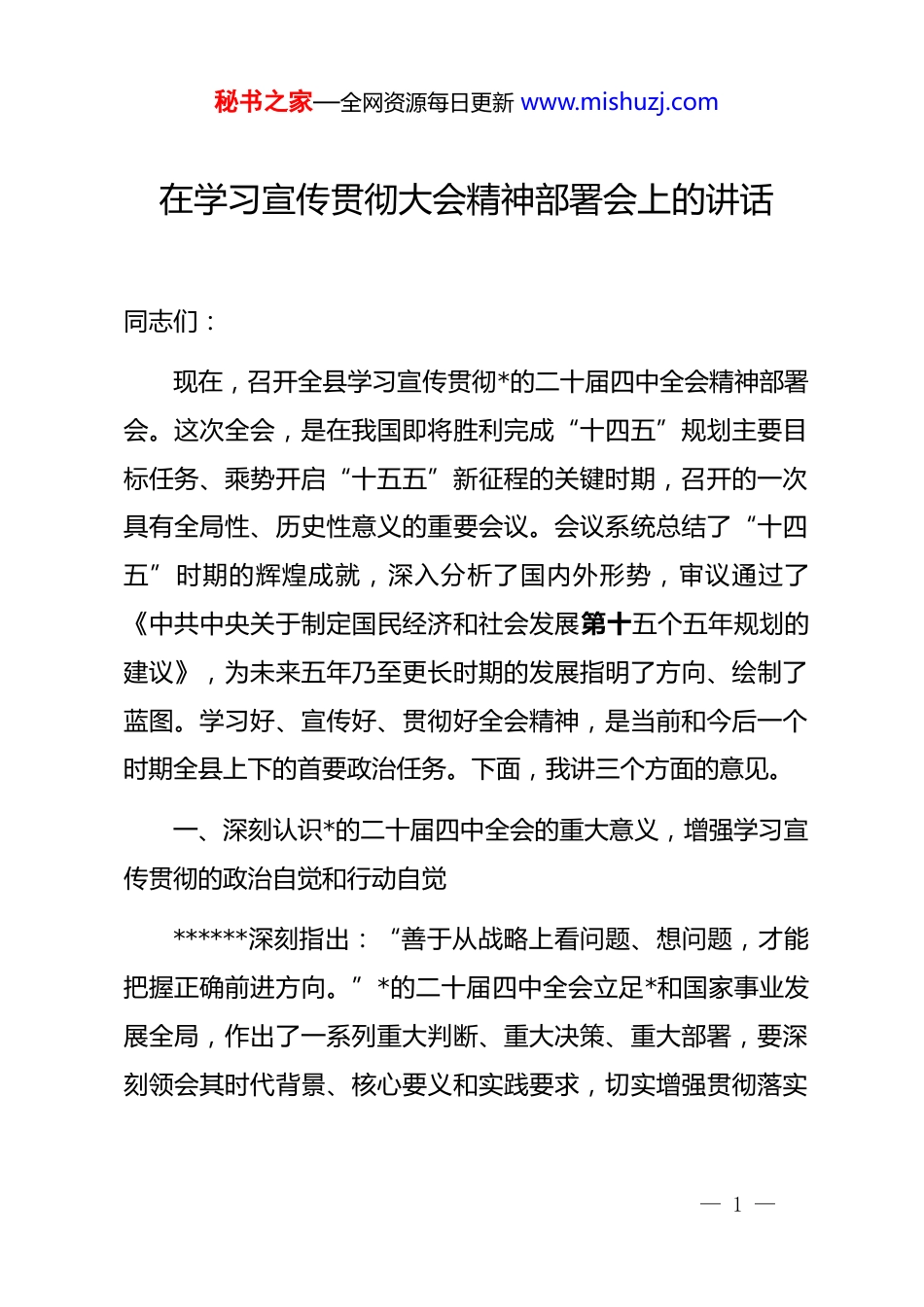 秘书之家—全网资源每日更新 www.mishuzj.com在学习宣传贯彻大会精神部署会上的讲话同志们:现在,召开全县学习宣传贯彻*的二十届四中全会精神部署会。这次全会,是在我国即将胜利完成“十四五”规划主要目标任务、乘势开启“十五五”新征程的关键时期,召开的一次具有全局性、历史性意义的重要会议。会议系统总结了“十四五”时期的辉煌成就,深入分析了国内外形势,审议通过了《中共中央关于制定国民经济和社会发展第十五个五年规划的建议》,为未来五年乃至更长时期的发展指明了方向、绘制了蓝图。学习好、宣传好、贯彻好全会精神,是当前和今后一个时期全县上下的首要政治任务。下面,我讲三个方面的意见。一、深刻认识*的二十届四中全会的重大意义,增强学习宣传贯彻的政治自觉和行动自觉******深刻指出:“善于从战略上看问题、想问题,才能把握正确前进方向。”*的二十届四中全会立足*和国家事业发展全局,作出了一系列重大判断、重大决策、重大部署,要深刻领会其时代背景、核心要义和实践要求,切实增强贯彻落实— 1 —秘书之家—全网资源每日更新 www.mishuzj.com的自觉性和坚定性。(一)深刻领会全会的时代背景与历史地位。这次全会是在一个极其关键的历史节点上召开的。“十四五”时期,面对世界百年变局加速演进和世纪疫情冲击等严峻考验,在以***同志为核心的*中央坚强领导下,迎难而上、砥砺前行,推动*和国家事业取得了一系列新的重大成就,为开启“十五五”新征程奠定了坚实基础。这次全会擘画的蓝图,事关国家发展长远大计,事关民族复兴伟大征程,也直接关系到县未来五年发展的方向和路径,必须以高度的政治责任感抓好学习宣传贯彻。要准确把握“十四五”发展取得的重大成就及其来之不易。全会高度评价了“十四五”时期我国发展取得的重大成就。这些成就是在应对错综复杂的国际形势和艰巨繁重的国内改革发展稳定任务背景下取得的,充分彰显了中国共产*领导和中国特色社会主义制度的显著优势,充分证明了以***同志为核心的*中央具有驾驭复杂局面的高超智慧和强大能力。要引导广大干部群众从这些伟大成就中汲取信心和力量,更加坚定地拥护*中央的决策部署。要准确把握“十五五”时期面临的深刻复杂变化。全会科学研判了“十五五”时期我国发展环境面临的深刻复杂变化,指出我国发展处于战略机遇和风险挑战并存、不确定难— 2 —秘书之家—全网资源每日更新 www.mishuzj.com预料因素增多的时期。既要看到我国经济长期向好的基本面没有变,制度优势、市场优势、产业体系优势、人才资源优势更加彰显;也要增强忧患意识,树立底线思维,做好应对各种风险挑战的充分准备。要准确把握全会在*和国家事业发展进程中的里程碑意义。这次全会对未来五年发展作出的顶层设计和战略擘画,是指导全面建设社会主义现代化国家的纲领性文件。它标志着在全面建成小康社会、实现第一个百年奋斗目标之后,意气风发地踏上了迈向基本实现社会主义现代化的新征程。深刻理解其历史地位,有助于更好地认清肩上的责任和使命。(二)准确把握全会的核心要义与精神实质。全会精神内涵丰富、思想深邃,必须抓住关键、学深悟透。******的重要讲话,是全会精神的集中体现和核心内容。《建议》通篇贯穿着**************思想,是指导“十五五”发展的行动指南。要深刻理解“中国式现代化”这个中心任务。全会紧紧围绕“以中国式现代化全面推进中华民族伟大复兴”这一中心任务进行部署。要深刻把握中国式现代化的中国特色、本质要求和重大原则,理解其与“十五五”规划的内在联系,明确未来五年推进中国式现代化的战略重点和主攻方向。要深刻理解高质量发展这个首要任务。全会强调“十五五”时期经济社会发展— 3 —秘书之家—全网资源每日更新 www.mishuzj.com要以推动高质量发展为主题。要准确把握《建议》中关于建设现代化产业体系、加快高水平科技自立自强、建设强大国内市场、促进区域协调发展等一系列推动高质量发展的重大举措。要深刻理解全面深化改革这个根本动力。全会强调“十五五”时期要坚持全面深化改革,为高质量发展注入强大动力。要理解进一步全面深化改革的重要性,特别...