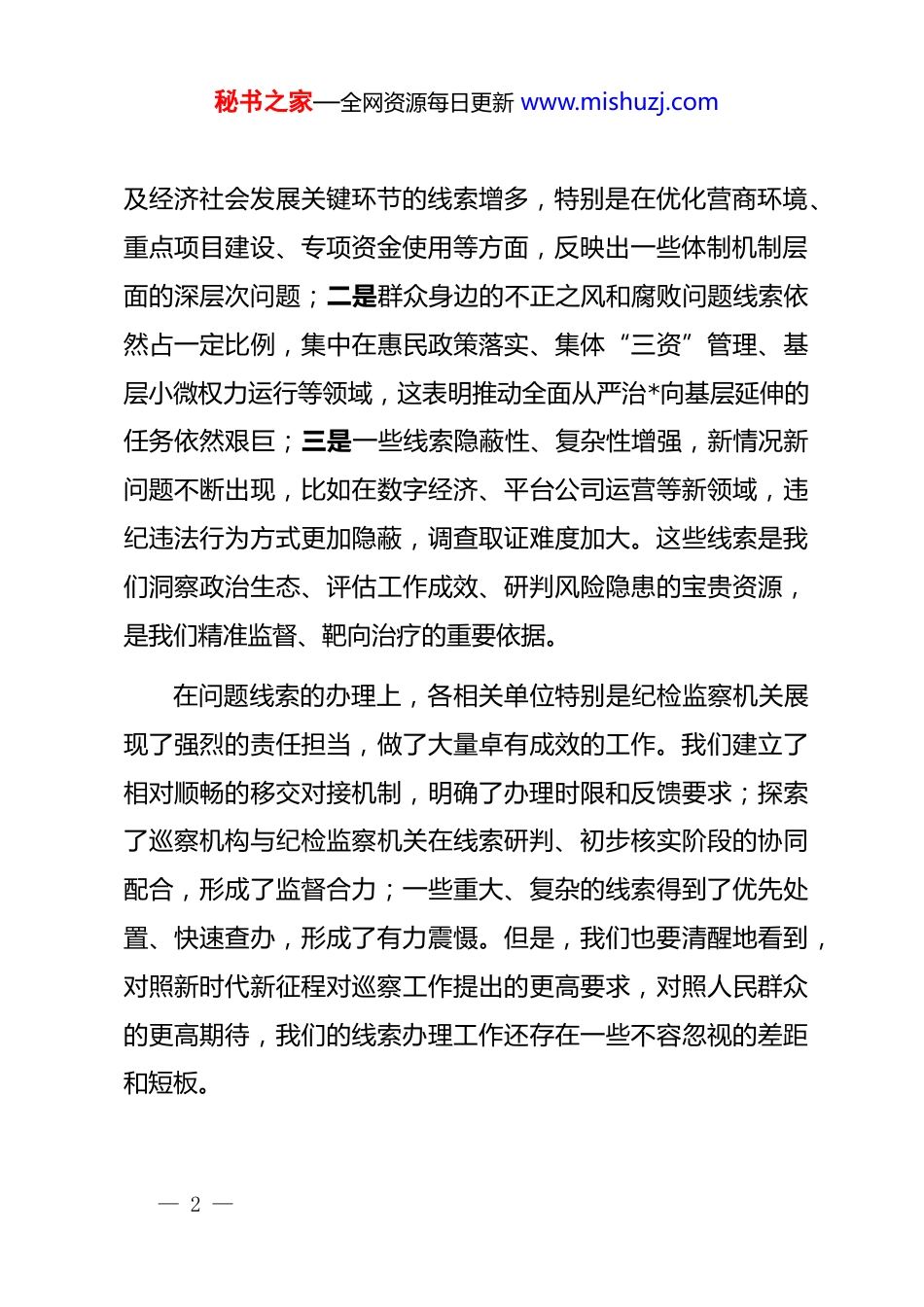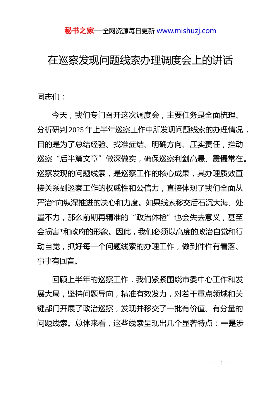 秘书之家—全网资源每日更新 www.mishuzj.com在巡察发现问题线索办理调度会上的讲话同志们:今天,我们专门召开这次调度会,主要任务是全面梳理、分析研判 2025 年上半年巡察工作中所发现问题线索的办理情况,目的是为了总结经验、找准症结、明确方向、压实责任,推动巡察“后半篇文章”做深做实,确保巡察利剑高悬、震慑常在。巡察发现的问题线索,是巡察工作的核心成果,其办理质效直接关系到巡察工作的权威性和公信力,直接体现了我们全面从严治*向纵深推进的决心和力度。如果线索移交后石沉大海、处置不力,那么前期再精准的“政治体检”也会失去意义,甚至会损害*和政府的形象。因此,我们必须以高度的政治自觉和行动自觉,抓好每一个问题线索的办理工作,做到件件有着落、事事有回音。回顾上半年的巡察工作,我们紧紧围绕市委中心工作和发展大局,坚持问题导向,精准有效发力,对若干重点领域和关键部门开展了政治巡察,发现并移交了一批有价值、有分量的问题线索。总体来看,这些线索呈现出几个显著特点:一是涉— 1 —秘书之家—全网资源每日更新 www.mishuzj.com及经济社会发展关键环节的线索增多,特别是在优化营商环境、重点项目建设、专项资金使用等方面,反映出一些体制机制层面的深层次问题;二是群众身边的不正之风和腐败问题线索依然占一定比例,集中在惠民政策落实、集体“三资”管理、基层小微权力运行等领域,这表明推动全面从严治*向基层延伸的任务依然艰巨;三是一些线索隐蔽性、复杂性增强,新情况新问题不断出现,比如在数字经济、平台公司运营等新领域,违纪违法行为方式更加隐蔽,调查取证难度加大。这些线索是我们洞察政治生态、评估工作成效、研判风险隐患的宝贵资源,是我们精准监督、靶向治疗的重要依据。在问题线索的办理上,各相关单位特别是纪检监察机关展现了强烈的责任担当,做了大量卓有成效的工作。我们建立了相对顺畅的移交对接机制,明确了办理时限和反馈要求;探索了巡察机构与纪检监察机关在线索研判、初步核实阶段的协同配合,形成了监督合力;一些重大、复杂的线索得到了优先处置、快速查办,形成了有力震慑。但是,我们也要清醒地看到,对照新时代新征程对巡察工作提出的更高要求,对照人民群众的更高期待,我们的线索办理工作还存在一些不容忽视的差距和短板。— 2 —秘书之家—全网资源每日更新 www.mishuzj.com部分线索的办理进度不尽如人意,存在“中梗阻”现象。有些线索在移交后,停留在初步分析阶段,未能及时转入实质性的核查环节;有些线索在多个部门或科室之间流转,沟通协调成本高,导致办理周期拉长;个别单位对巡察移交线索的重视程度存在“上热下冷”的情况,紧迫感不强,主动出击意识不够。线索办理的质量和深度有待进一步提升。有的核查工作满足于就事论事,未能做到深挖一层、扩线排查,未能透过业务问题发现背后的政治责任、纪律作风问题;有的满足于对个别具体问题的处理,未能举一反三,推动所在领域或系统的综合治理;有的在定性把握上不够精准,存在简单化处理的倾向。成果运用的“乘数效应”尚未充分释放。问题线索办理的最终目的不仅仅是处理几个人、追回几笔钱,更重要的是通过剖析个案,查找制度漏洞,推动完善治理。目前,我们在将线索办理成果转化为警示教育资源、转化为制度规范建设、转化为深化改革动力的方面,做得还不够系统、不够深入,“惩、治、防”有机结合的链条有待进一步贯通。这些问题,必须引起我们高度重视,深刻反思,并在下一步工作中采取有力措施,切实加以解决。做好巡察发现问题线索的办理工作,是一项严肃的政治任务,考验的是我们的政治— 3 —秘书之家—全网资源每日更新 www.mishuzj.com判断力、政治领悟力、政治执行力。我们必须认识到,每一份问题线索都承载着组织的信任和群众的重托,拖延办理、敷衍办理,就是对*和人民的不负责任。我们要在提升线索办理的精准性上持续下功夫。精准是做好一切工作的前提。对于巡察移交的线索,不能“一刀切”,必须进行精细化的分类处置。要建立更加科学的线索评估机制,由纪检监察机关会同巡察办和相关专业部门,对线索的可查性...