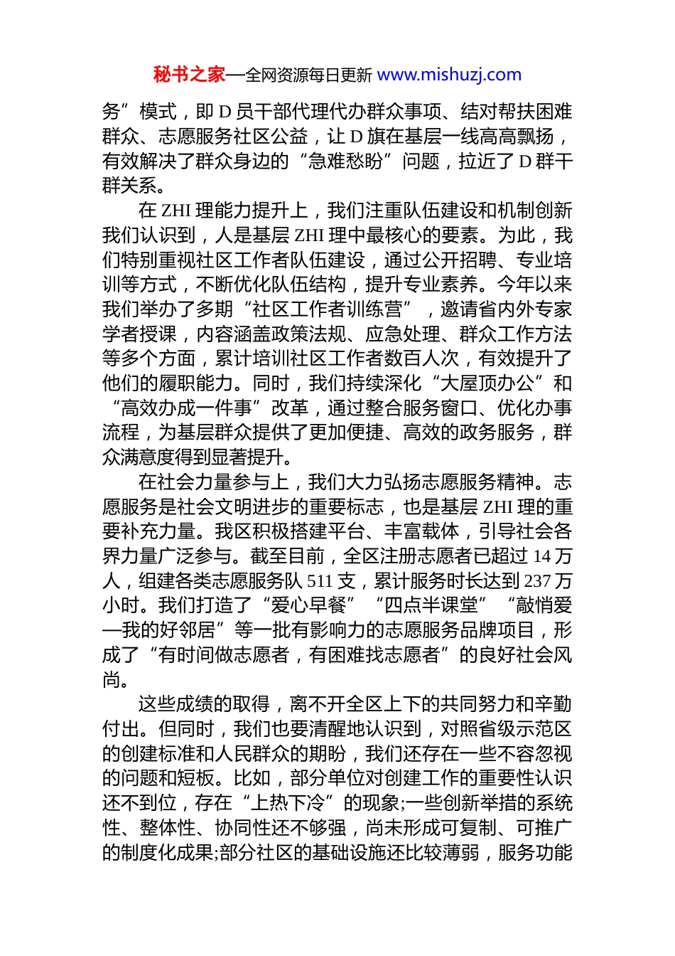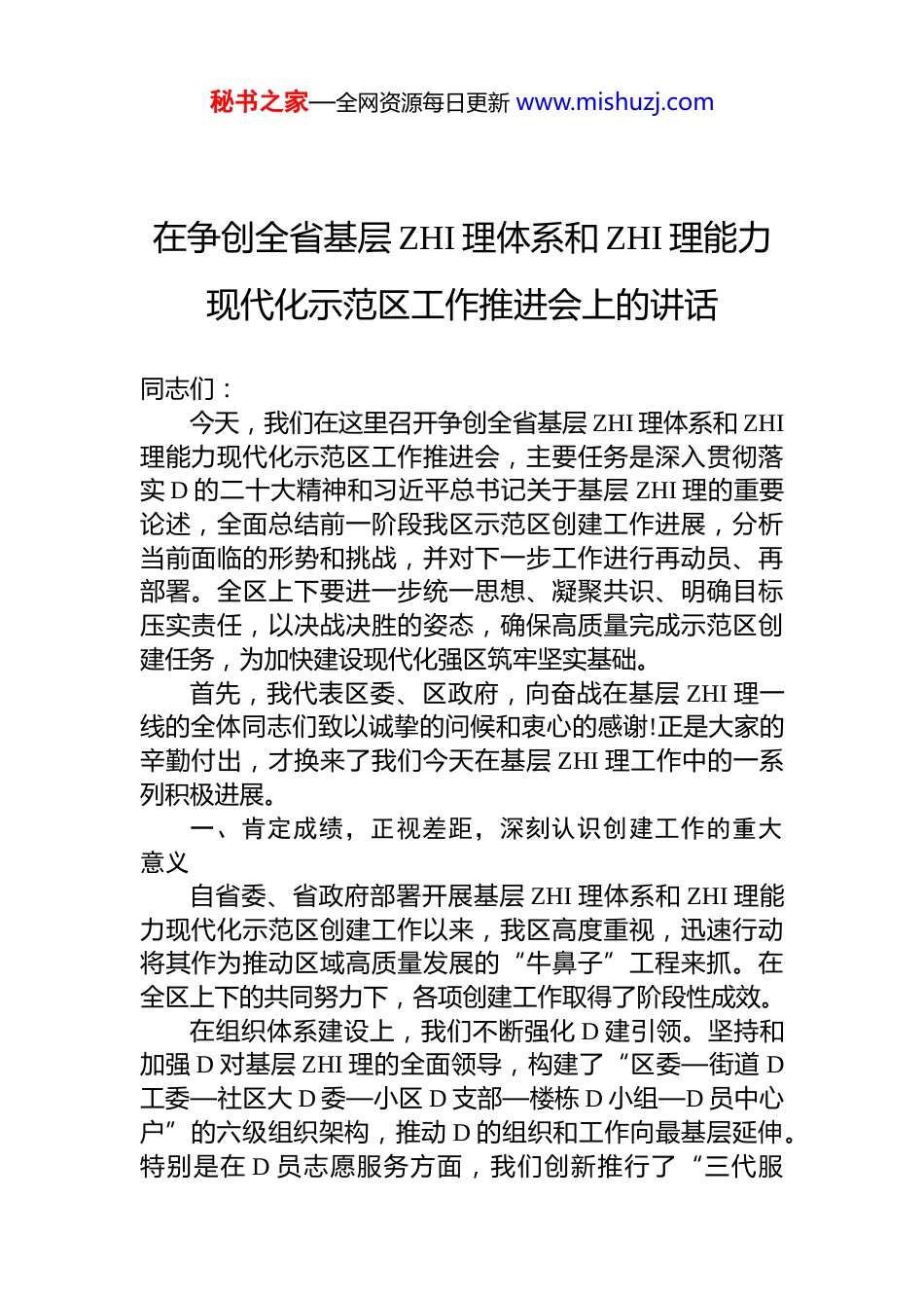 秘书之家—全网资源每日更新 www.mishuzj.com在争创全省基层 ZHI 理体系和 ZHI 理能力现代化示范区工作推进会上的讲话同志们:今天,我们在这里召开争创全省基层 ZHI 理体系和 ZHI理能力现代化示范区工作推进会,主要任务是深入贯彻落实 D 的二十大精神和习近平总书记关于基层 ZHI 理的重要论述,全面总结前一阶段我区示范区创建工作进展,分析当前面临的形势和挑战,并对下一步工作进行再动员、再部署。全区上下要进一步统一思想、凝聚共识、明确目标压实责任,以决战决胜的姿态,确保高质量完成示范区创建任务,为加快建设现代化强区筑牢坚实基础。首先,我代表区委、区政府,向奋战在基层 ZHI 理一线的全体同志们致以诚挚的问候和衷心的感谢!正是大家的辛勤付出,才换来了我们今天在基层 ZHI 理工作中的一系列积极进展。一、肯定成绩,正视差距,深刻认识创建工作的重大意义自省委、省政府部署开展基层 ZHI 理体系和 ZHI 理能力现代化示范区创建工作以来,我区高度重视,迅速行动将其作为推动区域高质量发展的“牛鼻子”工程来抓。在全区上下的共同努力下,各项创建工作取得了阶段性成效。在组织体系建设上,我们不断强化 D 建引领。坚持和加强 D 对基层 ZHI 理的全面领导,构建了“区委—街道 D工委—社区大 D 委—小区 D 支部—楼栋 D 小组—D 员中心户”的六级组织架构,推动 D 的组织和工作向最基层延伸。特别是在 D 员志愿服务方面,我们创新推行了“三代服秘书之家—全网资源每日更新 www.mishuzj.com务”模式,即 D 员干部代理代办群众事项、结对帮扶困难群众、志愿服务社区公益,让 D 旗在基层一线高高飘扬,有效解决了群众身边的“急难愁盼”问题,拉近了 D 群干群关系。在 ZHI 理能力提升上,我们注重队伍建设和机制创新我们认识到,人是基层 ZHI 理中最核心的要素。为此,我们特别重视社区工作者队伍建设,通过公开招聘、专业培训等方式,不断优化队伍结构,提升专业素养。今年以来我们举办了多期“社区工作者训练营”,邀请省内外专家学者授课,内容涵盖政策法规、应急处理、群众工作方法等多个方面,累计培训社区工作者数百人次,有效提升了他们的履职能力。同时,我们持续深化“大屋顶办公”和“高效办成一件事”改革,通过整合服务窗口、优化办事流程,为基层群众提供了更加便捷、高效的政务服务,群众满意度得到显著提升。在社会力量参与上,我们大力弘扬志愿服务精神。志愿服务是社会文明进步的重要标志,也是基层 ZHI 理的重要补充力量。我区积极搭建平台、丰富载体,引导社会各界力量广泛参与。截至目前,全区注册志愿者已超过 14 万人,组建各类志愿服务队 511 支,累计服务时长达到 237 万小时。我们打造了“爱心早餐”“四点半课堂”“敲悄爱—我的好邻居”等一批有影响力的志愿服务品牌项目,形成了“有时间做志愿者,有困难找志愿者”的良好社会风尚。这些成绩的取得,离不开全区上下的共同努力和辛勤付出。但同时,我们也要清醒地认识到,对照省级示范区的创建标准和人民群众的期盼,我们还存在一些不容忽视的问题和短板。比如,部分单位对创建工作的重要性认识还不到位,存在“上热下冷”的现象;一些创新举措的系统性、整体性、协同性还不够强,尚未形成可复制、可推广的制度化成果;部分社区的基础设施还比较薄弱,服务功能秘书之家—全网资源每日更新 www.mishuzj.com有待进一步完善;社会力量参与 ZHI 理的广度和深度还有待拓展,等等。这些问题,都需要我们在下一步工作中认真研究,采取有力措施加以解决。二、明确目标,突出重点,全力以赴推进示范区创建工作根据省委、省政府的统一部署,全省基层 ZHI 理体系和 ZHI 理能力现代化示范区创建工作为期三年,从 2024 年到 2026 年。我们的总体目标是:到 2026 年底,成功创建成为全省基层 ZHI 理体系和 ZHI 理能力现代化示范区,形成一批在全省乃至全国叫得响的“XX 经验”“XX 模式”。为了实现这一目标,我们必须紧紧围绕“强组织、强功能、强平台、强保障”的核心要求,聚焦重点领域和关键环节,精准发力、持续用力...