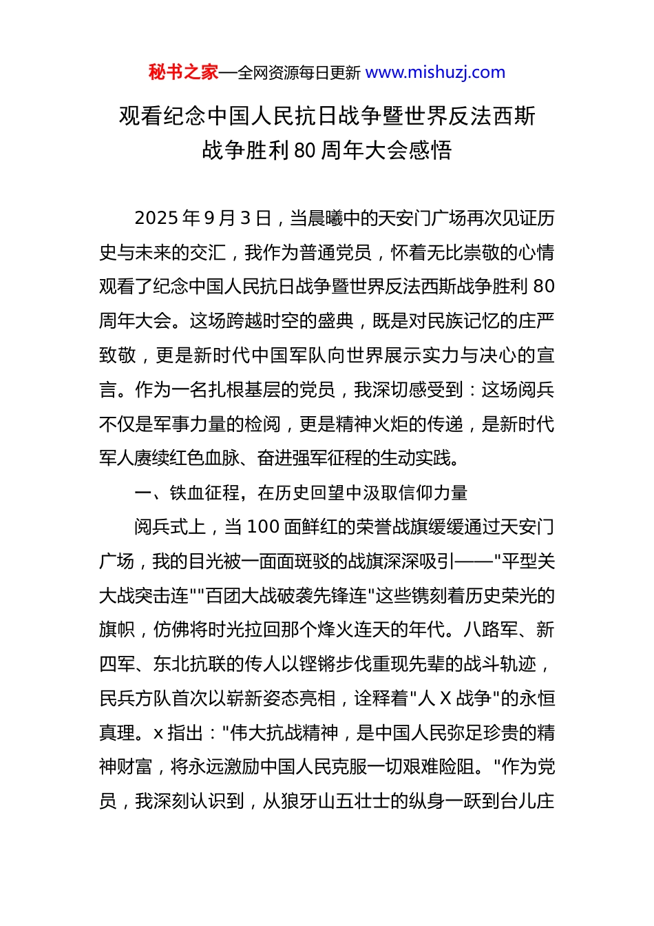 秘书之家—全网资源每日更新 www.mishuzj.com观看纪念中国人民抗日战争暨世界反法西斯战争胜利 80 周年大会感悟 2025 年 9 月 3 日,当晨曦中的天安门广场再次见证历史与未来的交汇,我作为普通党员,怀着无比崇敬的心情观看了纪念中国人民抗日战争暨世界反法西斯战争胜利 80周年大会。这场跨越时空的盛典,既是对民族记忆的庄严致敬,更是新时代中国军队向世界展示实力与决心的宣言。作为一名扎根基层的党员,我深切感受到:这场阅兵不仅是军事力量的检阅,更是精神火炬的传递,是新时代军人赓续红色血脉、奋进强军征程的生动实践。一、铁血征程,在历史回望中汲取信仰力量阅兵式上,当 100 面鲜红的荣誉战旗缓缓通过天安门广场,我的目光被一面面斑驳的战旗深深吸引——"平型关大战突击连""百团大战破袭先锋连"这些镌刻着历史荣光的旗帜,仿佛将时光拉回那个烽火连天的年代。八路军、新四军、东北抗联的传人以铿锵步伐重现先辈的战斗轨迹,民兵方队首次以崭新姿态亮相,诠释着"人 X 战争"的永恒真理。x 指出:"伟大抗战精神,是中国人民弥足珍贵的精神财富,将永远激励中国人民克服一切艰难险阻。"作为党员,我深刻认识到,从狼牙山五壮士的纵身一跃到台儿庄秘书之家—全网资源每日更新 www.mishuzj.com血战的悲壮坚守,中国共产党始终是中华民族的中流砥柱。这种精神,在今天的脱贫攻坚战场上、在基层工作最前沿、在科技攻关第一线,依然焕发着时代光芒。二、科技强军,在国之重器中见证制度优势当新型战略导弹方队以"巨浪"腾空之势震撼世界,当无人作战系统首次公开亮相,我深刻感受到新 x 代国防建设的铿锵步伐。这些国之重器,不仅是维护国家主权的"底气",更是 x 制度优势的生动注脚。从"两弹一星"到"嫦娥探月",从"辽宁舰"到"福建舰",党领导下的国防科技事业,始终践行着"自力更生、艰苦奋斗"的优良传统。值得注意的是,此次阅兵装备方队采用"群队联合、方队合成"的编组方式,体现了联合作战体系化建设的最新成果。正如受阅官兵所言:"每一枚导弹的精度提升,都是科研人员无数个日夜的坚守;每一架战机的完美编队,都是飞行员千百次训练的结晶。"作为党员,我们更要立足本职岗位,以"功成不必在我"的境界和"功成必定有我"的担当,在科技创新、产业升级等领域贡献智慧力量。三、精神传承,在平凡岗位上践行初心使命阅兵式上,观礼抗战老兵的出现令人动容。那些布满皱纹的手掌,依然保持着敬礼的刚毅;那些浑浊的双眼,依然闪烁着信仰的光芒。他们用一生诠释了"天下兴亡,匹秘书之家—全网资源每日更新 www.mishuzj.com夫有责"的担当。作为新 X 代党员,我们既要当好红色基因的传承者,更要成为奋斗精神的践行者。在乡村振兴的田间地头,在社区服务的基层一线,在教书育人的三尺讲台,每一个岗位都是传承精神的阵地。此次阅兵特别设置的民兵方队,正是"全民国防"理念的生动体现。作为基层党员,我深感责任重大:在今后的工作中,要像组织民兵训练那样,以"钉钉子"精神解决群众急难愁盼;要像指挥员制定作战计划那样,系统谋划基层治理创新;要像保障阅兵装备那样,精益求精做好每一项民生工程。四、面向未来,在复兴征程中凝聚奋进伟力这次阅兵,既是对历史的庄严致敬,更是对未来的郑重承诺。当国际社会看到中国军队的现代化水平,看到中国人民捍卫和平的坚定决心,我们更加深刻理解"和平需要实力来维护"的深刻内涵。面对百年变局加速演进,面对科技封锁、产业链重构等挑战,广大党员必须发扬"不畏强暴、血战到底"的英雄气概,在关键核心技术攻关中勇攀高峰,在构建新发展格局中敢为人先,在推进国家治理现代化中善作善成。特别值得关注的是,此次阅兵中出现的反无人装备方队,正是应对新型安全威胁的"中国方案",这启示我们:在数字化转型的今天,党员干部更要增强科技素养,以创新思维应对风险挑战。秘书之家—全网资源每日更新 www.mishuzj.com站在新的历史起点上,这场阅兵既是精神的丰碑,更是奋进的号角。作为普通党员,我们将以抗战精神为指引,把对历史的铭记转化为前进的动力,把对英烈的敬仰转化为实干的行动。在全面建设 x 的新征程...