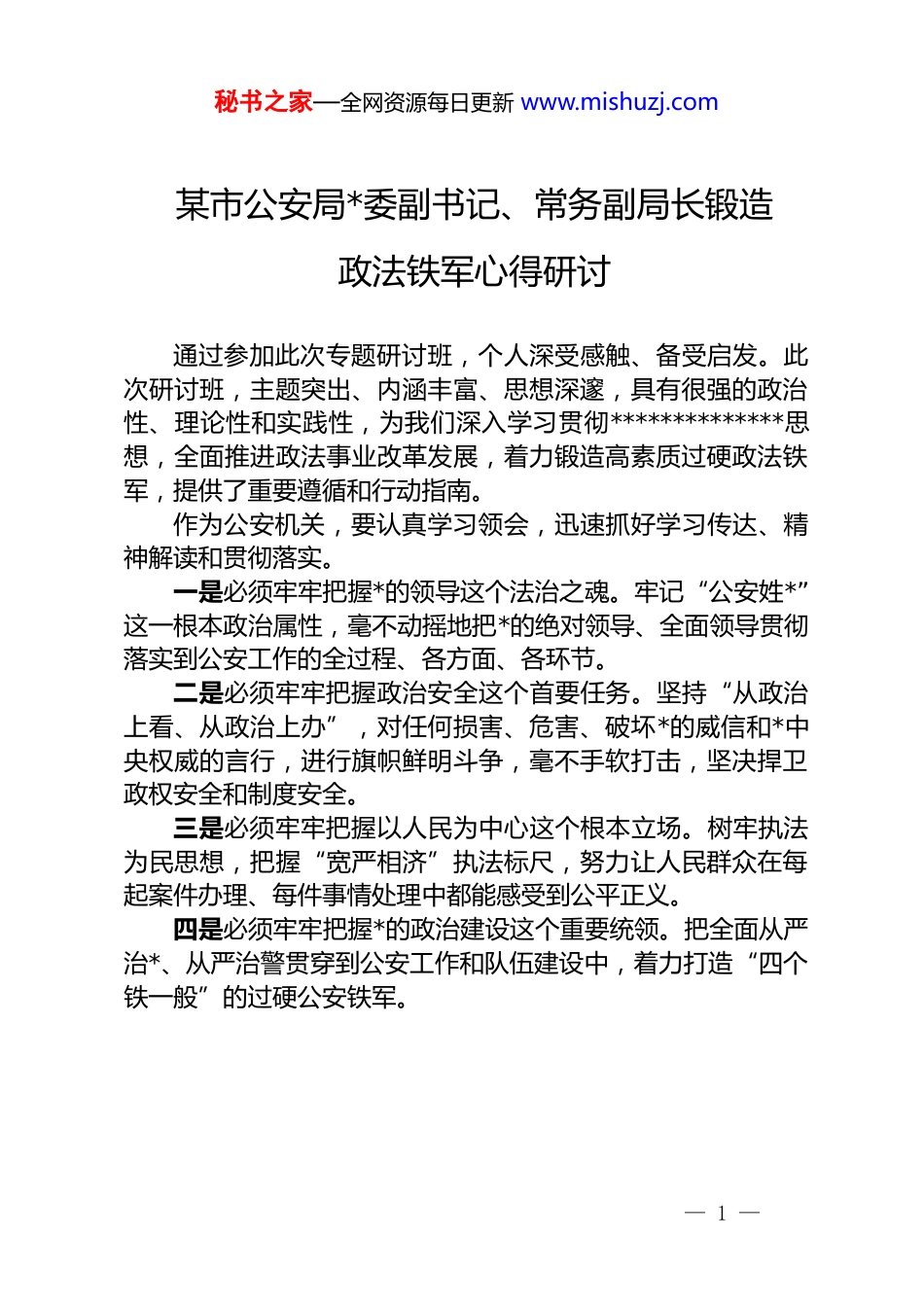 秘书之家—全网资源每日更新 www.mishuzj.com某市公安局*委副书记、常务副局长锻造政法铁军心得研讨通过参加此次专题研讨班,个人深受感触、备受启发。此次研讨班,主题突出、内涵丰富、思想深邃,具有很强的政治性、理论性和实践性,为我们深入学习贯彻**************思想,全面推进政法事业改革发展,着力锻造高素质过硬政法铁军,提供了重要遵循和行动指南。作为公安机关,要认真学习领会,迅速抓好学习传达、精神解读和贯彻落实。一是必须牢牢把握*的领导这个法治之魂。牢记“公安姓*”这一根本政治属性,毫不动摇地把*的绝对领导、全面领导贯彻落实到公安工作的全过程、各方面、各环节。二是必须牢牢把握政治安全这个首要任务。坚持“从政治上看、从政治上办”,对任何损害、危害、破坏*的威信和*中央权威的言行,进行旗帜鲜明斗争,毫不手软打击,坚决捍卫政权安全和制度安全。三是必须牢牢把握以人民为中心这个根本立场。树牢执法为民思想,把握“宽严相济”执法标尺,努力让人民群众在每起案件办理、每件事情处理中都能感受到公平正义。四是必须牢牢把握*的政治建设这个重要统领。把全面从严治*、从严治警贯穿到公安工作和队伍建设中,着力打造“四个铁一般”的过硬公安铁军。— 1 —