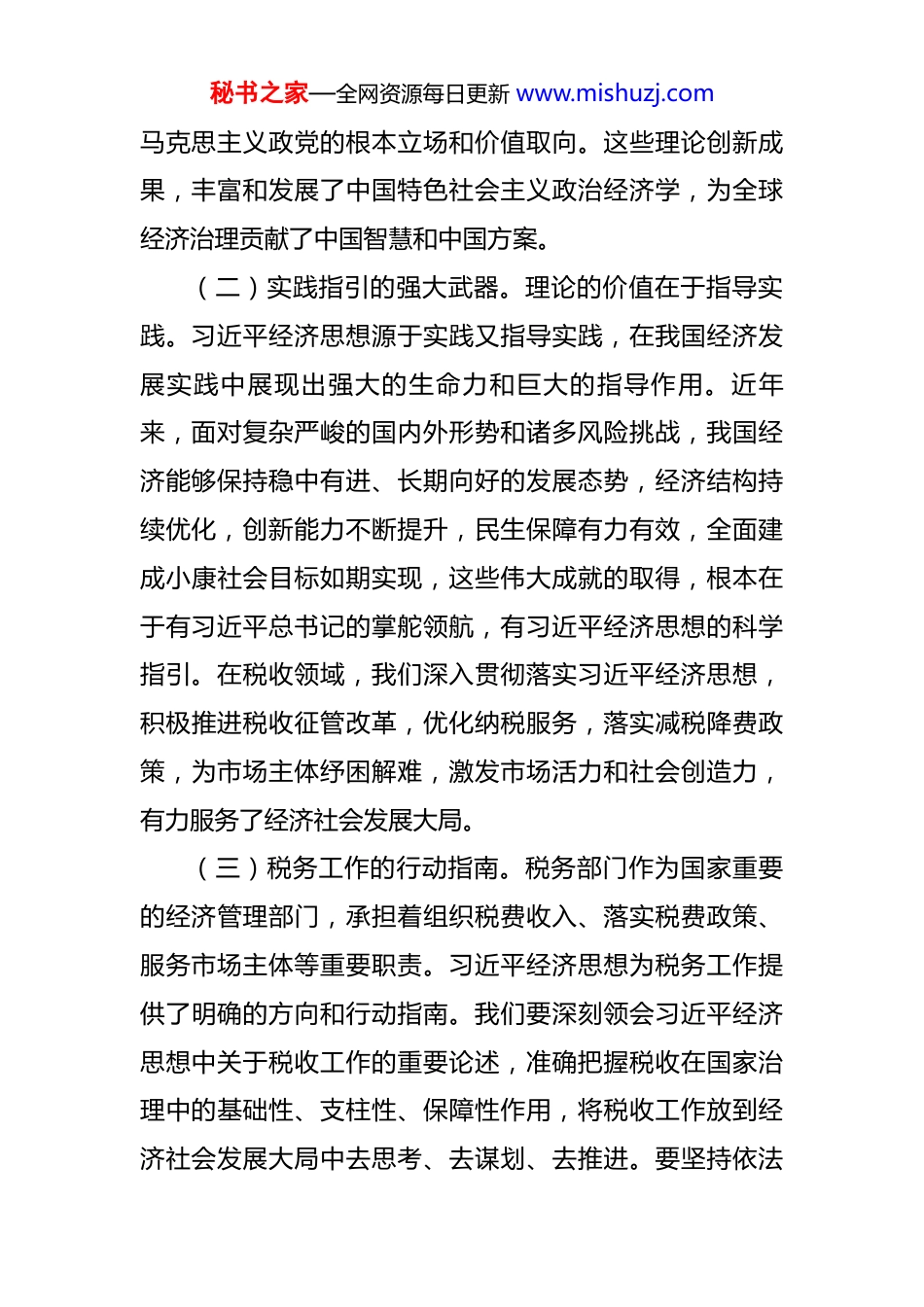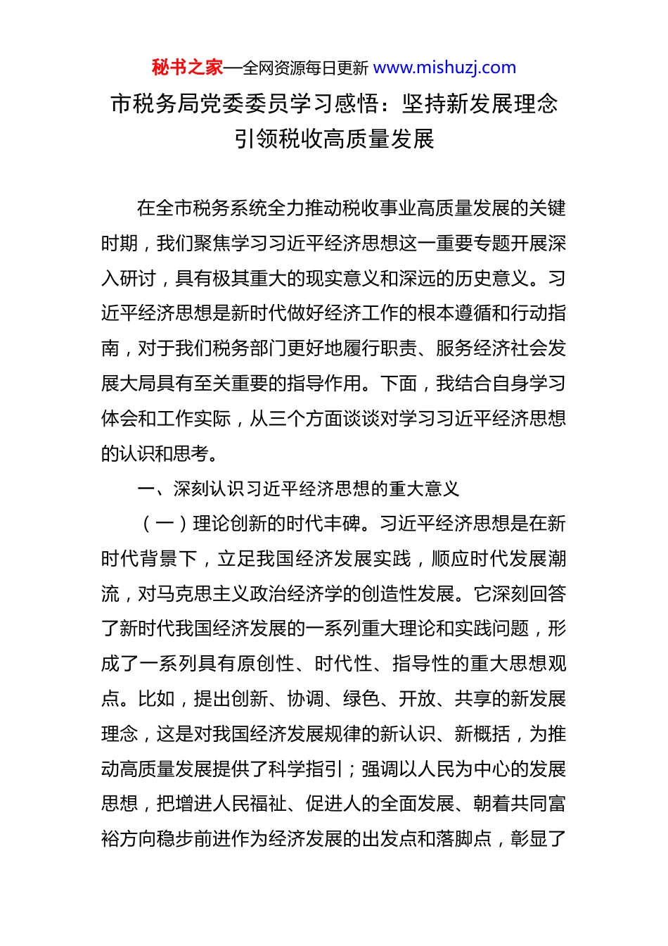 秘书之家—全网资源每日更新 www.mishuzj.com市税务局党委委员学习感悟:坚持新发展理念引领税收高质量发展 在全市税务系统全力推动税收事业高质量发展的关键时期,我们聚焦学习习近平经济思想这一重要专题开展深入研讨,具有极其重大的现实意义和深远的历史意义。习近平经济思想是新时代做好经济工作的根本遵循和行动指南,对于我们税务部门更好地履行职责、服务经济社会发展大局具有至关重要的指导作用。下面,我结合自身学习体会和工作实际,从三个方面谈谈对学习习近平经济思想的认识和思考。一、深刻认识习近平经济思想的重大意义(一)理论创新的时代丰碑。习近平经济思想是在新时代背景下,立足我国经济发展实践,顺应时代发展潮流,对马克思主义政治经济学的创造性发展。它深刻回答了新时代我国经济发展的一系列重大理论和实践问题,形成了一系列具有原创性、时代性、指导性的重大思想观点。比如,提出创新、协调、绿色、开放、共享的新发展理念,这是对我国经济发展规律的新认识、新概括,为推动高质量发展提供了科学指引;强调以人民为中心的发展思想,把增进人民福祉、促进人的全面发展、朝着共同富裕方向稳步前进作为经济发展的出发点和落脚点,彰显了秘书之家—全网资源每日更新 www.mishuzj.com马克思主义政党的根本立场和价值取向。这些理论创新成果,丰富和发展了中国特色社会主义政治经济学,为全球经济治理贡献了中国智慧和中国方案。(二)实践指引的强大武器。理论的价值在于指导实践。习近平经济思想源于实践又指导实践,在我国经济发展实践中展现出强大的生命力和巨大的指导作用。近年来,面对复杂严峻的国内外形势和诸多风险挑战,我国经济能够保持稳中有进、长期向好的发展态势,经济结构持续优化,创新能力不断提升,民生保障有力有效,全面建成小康社会目标如期实现,这些伟大成就的取得,根本在于有习近平总书记的掌舵领航,有习近平经济思想的科学指引。在税收领域,我们深入贯彻落实习近平经济思想,积极推进税收征管改革,优化纳税服务,落实减税降费政策,为市场主体纾困解难,激发市场活力和社会创造力,有力服务了经济社会发展大局。(三)税务工作的行动指南。税务部门作为国家重要的经济管理部门,承担着组织税费收入、落实税费政策、服务市场主体等重要职责。习近平经济思想为税务工作提供了明确的方向和行动指南。我们要深刻领会习近平经济思想中关于税收工作的重要论述,准确把握税收在国家治理中的基础性、支柱性、保障性作用,将税收工作放到经济社会发展大局中去思考、去谋划、去推进。要坚持依法秘书之家—全网资源每日更新 www.mishuzj.com征税,做到应收尽收,同时坚决不收“过头税”,确保税收收入质量;要积极落实各项税费优惠政策,助力企业减负增效、轻装前行;要持续优化纳税服务,提升纳税人缴费人的满意度和获得感,为经济社会发展营造良好的税收环境。二、准确把握习近平经济思想的核心要义(一)坚持新发展理念引领税收发展。新发展理念是习近平经济思想的重要内容,是推动高质量发展的指挥棒、红绿灯。在税收工作中,我们要完整、准确、全面贯彻新发展理念,推动税收事业高质量发展。创新发展方面,要积极推进税收征管数字化升级和智能化改造,运用大数据、云计算、人工智能等现代信息技术,创新税收征管方式,提高税收征管效率和质量。协调发展方面,要加强税收与经济、社会、生态等各领域的协调配合,统筹推进城乡税收征管一体化,促进区域税收协调发展。绿色发展方面,要落实好绿色税收政策,发挥税收对环境保护和资源节约的引导作用,推动经济社会发展全面绿色转型。开放发展方面,要积极参与国际税收合作与竞争,加强与“一带一路”沿线国家和地区的税收交流与合作,服务高水平对外开放。共享发展方面,要坚持以人民为中心的发展思想,不断优化纳税服务,让税收改革发展成果更多更公平惠及全体人民。秘书之家—全网资源每日更新 www.mishuzj.com(二)以供给侧结构性改革为主线优化税收服务。供给侧结构性改革是调整经济结构、转变经济发展方式的治本良方。税务部门要围绕供给侧结构性改革这条主线,充分发挥税收...