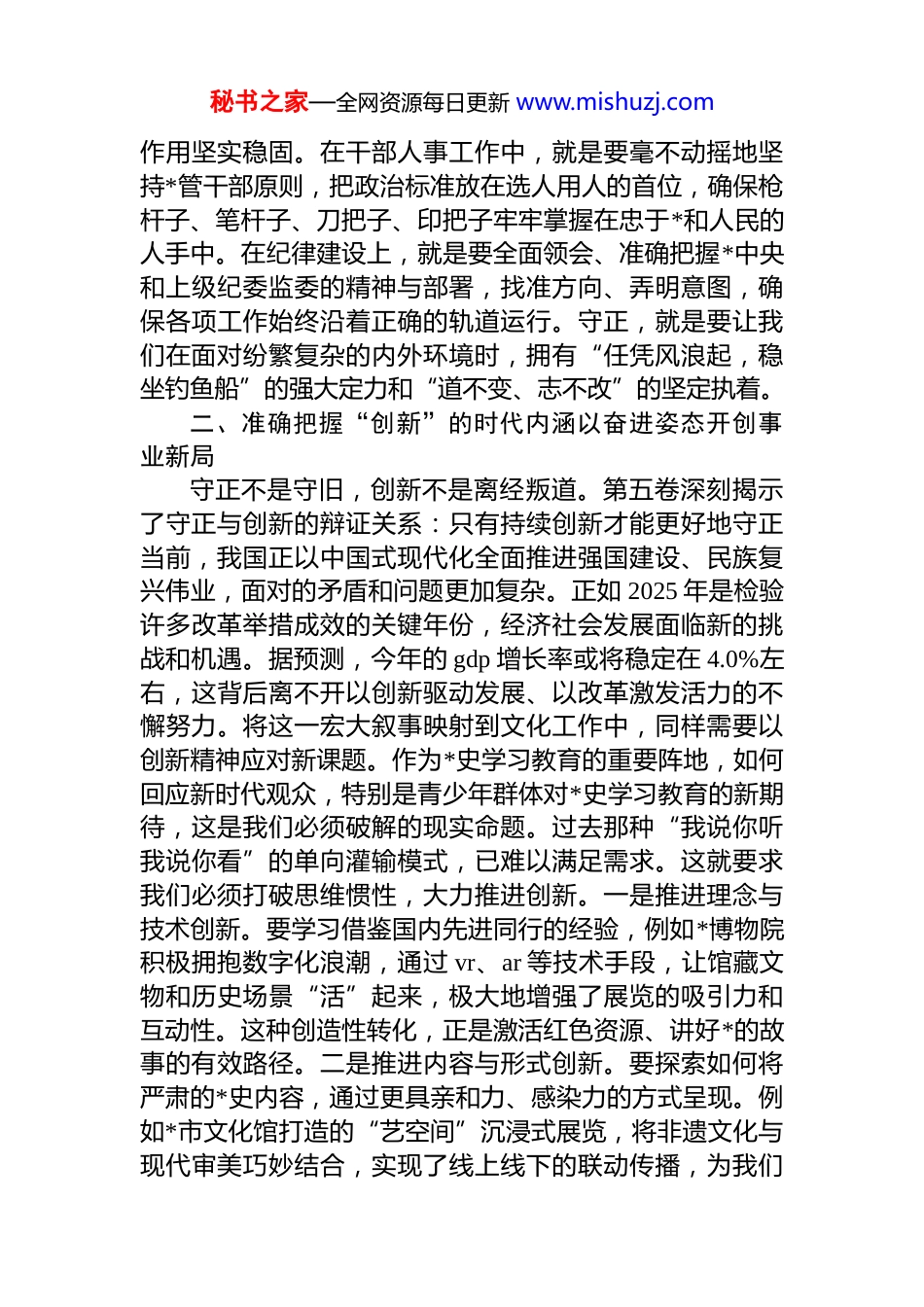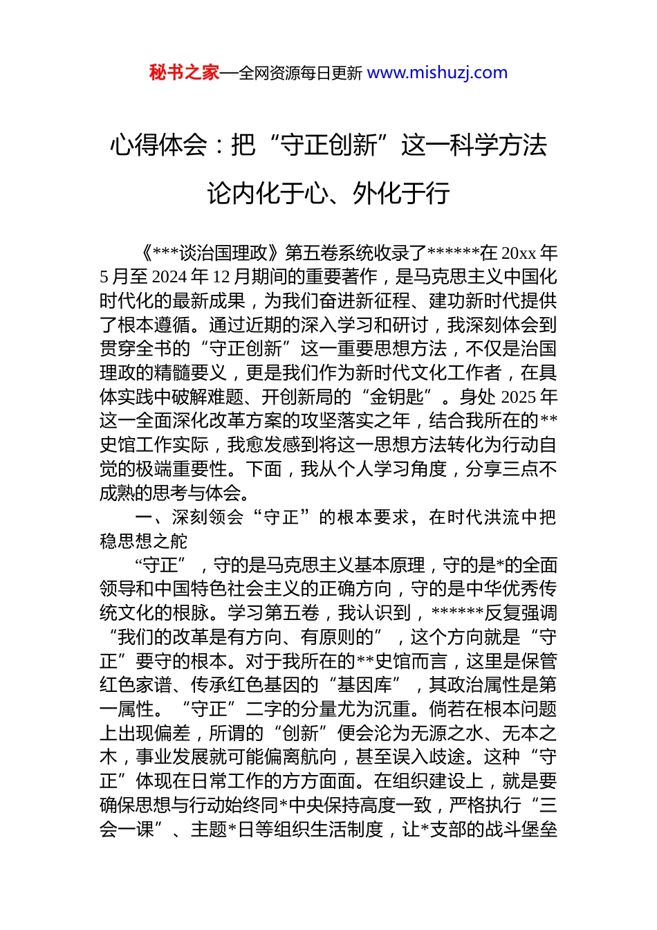 秘书之家—全网资源每日更新 www.mishuzj.com心得体会:把“守正创新”这一科学方法论内化于心、外化于行《***谈治国理政》第五卷系统收录了******在 20xx 年5 月至 2024 年 12 月期间的重要著作,是马克思主义中国化时代化的最新成果,为我们奋进新征程、建功新时代提供了根本遵循。通过近期的深入学习和研讨,我深刻体会到贯穿全书的“守正创新”这一重要思想方法,不仅是治国理政的精髓要义,更是我们作为新时代文化工作者,在具体实践中破解难题、开创新局的“金钥匙”。身处 2025 年这一全面深化改革方案的攻坚落实之年,结合我所在的**史馆工作实际,我愈发感到将这一思想方法转化为行动自觉的极端重要性。下面,我从个人学习角度,分享三点不成熟的思考与体会。一、深刻领会“守正”的根本要求,在时代洪流中把稳思想之舵“守正”,守的是马克思主义基本原理,守的是*的全面领导和中国特色社会主义的正确方向,守的是中华优秀传统文化的根脉。学习第五卷,我认识到,******反复强调“我们的改革是有方向、有原则的”,这个方向就是“守正”要守的根本。对于我所在的**史馆而言,这里是保管红色家谱、传承红色基因的“基因库”,其政治属性是第一属性。“守正”二字的分量尤为沉重。倘若在根本问题上出现偏差,所谓的“创新”便会沦为无源之水、无本之木,事业发展就可能偏离航向,甚至误入歧途。这种“守正”体现在日常工作的方方面面。在组织建设上,就是要确保思想与行动始终同*中央保持高度一致,严格执行“三会一课”、主题*日等组织生活制度,让*支部的战斗堡垒秘书之家—全网资源每日更新 www.mishuzj.com作用坚实稳固。在干部人事工作中,就是要毫不动摇地坚持*管干部原则,把政治标准放在选人用人的首位,确保枪杆子、笔杆子、刀把子、印把子牢牢掌握在忠于*和人民的人手中。在纪律建设上,就是要全面领会、准确把握*中央和上级纪委监委的精神与部署,找准方向、弄明意图,确保各项工作始终沿着正确的轨道运行。守正,就是要让我们在面对纷繁复杂的内外环境时,拥有“任凭风浪起,稳坐钓鱼船”的强大定力和“道不变、志不改”的坚定执着。二、准确把握“创新”的时代内涵以奋进姿态开创事业新局守正不是守旧,创新不是离经叛道。第五卷深刻揭示了守正与创新的辩证关系:只有持续创新才能更好地守正当前,我国正以中国式现代化全面推进强国建设、民族复兴伟业,面对的矛盾和问题更加复杂。正如 2025 年是检验许多改革举措成效的关键年份,经济社会发展面临新的挑战和机遇。据预测,今年的 gdp 增长率或将稳定在 4.0%左右,这背后离不开以创新驱动发展、以改革激发活力的不懈努力。将这一宏大叙事映射到文化工作中,同样需要以创新精神应对新课题。作为*史学习教育的重要阵地,如何回应新时代观众,特别是青少年群体对*史学习教育的新期待,这是我们必须破解的现实命题。过去那种“我说你听我说你看”的单向灌输模式,已难以满足需求。这就要求我们必须打破思维惯性,大力推进创新。一是推进理念与技术创新。要学习借鉴国内先进同行的经验,例如*博物院积极拥抱数字化浪潮,通过 vr、ar 等技术手段,让馆藏文物和历史场景“活”起来,极大地增强了展览的吸引力和互动性。这种创造性转化,正是激活红色资源、讲好*的故事的有效路径。二是推进内容与形式创新。要探索如何将严肃的*史内容,通过更具亲和力、感染力的方式呈现。例如*市文化馆打造的“艺空间”沉浸式展览,将非遗文化与现代审美巧妙结合,实现了线上线下的联动传播,为我们秘书之家—全网资源每日更新 www.mishuzj.com提供了很好的思路。我们也可以尝试开发更多分众化、定制化的研学课程和社教活动,如*市博物馆开展的“润物有声——送文博知识进校园”活动,将优质文化资源精准送达目标群体。三是推进管理与服务创新。在内部管理上,要将改革创新的精神融入干部“选、育、管、用”全过程在政策允许范围内积极探索,确保人岗相适、人尽其才,真正把单位打造成激励人心、凝聚力量的“人才之家”。三、始终秉持“为民”的价值取向在服务大局中彰显使命担当无论是“守正”还是“创新”,其...