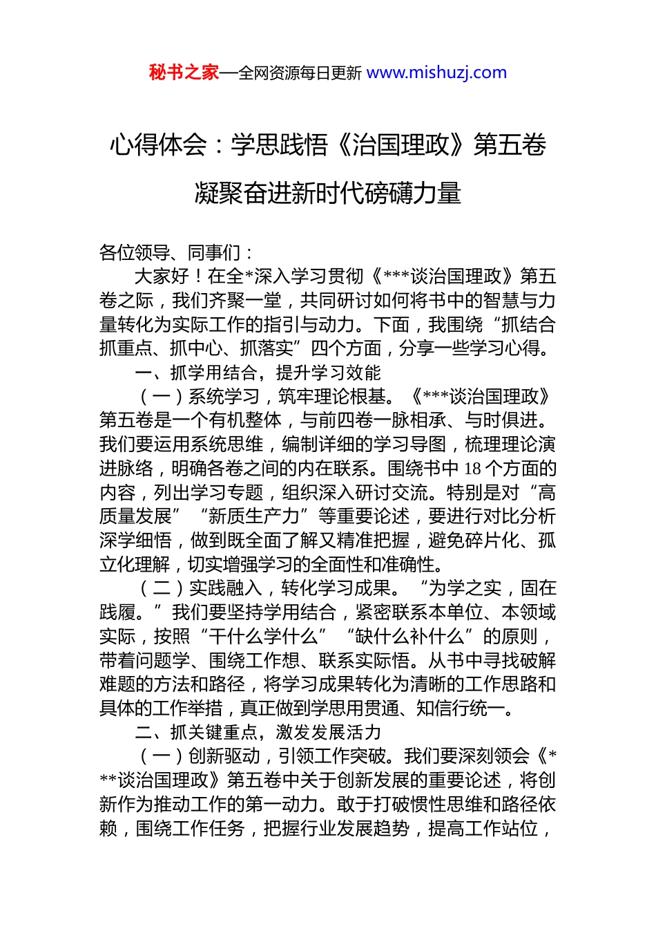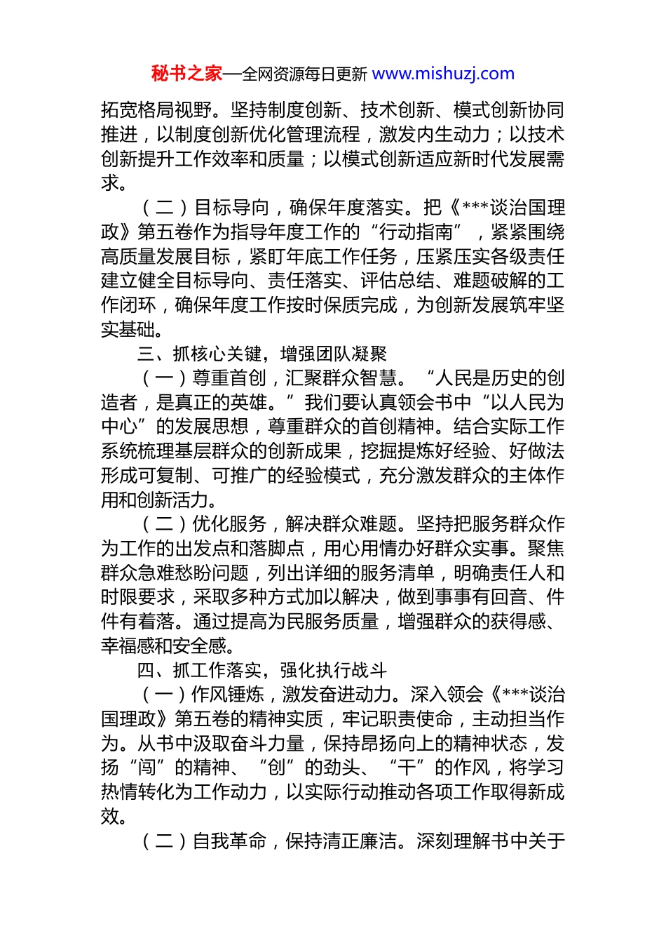 秘书之家—全网资源每日更新 www.mishuzj.com心得体会:学思践悟《治国理政》第五卷凝聚奋进新时代磅礴力量各位领导、同事们:大家好!在全*深入学习贯彻《***谈治国理政》第五卷之际,我们齐聚一堂,共同研讨如何将书中的智慧与力量转化为实际工作的指引与动力。下面,我围绕“抓结合抓重点、抓中心、抓落实”四个方面,分享一些学习心得。一、抓学用结合,提升学习效能(一)系统学习,筑牢理论根基。《***谈治国理政》第五卷是一个有机整体,与前四卷一脉相承、与时俱进。我们要运用系统思维,编制详细的学习导图,梳理理论演进脉络,明确各卷之间的内在联系。围绕书中 18 个方面的内容,列出学习专题,组织深入研讨交流。特别是对“高质量发展”“新质生产力”等重要论述,要进行对比分析深学细悟,做到既全面了解又精准把握,避免碎片化、孤立化理解,切实增强学习的全面性和准确性。(二)实践融入,转化学习成果。“为学之实,固在践履。”我们要坚持学用结合,紧密联系本单位、本领域实际,按照“干什么学什么”“缺什么补什么”的原则,带着问题学、围绕工作想、联系实际悟。从书中寻找破解难题的方法和路径,将学习成果转化为清晰的工作思路和具体的工作举措,真正做到学思用贯通、知信行统一。二、抓关键重点,激发发展活力(一)创新驱动,引领工作突破。我们要深刻领会《***谈治国理政》第五卷中关于创新发展的重要论述,将创新作为推动工作的第一动力。敢于打破惯性思维和路径依赖,围绕工作任务,把握行业发展趋势,提高工作站位,秘书之家—全网资源每日更新 www.mishuzj.com拓宽格局视野。坚持制度创新、技术创新、模式创新协同推进,以制度创新优化管理流程,激发内生动力;以技术创新提升工作效率和质量;以模式创新适应新时代发展需求。(二)目标导向,确保年度落实。把《***谈治国理政》第五卷作为指导年度工作的“行动指南”,紧紧围绕高质量发展目标,紧盯年底工作任务,压紧压实各级责任建立健全目标导向、责任落实、评估总结、难题破解的工作闭环,确保年度工作按时保质完成,为创新发展筑牢坚实基础。三、抓核心关键,增强团队凝聚(一)尊重首创,汇聚群众智慧。“人民是历史的创造者,是真正的英雄。”我们要认真领会书中“以人民为中心”的发展思想,尊重群众的首创精神。结合实际工作系统梳理基层群众的创新成果,挖掘提炼好经验、好做法形成可复制、可推广的经验模式,充分激发群众的主体作用和创新活力。(二)优化服务,解决群众难题。坚持把服务群众作为工作的出发点和落脚点,用心用情办好群众实事。聚焦群众急难愁盼问题,列出详细的服务清单,明确责任人和时限要求,采取多种方式加以解决,做到事事有回音、件件有着落。通过提高为民服务质量,增强群众的获得感、幸福感和安全感。四、抓工作落实,强化执行战斗(一)作风锤炼,激发奋进动力。深入领会《***谈治国理政》第五卷的精神实质,牢记职责使命,主动担当作为。从书中汲取奋斗力量,保持昂扬向上的精神状态,发扬“闯”的精神、“创”的劲头、“干”的作风,将学习热情转化为工作动力,以实际行动推动各项工作取得新成效。(二)自我革命,保持清正廉洁。深刻理解书中关于秘书之家—全网资源每日更新 www.mishuzj.com自我革命的重要论述,加强自我约束和管理,严格落实各项制度要求,自觉遵守 dj 国法。全面筑牢思想防线,遵守职业道德,强化思想品德修养,保持个人私德,做到干净做事、清白做人,以良好的形象和过硬的作风为*和人民的事业贡献力量。同志们,学习贯彻《***谈治国理政》第五卷是当前和今后一个时期的重要政治任务。让我们以此次研讨为契机进一步学深悟透、融会贯通,将学习成果转化为推动工作的强大动力,为实现中华民族伟大复兴的中国梦贡献自己的智慧和力量!谢谢大家!