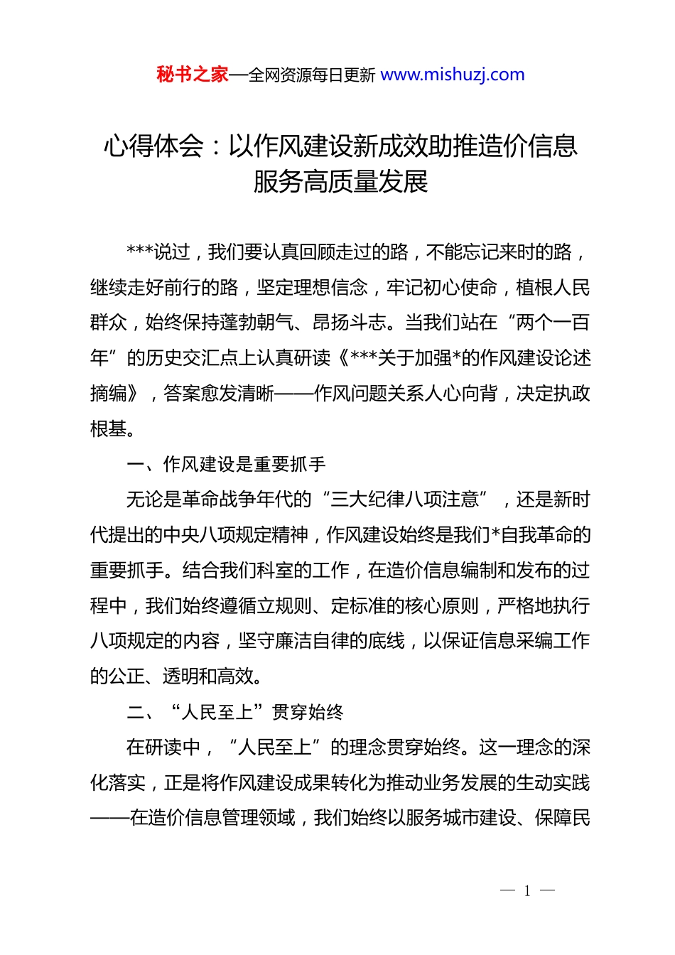 秘书之家—全网资源每日更新 www.mishuzj.com心得体会:以作风建设新成效助推造价信息服务高质量发展***说过,我们要认真回顾走过的路,不能忘记来时的路,继续走好前行的路,坚定理想信念,牢记初心使命,植根人民群众,始终保持蓬勃朝气、昂扬斗志。当我们站在“两个一百年”的历史交汇点上认真研读《***关于加强*的作风建设论述摘编》,答案愈发清晰——作风问题关系人心向背,决定执政根基。一、作风建设是重要抓手无论是革命战争年代的“三大纪律八项注意”,还是新时代提出的中央八项规定精神,作风建设始终是我们*自我革命的重要抓手。结合我们科室的工作,在造价信息编制和发布的过程中,我们始终遵循立规则、定标准的核心原则,严格地执行八项规定的内容,坚守廉洁自律的底线,以保证信息采编工作的公正、透明和高效。二、“人民至上”贯穿始终在研读中,“人民至上”的理念贯穿始终。这一理念的深化落实,正是将作风建设成果转化为推动业务发展的生动实践——在造价信息管理领域,我们始终以服务城市建设、保障民— 1 —秘书之家—全网资源每日更新 www.mishuzj.com生需求为根本出发点,将*的群众路线贯穿于政策制定与执行全过程。当前,我国城市化进程已进入“存量更新”的新阶段,为积极助推我省城市更新行动,我们将以人民为中心的发展理念深度融入到造价信息管理工作中,聚焦政策导向、造价管控、科技创新等造价咨讯,打造多跨协同的信息服务应用场景,在《浙江造价信息》开设“城市更新”专栏,内容包含城市更新相关的政策文件、典型案例经验做法、造价指标等。为建设市场各方主体在我省既有建筑改造、城镇老旧小区改造等各类城市更新工作中提供多元化信息服务。三、知行合一是学习的关键学习的关键在于知行合一。自从到站里工作以来,已经过去两个月有余,参与了我们科室负责的两本定额编制工作。在此期间,我们以问题为导向,针对 18 版定额在执行过程中存在的问题,下工地、跑市场、召开研讨会,力求使定额编制能充分反映市场实际。作风建设永远在路上。作为新人,我始终坚定跟随习***的步伐,把培育国家战略人才力量的政策重心放在青年科技人才上,把务实担当的工作作风贯穿科技论证、科研项目管理、科技成果转化应用的全过程,真正使科技创新这个“关键变量”转化为高质量发展的“最大增量”,推动科技创新与产业创新— 2 —秘书之家—全网资源每日更新 www.mishuzj.com深度融合。作为新时代的共产*员,我将以永远在路上的韧劲和执着,持之以恒转作风、树新风,努力成为让*放心、让人民满意的合格*员,用实际行动诠释对*的忠诚与担当,贡献自己的青春力量。— 3 —