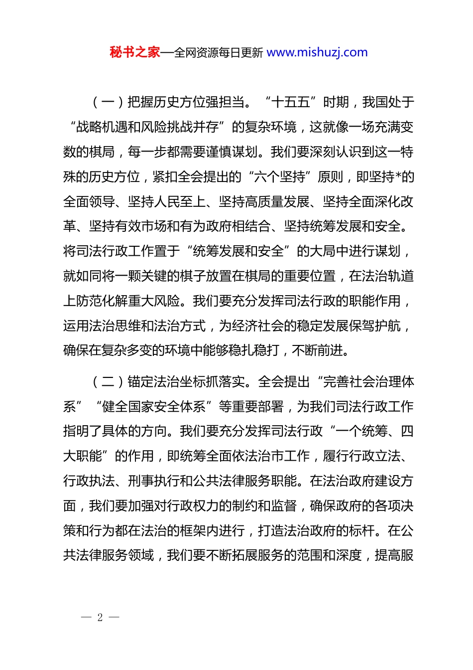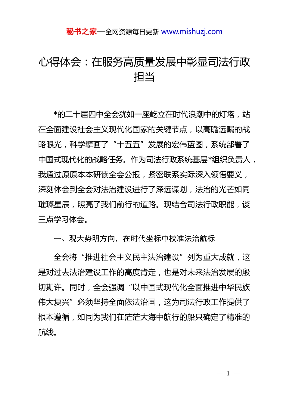 秘书之家—全网资源每日更新 www.mishuzj.com心得体会:在服务高质量发展中彰显司法行政担当*的二十届四中全会犹如一座屹立在时代浪潮中的灯塔,站在全面建设社会主义现代化国家的关键节点,以高瞻远瞩的战略眼光,科学擘画了“十五五”发展的宏伟蓝图,系统部署了中国式现代化的战略任务。作为司法行政系统基层*组织负责人,我通过原原本本研读全会公报,紧密联系实际深入领悟要义,深刻体会到全会对法治建设进行了深远谋划,法治的光芒如同璀璨星辰,照亮了我们前行的道路。现结合司法行政职能,谈三点学习体会。一、观大势明方向,在时代坐标中校准法治航标全会将“推进社会主义民主法治建设”列为重大成就,这是对过去法治建设工作的高度肯定,也是对未来法治发展的殷切期许。同时,全会强调“以中国式现代化全面推进中华民族伟大复兴”必须坚持全面依法治国,这为司法行政工作提供了根本遵循,如同为我们在茫茫大海中航行的船只确定了精准的航线。— 1 —秘书之家—全网资源每日更新 www.mishuzj.com(一)把握历史方位强担当。“十五五”时期,我国处于“战略机遇和风险挑战并存”的复杂环境,这就像一场充满变数的棋局,每一步都需要谨慎谋划。我们要深刻认识到这一特殊的历史方位,紧扣全会提出的“六个坚持”原则,即坚持*的全面领导、坚持人民至上、坚持高质量发展、坚持全面深化改革、坚持有效市场和有为政府相结合、坚持统筹发展和安全。将司法行政工作置于“统筹发展和安全”的大局中进行谋划,就如同将一颗关键的棋子放置在棋局的重要位置,在法治轨道上防范化解重大风险。我们要充分发挥司法行政的职能作用,运用法治思维和法治方式,为经济社会的稳定发展保驾护航,确保在复杂多变的环境中能够稳扎稳打,不断前进。(二)锚定法治坐标抓落实。全会提出“完善社会治理体系”“健全国家安全体系”等重要部署,为我们司法行政工作指明了具体的方向。我们要充分发挥司法行政“一个统筹、四大职能”的作用,即统筹全面依法治市工作,履行行政立法、行政执法、刑事执行和公共法律服务职能。在法治政府建设方面,我们要加强对行政权力的制约和监督,确保政府的各项决策和行为都在法治的框架内进行,打造法治政府的标杆。在公共法律服务领域,我们要不断拓展服务的范围和深度,提高服— 2 —秘书之家—全网资源每日更新 www.mishuzj.com务的质量和效率,让人民群众能够更加便捷地享受到优质的法律服务。在矛盾纠纷化解方面,我们要建立健全多元化的纠纷解决机制,及时有效地化解各类矛盾纠纷,维护社会的和谐稳定。通过在这些领域的努力,打造更多标志性成果,为法治建设添砖加瓦。(三)强化斗争精神铸铁军。在意识形态领域,当前形势复杂多变,各种错误思潮暗流涌动。我们要发扬“敢于斗争、善于斗争”的精神,如同英勇的战士,在律师行业 dj、社区矫正监管等战线上筑牢政治忠诚的堡垒。坚决抵制“司法独立”等错误思潮,这些错误思潮就像侵蚀法治根基的毒瘤,我们要以坚定的信念和无畏的勇气,将其彻底清除。加强对律师队伍的思想政治教育,引导他们树立正确的价值观和职业操守,确保律师行业始终保持正确的政治方向。在社区矫正监管工作中,要严格落实各项监管制度,加强对社区矫正对象的教育和改造,防止他们重新违法犯罪,维护社会的安全稳定。二、抓融合促提升,以法治实践赋能发展大局全会提出“坚持有效市场和有为政府相结合”,这为司法行政系统在优化法治化营商环境中展现新作为提供了广阔的空间。我们要充分发挥司法行政的职能优势,为市场的有效运行— 3 —秘书之家—全网资源每日更新 www.mishuzj.com和政府的有为治理提供坚实的法治保障。(一)当好法治营商“护航员”。一是深化“法治体检”专项行动。组织专业的律师团队,深入重点产业项目,为企业提供全生命周期的法律服务。这就像为企业配备了一位专业的“健康顾问”,从企业的设立、运营到发展的各个阶段,都能及时发现潜在的法律风险,并提供针对性的解决方案。通过定期开展“法治体检”,帮助企业完善内部管理制度,规范合同签订和履行,提高企业的法律风险防范能力。二是推行证明事项告...