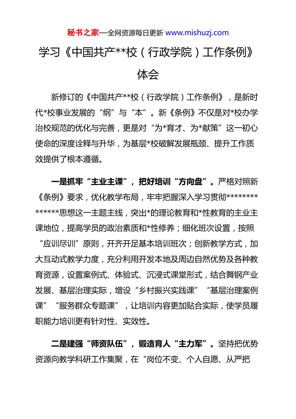 秘书之家—全网资源每日更新 www.mishuzj.com学习《中国共产**校(行政学院)工作条例》体会新修订的《中国共产**校(行政学院)工作条例》,是新时代*校事业发展的“纲”与“本”。新《条例》不仅是对*校办学治校规范的优化与完善,更是对“为*育才、为*献策”这一初心使命的深度诠释与升华,为基层*校破解发展瓶颈、提升工作质效提供了根本遵循。一是抓牢“主业主课”,把好培训“方向盘”。严格对照新《条例》要求,优化教学布局,牢牢把握深入学习贯彻**************思想这一主题主线,突出*的理论教育和*性教育的主业主课地位,提高学员的政治素质和*性修养;细化班次设置,按照“应训尽训”原则,开齐开足基本培训班次;创新教学方式,加大互动式教学力度,充分利用开发本地及周边自然优势及各种教育资源,设置案例式、体验式、沉浸式课堂形式,结合舞钢产业发展、基层治理实际,增设“乡村振兴实践课”“基层治理案例课”“服务群众专题课”,让培训内容更加贴合实际,使学员履职能力培训更有针对性、实效性。二是建强“师资队伍”,锻造育人“主力军”。坚持把优势资源向教学科研工作集聚,在“岗位不变、个人自愿、从严把秘书之家—全网资源每日更新 www.mishuzj.com关”的原则下,鼓励具有丰富实践经验和符合授课要求的 4 名领导干部、参公行政人员走上讲台,扩充教师队伍。落实新《条例》中“专职教师占比不低于 40%”的要求,通过公开招聘、人才引进等形式补充专职教师队伍;加强教师政治素质考察,建立“授课准入”机制,新进教师必须经过政治理论考核和试讲评估后才能走上讲台;积极与上级*校、兄弟*校开展深度合作,推动师资交流;适时选派优秀教师到基层、*政部门挂职锻炼,让教师在实践中积累经验,提升理论联系实际的能力。三是做优“科研咨政”,当好决策“智囊团”。始终将优质办学、高效科研作为工作核心,形成了鲜明的办学特色与扎实的工作优势。聚焦对标新《条例》要求,进一步完善科研管理制度,坚持考核制度、激励制度双管齐下,建强科研团队,培养科研骨干,积极围绕市委市政府重点工作,建言献策,实现“科研成果转化”,为*委政府决策提供参考,有效实现教研咨一体化建设;此外,加强意识形态阵地管理,严格审核科研成果、授课内容、宣传信息,确保每一次发声准确无误,每一个观点导向鲜明。四是夯实“办学保障”,筑牢发展“硬支撑”。积极上报上级*委,对接财政部门,确保*校工作经费足额列入年度预算并及时拨付到位,确保各类培训的高质量开展;推进基础设施升级,对报告厅、教室的电子屏、电脑、通讯网络进行优化升级,为实秘书之家—全网资源每日更新 www.mishuzj.com现“线上直播 + 线下集中”培训模式提供基础保障;建立新《条例》执行监督机制,每月对照内容自查工作落实情况,确保各项要求落地生根。