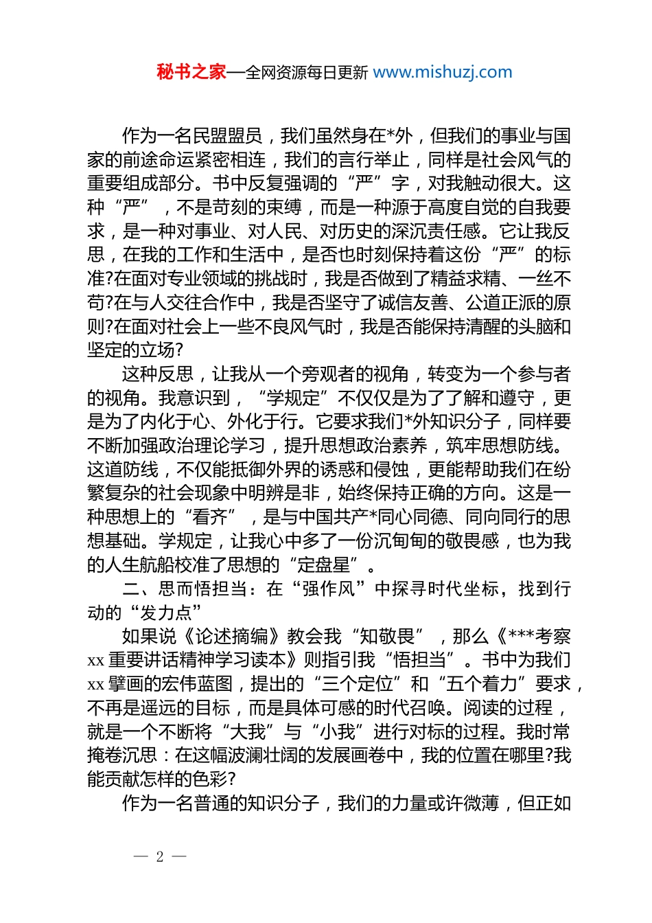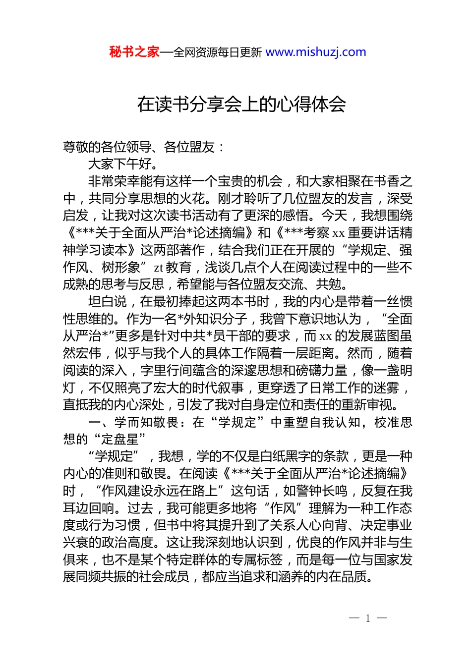 秘书之家—全网资源每日更新 www.mishuzj.com在读书分享会上的心得体会尊敬的各位领导、各位盟友:大家下午好。非常荣幸能有这样一个宝贵的机会,和大家相聚在书香之中,共同分享思想的火花。刚才聆听了几位盟友的发言,深受启发,让我对这次读书活动有了更深的感悟。今天,我想围绕《***关于全面从严治*论述摘编》和《***考察 xx 重要讲话精神学习读本》这两部著作,结合我们正在开展的“学规定、强作风、树形象”zt 教育,浅谈几点个人在阅读过程中的一些不成熟的思考与反思,希望能与各位盟友交流、共勉。坦白说,在最初捧起这两本书时,我的内心是带着一丝惯性思维的。作为一名*外知识分子,我曾下意识地认为,“全面从严治*”更多是针对中共*员干部的要求,而 xx 的发展蓝图虽然宏伟,似乎与我个人的具体工作隔着一层距离。然而,随着阅读的深入,字里行间蕴含的深邃思想和磅礴力量,像一盏明灯,不仅照亮了宏大的时代叙事,更穿透了日常工作的迷雾,直抵我的内心深处,引发了我对自身定位和责任的重新审视。一、学而知敬畏:在“学规定”中重塑自我认知,校准思想的“定盘星”“学规定”,我想,学的不仅是白纸黑字的条款,更是一种内心的准则和敬畏。在阅读《***关于全面从严治*论述摘编》时,“作风建设永远在路上”这句话,如警钟长鸣,反复在我耳边回响。过去,我可能更多地将“作风”理解为一种工作态度或行为习惯,但书中将其提升到了关系人心向背、决定事业兴衰的政治高度。这让我深刻地认识到,优良的作风并非与生俱来,也不是某个特定群体的专属标签,而是每一位与国家发展同频共振的社会成员,都应当追求和涵养的内在品质。— 1 —秘书之家—全网资源每日更新 www.mishuzj.com作为一名民盟盟员,我们虽然身在*外,但我们的事业与国家的前途命运紧密相连,我们的言行举止,同样是社会风气的重要组成部分。书中反复强调的“严”字,对我触动很大。这种“严”,不是苛刻的束缚,而是一种源于高度自觉的自我要求,是一种对事业、对人民、对历史的深沉责任感。它让我反思,在我的工作和生活中,是否也时刻保持着这份“严”的标准?在面对专业领域的挑战时,我是否做到了精益求精、一丝不苟?在与人交往合作中,我是否坚守了诚信友善、公道正派的原则?在面对社会上一些不良风气时,我是否能保持清醒的头脑和坚定的立场?这种反思,让我从一个旁观者的视角,转变为一个参与者的视角。我意识到,“学规定”不仅仅是为了了解和遵守,更是为了内化于心、外化于行。它要求我们*外知识分子,同样要不断加强政治理论学习,提升思想政治素养,筑牢思想防线。这道防线,不仅能抵御外界的诱惑和侵蚀,更能帮助我们在纷繁复杂的社会现象中明辨是非,始终保持正确的方向。这是一种思想上的“看齐”,是与中国共产*同心同德、同向同行的思想基础。学规定,让我心中多了一份沉甸甸的敬畏感,也为我的人生航船校准了思想的“定盘星”。二、思而悟担当:在“强作风”中探寻时代坐标,找到行动的“发力点”如果说《论述摘编》教会我“知敬畏”,那么《***考察xx 重要讲话精神学习读本》则指引我“悟担当”。书中为我们xx 擘画的宏伟蓝图,提出的“三个定位”和“五个着力”要求,不再是遥远的目标,而是具体可感的时代召唤。阅读的过程,就是一个不断将“大我”与“小我”进行对标的过程。我时常掩卷沉思:在这幅波澜壮阔的发展画卷中,我的位置在哪里?我能贡献怎样的色彩?作为一名普通的知识分子,我们的力量或许微薄,但正如— 2 —秘书之家—全网资源每日更新 www.mishuzj.com涓涓细流汇成江海,我们每个人脚踏实地的努力,正是推动时代前进的磅礴伟力。“强作风”,核心在于一个“实”字。***强调,要“求真务实、真抓实干”。这让我深刻反思,我们是否常常在工作中追求形式上的“花团锦簇”,而忽略了内容上的“颗粒归仓”?我们是否习惯于汇报工作时的“亮点纷呈”,而回避了实践中的“痛点难点”?这份读本让我明白,真正的担当,不是挂在嘴上的豪言壮语,而是体现在日常工作的一点一滴中。它是在专业研究中,摒弃浮躁,甘坐冷板凳,追求真理的执着;它是在教书育人岗位上...
