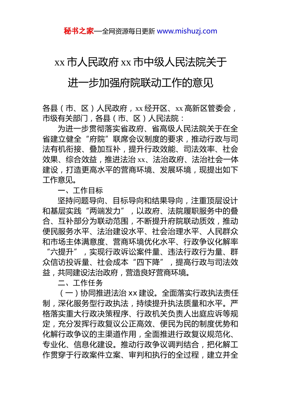 秘书之家—全网资源每日更新 www.mishuzj.comxx 市人民政府 xx 市中级人民法院关于进一步加强府院联动工作的意见各县(市、区)人民政府,xx 经开区、xx 高新区管委会,市级有关部门,各县(市、区)人民法院:为进一步贯彻落实省政府、省高级人民法院关于在全省建立健全“府院”联席会议制度的要求,推动行政与司法有机衔接、叠加互补,提升行政效能、司法效率、社会效果、综合效益,推进法治 xx、法治政府、法治社会一体建设,打造更高水平的营商环境、发展环境,现提出如下工作意见。一、工作目标坚持问题导向、目标导向和结果导向,注重顶层设计和基层实践“两端发力”,以政府、法院履职服务中的叠合、互补部分为联动范围,不断提升府院联动质效,推动便民服务水平、法治建设水平、社会治理水平、人民群众和市场主体满意度、营商环境优化水平、行政争议化解率“六提升”,实现行政诉讼案件量、违法行政行为量、群众信访投诉量、社会成本“四下降”,提高行政与司法效益,共同建设法治政府,营造良好营商环境。二、工作任务(一)协同推进法治 xx 建设。全面落实行政执法责任制,深化服务型行政执法,持续提升执法质量和水平。严格落实重大行政决策程序、行政机关负责人出庭应诉等规定,充分发挥行政复议公正高效、便民为民的制度优势和化解行政争议的主渠道作用,全面推进行政复议规范化、专业化、信息化建设。推动行政争议调判结合,把化解工作贯穿于行政案件立案、审判和执行的全过程,建立并全秘书之家—全网资源每日更新 www.mishuzj.com面推行行政争议诉前化解、重大案件协调化解制度,研究制定行政争议实质性化解工作对接流程制度,加强行政化解、司法化解在程序、方法等方面的衔接配合。建立健全行政调解告知引导制度,对属于行政调解范围的,主动告知并积极引导当事人通过行政调解解决纠纷,有效发挥行政调解在化解行政争议中的分流作用。(二)营造法治化营商环境。将平等保护原则贯穿政府立法、行政执法、法院司法、普法守法等各环节,依法平等保护各类市场主体合法权益。加大产权司法保护力度严禁违法采用刑事手段插手民事纠纷。坚持善意文明的执法、司法理念,慎用查封、扣押、冻结等保全措施,防止因违法违规使用强制措施干扰企业正常生产经营活动。依法惩治恶意拖欠账款和逃废债行为。府院双方加强协作配合,研判营商环境重大问题,协力推进诚信社会建设,共同维护政府和司法公信力,努力建设更具吸引力的市场化法治化、国际化营商环境。(三)完善破产府院联动机制。充分发挥政府对经济社会发展的引领作用,完善制度化、常态化企业破产协调联动机制,按照政府主导风险管控与事务协调、法院主导司法程序的协作模式,解决企业破产处置工作中的民生保障、社会稳定、财产接管、税收征管、资产处置、金融协调、信用修复、打击逃废债、变更注销、费用保障等重点难点问题,提高市场重组、出清的质量和效率,促进产业转型升级和资源优化配置,合力防范化解重大风险、维护社会大局稳定、促进经济高质量发展。(四)切实解决执行难题。推进政府及有关部门信息系统和法院执行信息网络查控系统互联共享,推动全市范围房产、车辆、股权、存款、金融理财产品、公积金等主要财产信息与人民法院网络查控系统联通,实现查封、冻结、扣押线上办理,为解决执行难赋能增效。建立涉*政机关执行案件沟通协商机制,加大常态化跟踪督办力度。完秘书之家—全网资源每日更新 www.mishuzj.com善失信被执行人跨部门、跨领域协同监管和联合惩戒机制将失信被执行人名单信息嵌入联动单位管理系统,构建失信被执行人信用承诺和修复激励机制,加大失信联合惩戒力度,形成执行攻坚合力。推进执行联动机制常态化运转通过失信联合惩戒、协作查找被执行人、追究拒不执行判决裁定罪等方式,加大对被执行人逃避执行、转移财产等行为的打击力度,切实维护法院生效裁判权威、保护债权人合法权益。(五)深化诉源治理多元预防化解纠纷。着力完善人民调解、行政调解、司法调解衔接联动机制,深入推进诉源治理,努力把矛盾纠纷化解在基层,消除在萌芽状态。围绕征地拆迁、房屋征收安置补偿、医疗...