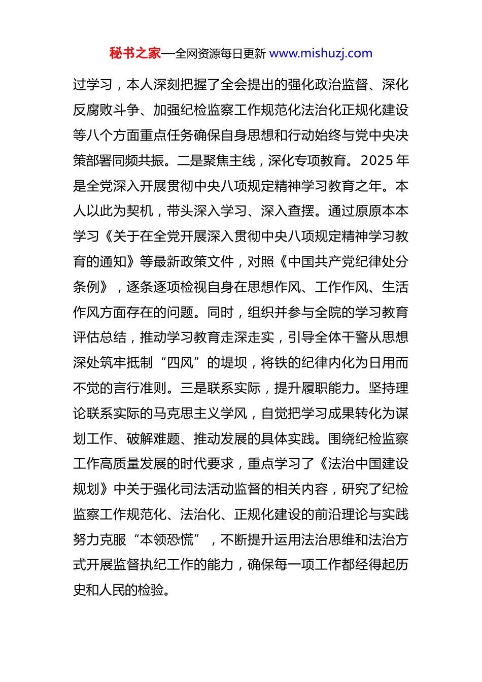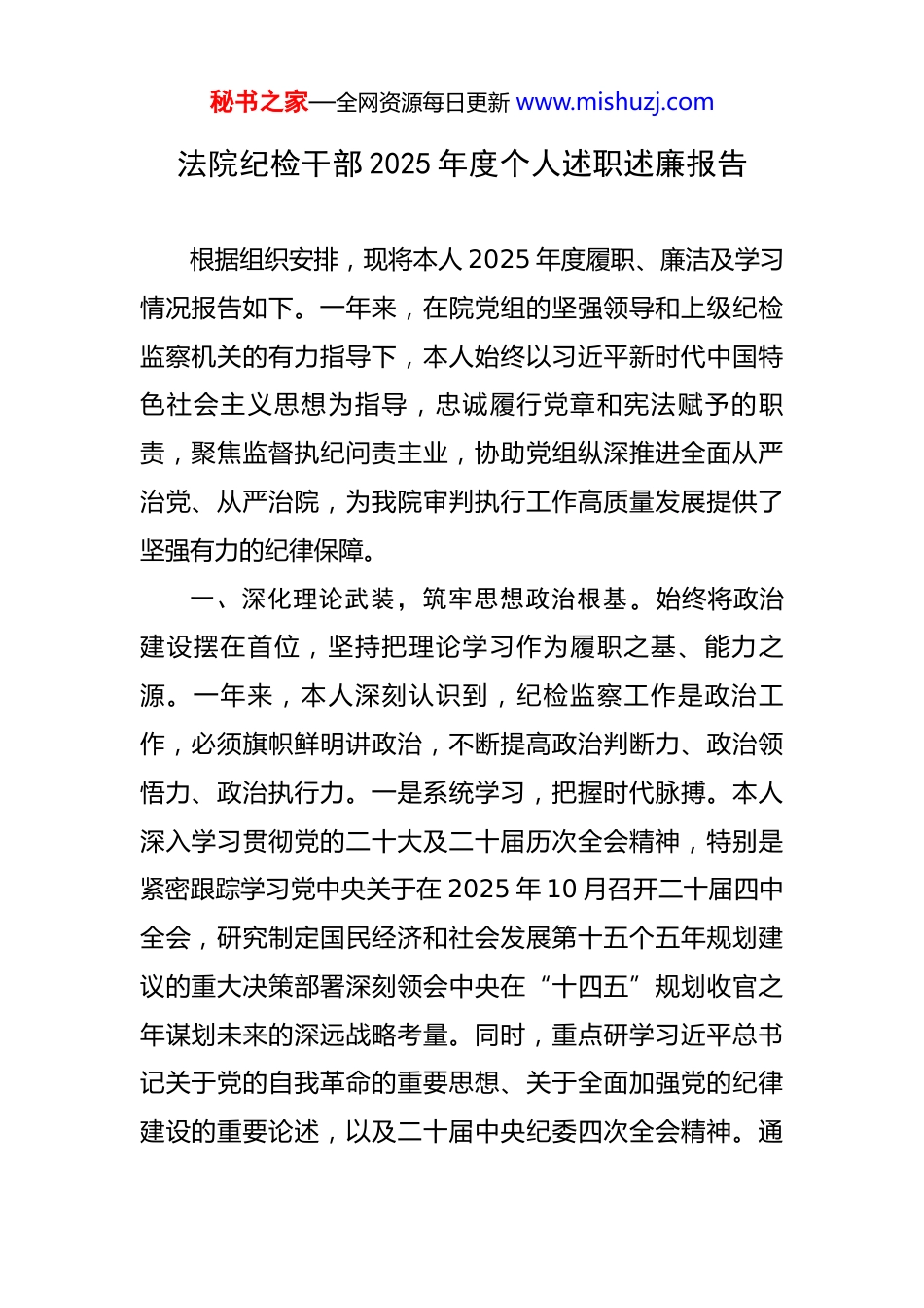 秘书之家—全网资源每日更新 www.mishuzj.com法院纪检干部 2025 年度个人述职述廉报告 根据组织安排,现将本人 2025 年度履职、廉洁及学习情况报告如下。一年来,在院党组的坚强领导和上级纪检监察机关的有力指导下,本人始终以习近平新时代中国特色社会主义思想为指导,忠诚履行党章和宪法赋予的职责,聚焦监督执纪问责主业,协助党组纵深推进全面从严治党、从严治院,为我院审判执行工作高质量发展提供了坚强有力的纪律保障。一、深化理论武装,筑牢思想政治根基。始终将政治建设摆在首位,坚持把理论学习作为履职之基、能力之源。一年来,本人深刻认识到,纪检监察工作是政治工作,必须旗帜鲜明讲政治,不断提高政治判断力、政治领悟力、政治执行力。一是系统学习,把握时代脉搏。本人深入学习贯彻党的二十大及二十届历次全会精神,特别是紧密跟踪学习党中央关于在 2025 年 10 月召开二十届四中全会,研究制定国民经济和社会发展第十五个五年规划建议的重大决策部署深刻领会中央在“十四五”规划收官之年谋划未来的深远战略考量。同时,重点研学习近平总书记关于党的自我革命的重要思想、关于全面加强党的纪律建设的重要论述,以及二十届中央纪委四次全会精神。通秘书之家—全网资源每日更新 www.mishuzj.com过学习,本人深刻把握了全会提出的强化政治监督、深化反腐败斗争、加强纪检监察工作规范化法治化正规化建设等八个方面重点任务确保自身思想和行动始终与党中央决策部署同频共振。二是聚焦主线,深化专项教育。2025 年是全党深入开展贯彻中央八项规定精神学习教育之年。本人以此为契机,带头深入学习、深入查摆。通过原原本本学习《关于在全党开展深入贯彻中央八项规定精神学习教育的通知》等最新政策文件,对照《中国共产党纪律处分条例》,逐条逐项检视自身在思想作风、工作作风、生活作风方面存在的问题。同时,组织并参与全院的学习教育评估总结,推动学习教育走深走实,引导全体干警从思想深处筑牢抵制“四风”的堤坝,将铁的纪律内化为日用而不觉的言行准则。三是联系实际,提升履职能力。坚持理论联系实际的马克思主义学风,自觉把学习成果转化为谋划工作、破解难题、推动发展的具体实践。围绕纪检监察工作高质量发展的时代要求,重点学习了《法治中国建设规划》中关于强化司法活动监督的相关内容,研究了纪检监察工作规范化、法治化、正规化建设的前沿理论与实践努力克服“本领恐慌”,不断提升运用法治思维和法治方式开展监督执纪工作的能力,确保每一项工作都经得起历史和人民的检验。秘书之家—全网资源每日更新 www.mishuzj.com二、聚焦主责主业,纵深推进全面从严治院。作为纪检组长,本人始终牢记职责使命,坚持严的主基调不动摇,敢于监督、善于监督,以有力有效的监督执纪推动管党治院责任层层压实。一是做实政治监督,保障中心工作。紧紧围绕党中央重大决策部署及省、市、区委和院党组中心工作,将政治监督具体化、常态化。2025 年,重点围绕服务保障“十五五”规划开局起步、优化法治化营商环境、防范化解重大风险等“国之大者”,开展专项监督检查。全年牵头对服务*新区建设、保障民营企业发展等重点工作部署的落实情况进行了 3 轮督查,发现并推动整改问题 7 个,制发监察建议书 2 份,确保院党组的决策部署不折不扣落到实处,以精准监督保障全院工作始终沿着正确政治方向前进。二是深化正风肃纪,持续纠治“四风”。严格落实二十届中央纪委四次全会关于“突出常态长效深化落实中央八项规定精神”的要求以钉钉子精神常抓不懈。牵头修订完善了《公务接待管理细则》《财务报销规定》等 5 项内部制度,织密制度笼子。坚持明察与暗访相结合,全年组织开展作风效能督查 24 次,重点检查审务督察、会风会纪、窗口作风等情况,对发现的上班时间脱岗、纪律松懈等问题,进行了全院通报批评 6 人次,约谈提醒 11 人次。尤其是在元旦、春节、中秋等重要节点,秘书之家—全网资源每日更新 www.mishuzj.com通过发送廉政短信、开展节前廉政谈话等方式,反复敲响警钟,严防“节日腐败”,营造了风清气正的节日氛围。三是一体推进“三不...