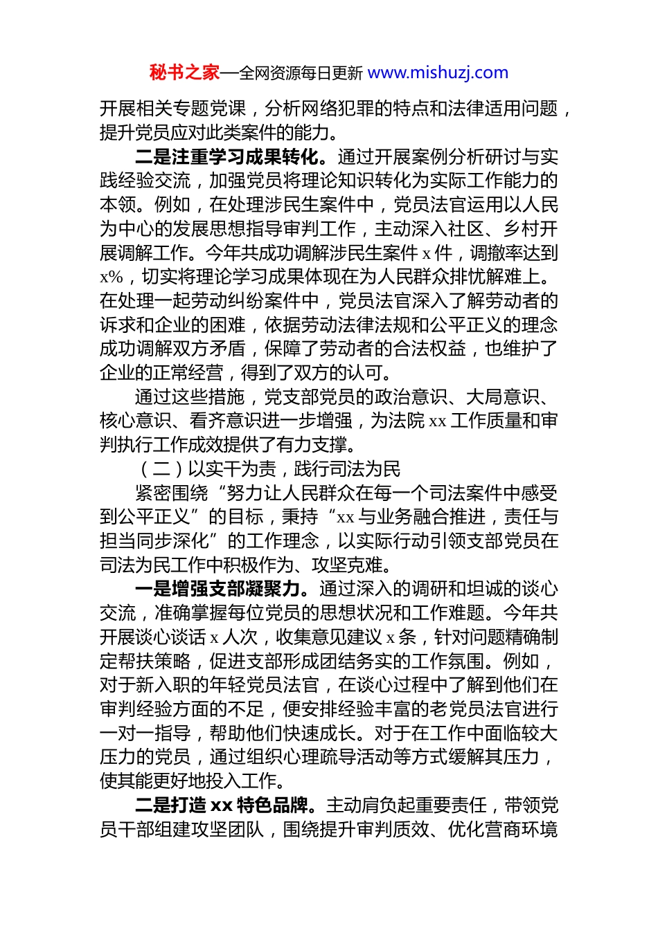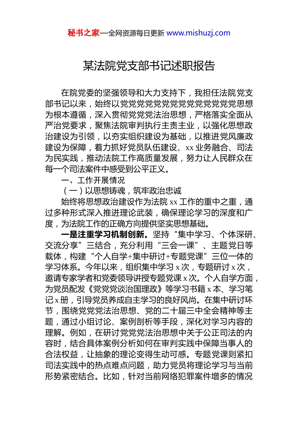 秘书之家—全网资源每日更新 www.mishuzj.com某法院党支部书记述职报告在院党委的坚强领导和大力支持下,我担任法院党支部书记以来,始终以党党党党党党党党党党党党党党思想为根本遵循,深入贯彻党党党法治思想,严格落实全面从严治党要求,聚焦法院审判执行主责主业,以强化思想政治建设为引领,以夯实组织建设为基础,以推进党风廉政建设为保障,着力抓好党员队伍建设、xx 业务融合、司法为民实践,推动法院工作高质量发展,努力让人民群众在每一个司法案件中感受到公平正义。一、工作开展情况(一)以思想铸魂,筑牢政治忠诚始终将思想政治建设作为法院 xx 工作的重中之重,通过多种形式深入推进理论武装,确保理论学习的深度和广度,为法院工作的正确方向提供坚实思想基础。一是注重学习机制创新。坚持“集中学习、个体深研、交流分享”三结合,充分利用“三会一课”、主题党日等载体,构建“个人自学+集中研讨+专题党课”三位一体的学习体系。今年以来,组织集中学习 x 次,专题研讨 x 次,邀请专家学者和党委领导讲授专题党课 x 次。个人自学方面,为党员配发《党党党谈治国理政》等学习书籍 x 本、学习笔记 x 册,引导党员养成自主学习的良好风尚。在集中研讨环节,围绕党党党法治思想、党的二十届三中全会精神等主题,通过小组讨论、案例剖析等手段,深化对学习内容的理解。例如,在研讨党党党法治思想中关于公正司法的内容时,结合具体案例分析如何在审判实践中保障当事人的合法权益,让抽象的理论变得生动可感。专题党课则紧扣司法实践中的热点难点问题,助力党员将理论学习与当前形势紧密结合。比如,针对当前网络犯罪案件增多的情况秘书之家—全网资源每日更新 www.mishuzj.com开展相关专题党课,分析网络犯罪的特点和法律适用问题,提升党员应对此类案件的能力。二是注重学习成果转化。通过开展案例分析研讨与实践经验交流,加强党员将理论知识转化为实际工作能力的本领。例如,在处理涉民生案件中,党员法官运用以人民为中心的发展思想指导审判工作,主动深入社区、乡村开展调解工作。今年共成功调解涉民生案件 x 件,调撤率达到x%,切实将理论学习成果体现在为人民群众排忧解难上。在处理一起劳动纠纷案件中,党员法官深入了解劳动者的诉求和企业的困难,依据劳动法律法规和公平正义的理念成功调解双方矛盾,保障了劳动者的合法权益,也维护了企业的正常经营,得到了双方的认可。通过这些措施,党支部党员的政治意识、大局意识、核心意识、看齐意识进一步增强,为法院 xx 工作质量和审判执行工作成效提供了有力支撑。(二)以实干为责,践行司法为民紧密围绕“努力让人民群众在每一个司法案件中感受到公平正义”的目标,秉持“xx 与业务融合推进,责任与担当同步深化”的工作理念,以实际行动引领支部党员在司法为民工作中积极作为、攻坚克难。一是增强支部凝聚力。通过深入的调研和坦诚的谈心交流,准确掌握每位党员的思想状况和工作难题。今年共开展谈心谈话 x 人次,收集意见建议 x 条,针对问题精确制定帮扶策略,促进支部形成团结务实的工作氛围。例如,对于新入职的年轻党员法官,在谈心过程中了解到他们在审判经验方面的不足,便安排经验丰富的老党员法官进行一对一指导,帮助他们快速成长。对于在工作中面临较大压力的党员,通过组织心理疏导活动等方式缓解其压力,使其能更好地投入工作。二是打造 xx 特色品牌。主动肩负起重要责任,带领党员干部组建攻坚团队,围绕提升审判质效、优化营商环境秘书之家—全网资源每日更新 www.mishuzj.com等重点课题开展深入调研和实践探索。今年,我院的平均审理周期缩短了 x 天,涉企案件办理效率显著提升,相关经验在全省法院系统得到推广。在优化营商环境方面,成立专门的涉企案件快速办理小组,简化立案流程,加强与企业的沟通协调,及时解决企业在诉讼过程中的问题。对于涉及重大项目建设的案件,开通绿色通道,优先审理,保障项目建设顺利进行。三是创新党群活动形式。坚持以高质量发展为导向,充分激发党员干部的积极性和创造力。组织了一场以“司法为民与公正司法”为主题的有奖知...