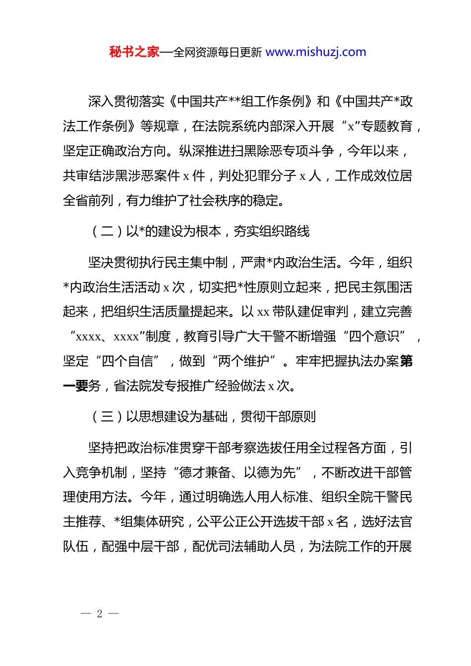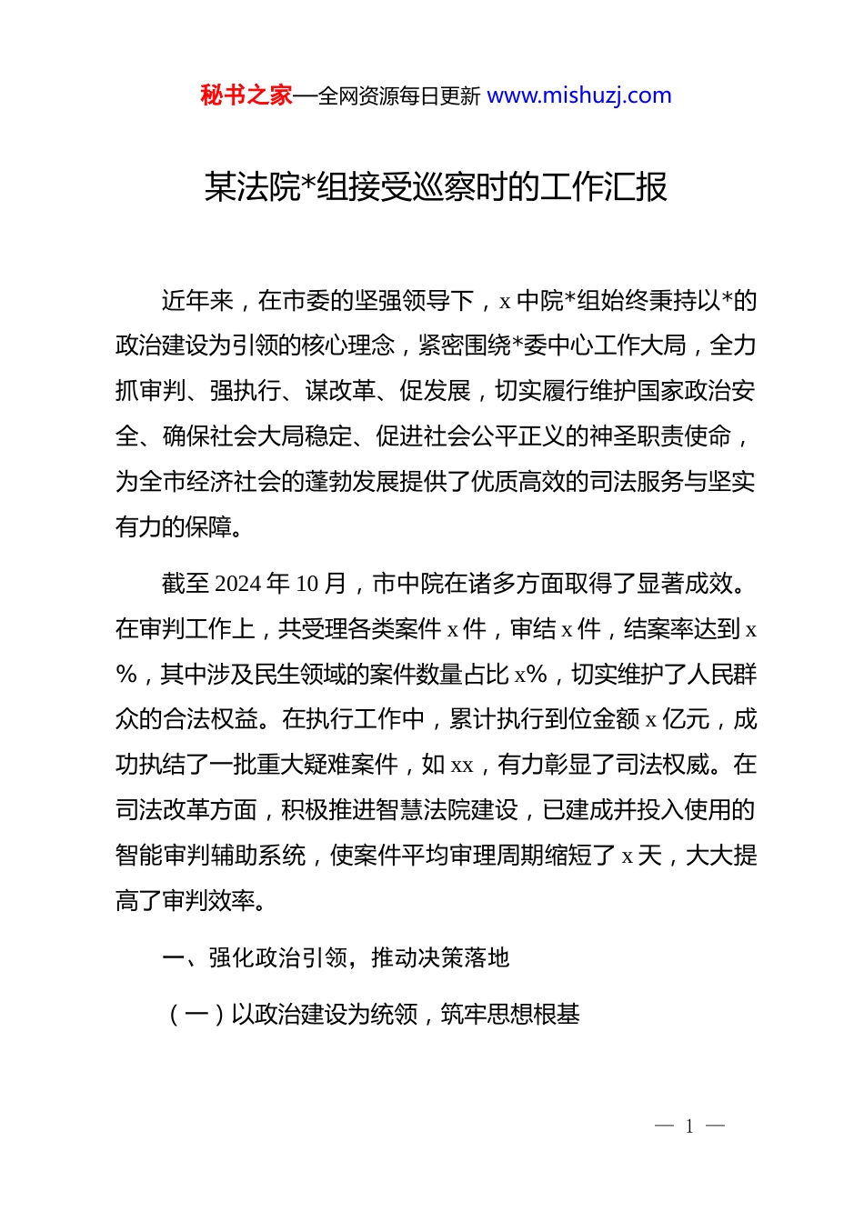 秘书之家—全网资源每日更新 www.mishuzj.com某法院*组接受巡察时的工作汇报近年来,在市委的坚强领导下,x 中院*组始终秉持以*的政治建设为引领的核心理念,紧密围绕*委中心工作大局,全力抓审判、强执行、谋改革、促发展,切实履行维护国家政治安全、确保社会大局稳定、促进社会公平正义的神圣职责使命,为全市经济社会的蓬勃发展提供了优质高效的司法服务与坚实有力的保障。截至 2024 年 10 月,市中院在诸多方面取得了显著成效。在审判工作上,共受理各类案件 x 件,审结 x 件,结案率达到 x%,其中涉及民生领域的案件数量占比 x%,切实维护了人民群众的合法权益。在执行工作中,累计执行到位金额 x 亿元,成功执结了一批重大疑难案件,如 xx,有力彰显了司法权威。在司法改革方面,积极推进智慧法院建设,已建成并投入使用的智能审判辅助系统,使案件平均审理周期缩短了 x 天,大大提高了审判效率。一、强化政治引领,推动决策落地(一)以政治建设为统领,筑牢思想根基— 1 —秘书之家—全网资源每日更新 www.mishuzj.com深入贯彻落实《中国共产**组工作条例》和《中国共产*政法工作条例》等规章,在法院系统内部深入开展“x”专题教育,坚定正确政治方向。纵深推进扫黑除恶专项斗争,今年以来,共审结涉黑涉恶案件 x 件,判处犯罪分子 x 人,工作成效位居全省前列,有力维护了社会秩序的稳定。(二)以*的建设为根本,夯实组织路线坚决贯彻执行民主集中制,严肃*内政治生活。今年,组织*内政治生活活动 x 次,切实把*性原则立起来,把民主氛围活起来,把组织生活质量提起来。以 xx 带队建促审判,建立完善“xxxx、xxxx”制度,教育引导广大干警不断增强“四个意识”,坚定“四个自信”,做到“两个维护”。牢牢把握执法办案第一要务,省法院发专报推广经验做法 x 次。(三)以思想建设为基础,贯彻干部原则坚持把政治标准贯穿干部考察选拔任用全过程各方面,引入竞争机制,坚持“德才兼备、以德为先”,不断改进干部管理使用方法。今年,通过明确选人用人标准、组织全院干警民主推荐、*组集体研究,公平公正公开选拔干部 x 名,选好法官队伍,配强中层干部,配优司法辅助人员,为法院工作的开展— 2 —秘书之家—全网资源每日更新 www.mishuzj.com提供了坚实的人才支撑。(四)以制度建设为抓手,压实主体责任制定《*组落实全面从严治*主体责任工作任务及责任清单》,督促各级主体责任落实到位。坚决落实全面从严治*主体责任,定期开展领导干部述职述廉评议和支部 xx 工作述职评议x 次。强势启动思想政治教育活动,统筹开展思想作风纪律整顿、深化纠正“四风”和作风纪律专项整治、“以案释德、以案释纪、以案释法”警示教育、“三个规定”专项整治等活动x 项;制定《x 市中级人民法院贯彻落实谈话制度实施细则》,健全完善约谈、通报、挂牌督办责任体系,做到真管真严、敢管敢严。(五)以司法改革为动力,提升审判效能全面深化司法体制改革,加强智慧法院建设,建立完善立案风险自动拦截系统、庭审巡查系统、审判风险防控系统、信访管理系统、舆情监控管理系统、“四类案件”监管平台、绩效考核平台等 x 个系统平台,形成了以权责清单为指引,以监管事项为目标,以信息科技为支撑,以绩效考核为手段的审判监督制约体系,努力实现审判权力与责任的平衡、放权与监督— 3 —秘书之家—全网资源每日更新 www.mishuzj.com的结合、公正与效率的统一,有效降低各类风险,提升办案质效,推进审判体系和审判能力现代化。今年以来,通过审判监督制约体系,成功拦截立案风险案件 x 件,纠正庭审违规行为 x次,信访案件数量同比下降 x%。二、对标查找不足,明确改进方向结合市委此次巡察,对标对表*中央全面从严治*的新要求、新部署和全面依法治国大背景下人民法院工作面临的新形势新任务,以及新时代人民群众司法新期待、新需求,院*组在把方向、管大局、保落实的领导作用发挥上还不够有力,在加强*的政治建设、组织建设、作风建设、*风廉政建设上距上级要求还有不少差距,不同程度影响和制约着全市法院建设发展。(一)思想建设有...