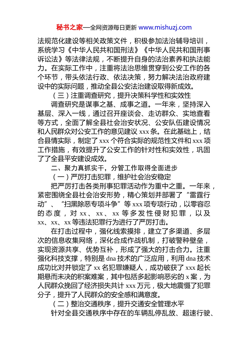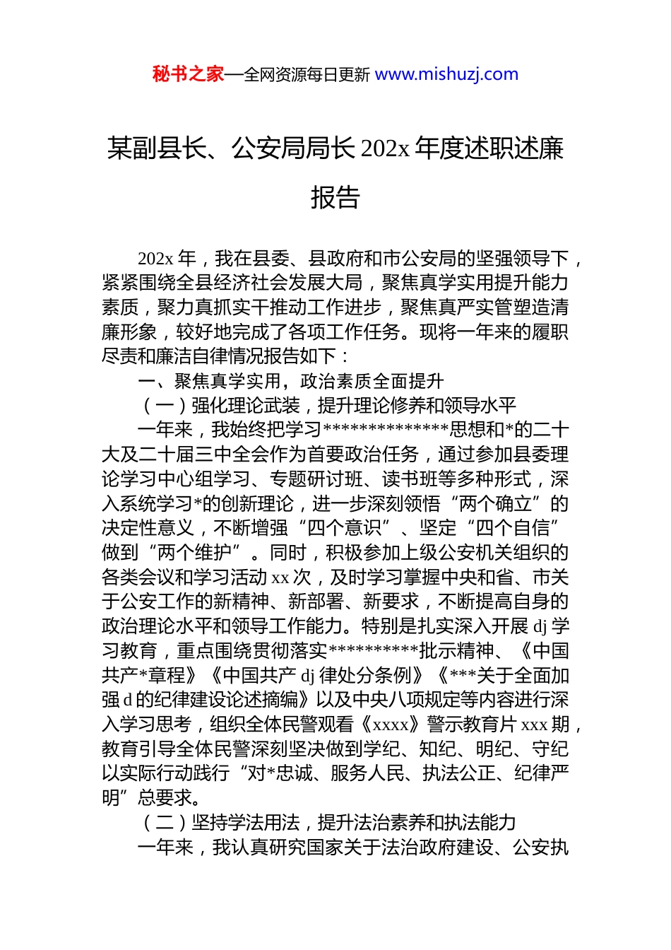 秘书之家—全网资源每日更新 www.mishuzj.com某副县长、公安局局长 202x 年度述职述廉报告202x 年,我在县委、县政府和市公安局的坚强领导下,紧紧围绕全县经济社会发展大局,聚焦真学实用提升能力素质,聚力真抓实干推动工作进步,聚焦真严实管塑造清廉形象,较好地完成了各项工作任务。现将一年来的履职尽责和廉洁自律情况报告如下:一、聚焦真学实用,政治素质全面提升(一)强化理论武装,提升理论修养和领导水平一年来,我始终把学习**************思想和*的二十大及二十届三中全会作为首要政治任务,通过参加县委理论学习中心组学习、专题研讨班、读书班等多种形式,深入系统学习*的创新理论,进一步深刻领悟“两个确立”的决定性意义,不断增强“四个意识”、坚定“四个自信”做到“两个维护”。同时,积极参加上级公安机关组织的各类会议和学习活动 xx 次,及时学习掌握中央和省、市关于公安工作的新精神、新部署、新要求,不断提高自身的政治理论水平和领导工作能力。特别是扎实深入开展 dj 学习教育,重点围绕贯彻落实**********批示精神、《中国共产*章程》《中国共产 dj 律处分条例》《***关于全面加强 d 的纪律建设论述摘编》以及中央八项规定等内容进行深入学习思考,组织全体民警观看《xxxx》警示教育片 xxx 期,教育引导全体民警深刻坚决做到学纪、知纪、明纪、守纪以实际行动践行“对*忠诚、服务人民、执法公正、纪律严明”总要求。(二)坚持学法用法,提升法治素养和执法能力一年来,我认真研究国家关于法治政府建设、公安执秘书之家—全网资源每日更新 www.mishuzj.com法规范化建设等相关政策文件,积极参加法治辅导培训,系统学习《中华人民共和国刑法》《中华人民共和国刑事诉讼法》等法律法规,不断提升自身的法治素养和执法能力。在实际工作中,注重将法治思维贯穿到公安工作的各个环节,带头依法行政、依法决策,努力解决法治政府建设中的实际问题,推动全县公安法治建设取得新成效。(三)注重调查研究,提升决策科学性和实效性调查研究是谋事之基、成事之道。一年来,坚持深入基层、深入一线,通过召开座谈会、走访群众、实地查看等方式,全面了解全县社会治安状况、公安队伍建设情况和人民群众对公安工作的意见建议 xxx 条。在此基础上,结合县情实际,制定了 xxx 个符合实际的规范性文件和 xxx 项工作措施,有效提升了公安工作的针对性和实效性,巩固了了全县平安建设成效。二、聚力真抓实干,分管工作取得全面进步(一)严厉打击犯罪,维护社会治安稳定把严厉打击各类刑事犯罪活动作为重中之重。一年来,紧密围绕全县社会治安形势,精心策划并部署了“雷霆行动”、“扫黑除恶专项斗争”等 xxx 项专项行动,以零容忍的 态 度 , 对 xx 、 xx 、 xx 等 多 发 性 侵 财 犯 罪 , 以 及xx、xx、xx 等违法犯罪行为进行了严厉打击。在打击过程中,强化线索摸排,建立了多渠道、多层次的信息收集网络,深化合成作战机制,打破警种壁垒,实现资源共享、优势互补,形成了强大的打击合力。注重强化科技支撑,特别是 dna 技术的广泛应用,利用 dna 技术成功比对并锁定了 xx 名犯罪嫌疑人,成功破获了 xxx 起长期悬而未决的积案难案,其中包括多起影响恶劣的 x 案,为人民群众挽回了经济损失共计 xxx 万元,极大地震慑了犯罪分子,提升了人民群众的安全感和满意度。(二)整治交通秩序,提升交通安全管理水平针对全县交通秩序中存在的车辆乱停乱放、超速行驶、秘书之家—全网资源每日更新 www.mishuzj.com酒驾醉驾等突出问题,我亲自挂帅,组织开展了“平安出行”、“酒驾醉驾专项整治”等 xxx 次交通秩序整治专项行动。行动中,加强了路面巡逻管控,增加了执勤警力,延长了巡逻时间,确保了对重点路段、重点时段的有效覆盖同时,严查各类交通违法行为,对酒驾醉驾、无证驾驶、超载超速等严重交通违法行为实行“零容忍”,坚决做到发现一起、查处一起,绝不姑息。在完善交通设施方面,积极协调相关部门,对全县的道路交通标志标线、信号灯隔离护栏等进行了全面排查和修缮,消除了多处交通安全隐患。...