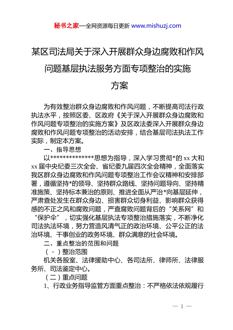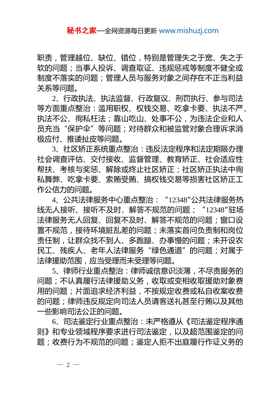秘书之家—全网资源每日更新 www.mishuzj.com某区司法局关于深入开展群众身边腐败和作风问题基层执法服务方面专项整治的实施方案为有效整治群众身边腐败和作风问题,不断提高司法行政执法水平,按照区委、区政府《关于深入开展群众身边腐败和作风问题专项整治的实施方案》及区政法委深入开展群众身边腐败和作风问题专项整治的活动安排,结合基层司法执法工作实际,制定本方案。一、指导思想以**************思想为指导,深入学习贯彻*的 xx 大和xx 届中央纪委三次全会、省纪委九届四次全会精神,全面落实我区群众身边腐败和作风问题专项整治工作会议精神和安排部署,遵循坚持*的领导、坚持群众路线、坚持问题导向、坚持精准施策、坚持标本兼治的原则、推进全面从严治*向基层延伸,严肃查处发生在群众身边、损害群众切身利益、影响群众获得感的不正之风和腐败问题,严查腐败问题背后的“关系网”和“保护伞”,切实强化基层执法专项整治措施落实,不断净化司法执法环境,努力营造风清气正的政治环境、公平公正的法治环境、干事创业的政务环境、群众满意的社会环境。二、重点整治的范围和问题(-)整治范围机关各股室、法律援助中心、各司法所、律师所、法律服务所、司法鉴定中心。(二)重点问题1、行政业务指导监管方面重点整治:不严格依法依规履行— 1 —秘书之家—全网资源每日更新 www.mishuzj.com职责,管理越位、缺位、错位,特别是管理失之于宽、失之于软的问题;当事人投诉、调查取证、违规惩戒等制度不健全或制度不落实的问题;管理人员与服务对象之间存在不正当利益关系等问题。2、行政执法、执法监督、行政复议、刑罚执行、参与司法等方面重点整治:滥用职权、权钱交易、吃拿卡要、执法不严、执法不公、徇私枉法;靠山吃山、处事不公,为违法企业和人员充当“保护伞”等问题;对待群众和被监管对象合理诉求消极应付、推诿扯皮等问题。3、社区矫正系统重点整治:违反法定程序和法定期限办理社会调查评估、交付接收、监督管理、教育矫正、社会适应性帮扶、考核与奖惩、解除或终止社区矫正;社区矫正执法中徇私舞弊、吃拿卡要、索贿受贿、搞权钱交易等损害社区矫正工作公信力的问题。4、公共法律服务中心重点整治:“12348”公共法律服务热线无人接听、接听不及时、解答不规范的问题;“12348”驻场法律服务无人回复、回复不及时、解答不规范的问题;窗口设置不规范,接待环境脏乱差的问题;未落实首问负责制和岗位责任制,让群众找不到人、多跑腿、办事慢的问题;未开设农民工、残疾人、老年人法律服务“绿色通道”的问题;对属于法律援助范围,应当受理而未受理等问题。5、律师行业重点整治:律师诚信意识淡薄,不尽责服务的问题;不认真履行法律援助义务,收取或变相收取援助对象费用的问题;片面追求经济利益,不按规定收费或私自收案收费的问题;律师违反规定向司法人员请客送礼甚至行贿以及其他一些影响司法公正的问题。6、司法鉴定行业重点整治:未严格遵从《司法鉴定程序通则》和专业领域程序要求进行司法鉴定,以及超范围鉴定的问题;收费行为不规范的问题;鉴定人拒不出庭履行作证义务的— 2 —秘书之家—全网资源每日更新 www.mishuzj.com问题;鉴定人私自接受委托、接受当事人吃请的问题;违反**和回避规定的问题;不配合管理机关监督检查等问题。7、基层法律服务行业重点整治:违反统一收案收费及财务专人管理制度,收费项目不公开、不按标准收费等问题;基层法律服务工作者私自收案收费、冒用律师名义办案,超越业务范围,搞不正当竞争,办案中诚信缺失、服务不尽责等问题。8、法律服务行业普遍整治:内部管理不规范,行业管理规范不具体、针对性不强的问题;态度“冷横硬”,敷衍塞责,推诿扯皮等问题;对不属于本机构服务范围的,一推了之,未正确指引相关服务的问题;行业 dj 工作未能有效覆盖,组织网络不健全,*组织战斗堡垒作用和*员先锋模范作用发挥不充分等问题。(三)整治措施1.广泛宣传发动。司法局专项整治工作小组办公室要紧紧结合扫黑除恶专项斗争、坚持走好群众路线,充分利用各类宣传媒介和平合,采用各种宣传方式和手段,畅...