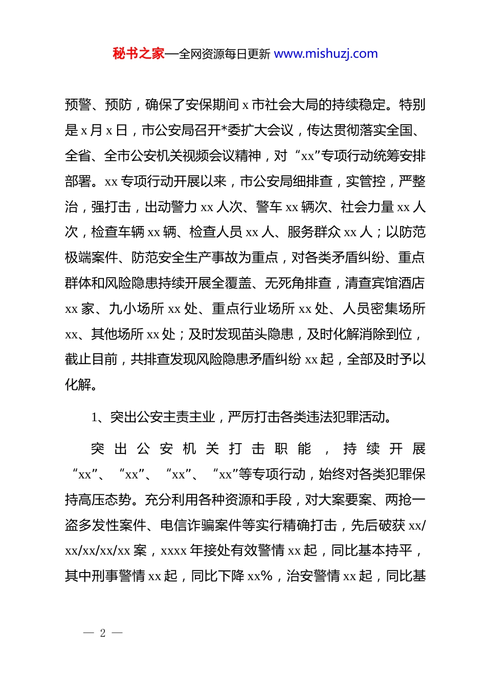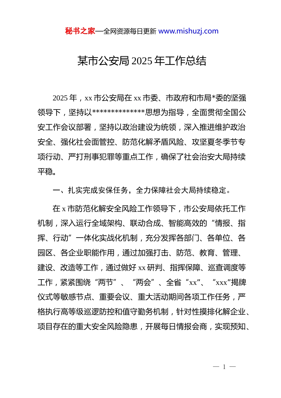 秘书之家—全网资源每日更新 www.mishuzj.com某市公安局 2025 年工作总结2025 年,xx 市公安局在 xx 市委、市政府和市局*委的坚强领导下,坚持以**************思想为指导,全面贯彻全国公安工作会议部署,坚持以政治建设为统领,深入推进维护政治安全、强化社会面管控、防范化解矛盾风险、攻坚夏冬季节专项行动、严打刑事犯罪等重点工作,确保了社会治安大局持续平稳。一、扎实完成安保任务,全力保障社会大局持续稳定。在 x 市防范化解安全风险工作领导下,市公安局依托工作机制,深入运行全域架构、联动合成、智能高效的“情报、指挥、行动”一体化实战化机制,充分发挥各部门、各单位、各园区、各企业职能作用,通过加强打击、防范、教育、管理、建设、改造等工作,通过做好 xx 研判、指挥保障、巡查调度等工作,紧紧围绕“两节”、“两会”、全省“xx”、“xxx”揭牌仪式等敏感节点、重要会议、重大活动期间各项工作任务,严格执行高等级巡逻防控和值守勤务机制,针对性摸排化解企业、项目存在的重大安全风险隐患,开展每日情报会商,实现预知、— 1 —秘书之家—全网资源每日更新 www.mishuzj.com预警、预防,确保了安保期间 x 市社会大局的持续稳定。特别是 x 月 x 日,市公安局召开*委扩大会议,传达贯彻落实全国、全省、全市公安机关视频会议精神,对“xx”专项行动统筹安排部署。xx 专项行动开展以来,市公安局细排查,实管控,严整治,强打击,出动警力 xx 人次、警车 xx 辆次、社会力量 xx 人次,检查车辆 xx 辆、检查人员 xx 人、服务群众 xx 人;以防范极端案件、防范安全生产事故为重点,对各类矛盾纠纷、重点群体和风险隐患持续开展全覆盖、无死角排查,清查宾馆酒店xx 家、九小场所 xx 处、重点行业场所 xx 处、人员密集场所xx、其他场所 xx 处;及时发现苗头隐患,及时化解消除到位,截止目前,共排查发现风险隐患矛盾纠纷 xx 起,全部及时予以化解。1、突出公安主责主业,严厉打击各类违法犯罪活动。突 出 公 安 机 关 打 击 职 能 , 持 续 开 展“xx”、“xx”、“xx”、“xx”等专项行动,始终对各类犯罪保持高压态势。充分利用各种资源和手段,对大案要案、两抢一盗多发性案件、电信诈骗案件等实行精确打击,先后破获 xx/xx/xx/xx/xx 案,xxxx 年接处有效警情 xx 起,同比基本持平,其中刑事警情 xx 起,同比下降 xx%,治安警情 xx 起,同比基— 2 —秘书之家—全网资源每日更新 www.mishuzj.com本持平;共立刑事案件 xx 起,同比下降 xx%,侦破 xx 起,同比上升 xx%,查处治安案件 xx 起,同比上升 xx%,打击处理xx 人,同比上升 xx%,挽回经济损失 xx 万元。三、强化治安立体防控,切实维护辖区治安平稳有序。市公安局积极开展夏季治安打击整治专项行动,紧盯治安难点、痛点,掀起严打严控、严管严治强大声势,通过采取设卡检查、集中清查、巡逻盘查等方式,全面开展治安清查、街面巡防、打击犯罪、交通管理等各项工作,全力打击涉及民生类犯罪、影响社会秩序和群众安全感的违法犯罪,累计共出动警力 xx 人次、出动警车 xx 辆次,设卡 xx 次,检查可疑车辆 xx辆,盘查可疑人员 xx 人,配合交警查获酒驾 xx 人、醉驾 xx 人,检查场所 xx 家,巡查重点部位 xx 处、重点行业场所 xx 家、人员密集场所 xx 处、检查重点单位 xx 家,发现整改安全隐患 xxx处;持续加强辖区对 xx/xx/xx/及 xx 家易制爆化学品使用、经营企业和 xx 家剧毒化学品使用企业、x 家加油站等重点部位、重点化工危爆企业、重点工程项目及校园安全督查,落实销售实名制登记和护校安园措施,今年以来开展督导检查 xxx 次,排查各类安全隐患 xxx 处,下发限期整改隐患通知书 xx 份,保证了安全可控;同时,市公安局采取“要害部位重点巡、密集场— 3 —秘书之家—全网资源每日更新 www.mishuzj.com所反复巡、衔接地段常态巡、偏僻地段流动巡”等措施,共出动 x 组车巡组,在辖区内 x/xx/xx/等人口聚集区以及其他犯罪分子可能渗透和隐藏的区域,开展全方位、全...