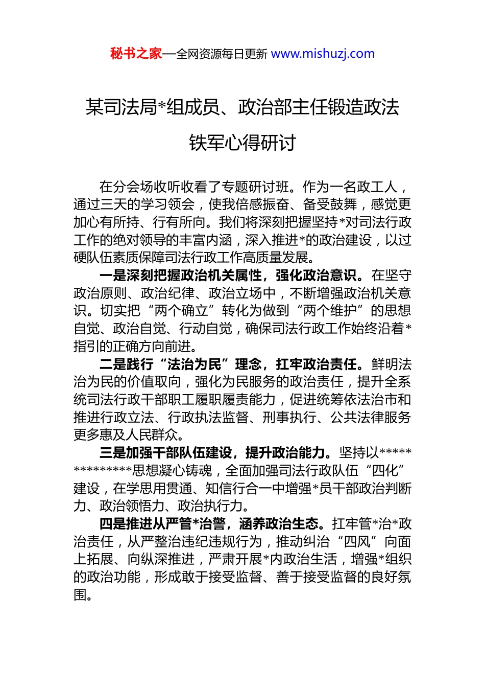 秘书之家—全网资源每日更新 www.mishuzj.com某司法局*组成员、政治部主任锻造政法铁军心得研讨在分会场收听收看了专题研讨班。作为一名政工人,通过三天的学习领会,使我倍感振奋、备受鼓舞,感觉更加心有所持、行有所向。我们将深刻把握坚持*对司法行政工作的绝对领导的丰富内涵,深入推进*的政治建设,以过硬队伍素质保障司法行政工作高质量发展。一是深刻把握政治机关属性,强化政治意识。在坚守政治原则、政治纪律、政治立场中,不断增强政治机关意识。切实把“两个确立”转化为做到“两个维护”的思想自觉、政治自觉、行动自觉,确保司法行政工作始终沿着*指引的正确方向前进。二是践行“法治为民”理念,扛牢政治责任。鲜明法治为民的价值取向,强化为民服务的政治责任,提升全系统司法行政干部职工履职履责能力,促进统筹依法治市和推进行政立法、行政执法监督、刑事执行、公共法律服务更多惠及人民群众。三是加强干部队伍建设,提升政治能力。坚持以**************思想凝心铸魂,全面加强司法行政队伍“四化”建设,在学思用贯通、知信行合一中增强*员干部政治判断力、政治领悟力、政治执行力。四是推进从严管*治警,涵养政治生态。扛牢管*治*政治责任,从严整治违纪违规行为,推动纠治“四风”向面上拓展、向纵深推进,严肃开展*内政治生活,增强*组织的政治功能,形成敢于接受监督、善于接受监督的良好氛围。