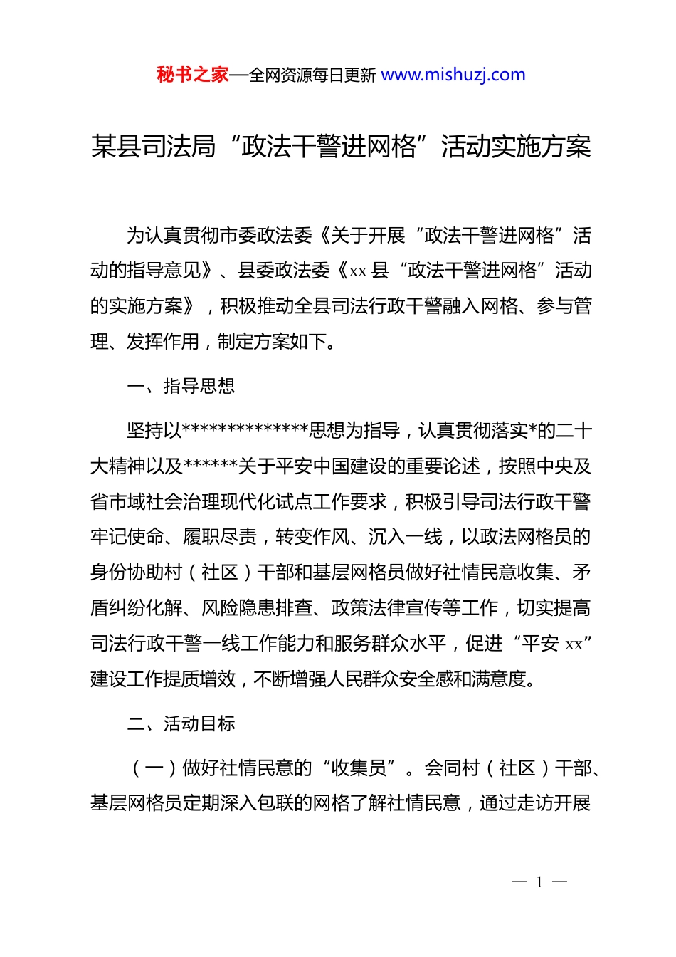 秘书之家—全网资源每日更新 www.mishuzj.com某县司法局“政法干警进网格”活动实施方案为认真贯彻市委政法委《关于开展“政法干警进网格”活动的指导意见》、县委政法委《xx 县“政法干警进网格”活动的实施方案》,积极推动全县司法行政干警融入网格、参与管理、发挥作用,制定方案如下。一、指导思想坚持以**************思想为指导,认真贯彻落实*的二十大精神以及******关于平安中国建设的重要论述,按照中央及省市域社会治理现代化试点工作要求,积极引导司法行政干警牢记使命、履职尽责,转变作风、沉入一线,以政法网格员的身份协助村(社区)干部和基层网格员做好社情民意收集、矛盾纠纷化解、风险隐患排查、政策法律宣传等工作,切实提高司法行政干警一线工作能力和服务群众水平,促进“平安 xx”建设工作提质增效,不断增强人民群众安全感和满意度。二、活动目标(一)做好社情民意的“收集员”。会同村(社区)干部、基层网格员定期深入包联的网格了解社情民意,通过走访开展— 1 —秘书之家—全网资源每日更新 www.mishuzj.com察民情、问民生等活动,切实把握群众所需所求所盼。坚持与群众同坐一条板凳,“面对面”交流,“心贴心”沟通,“点对点”服务,梳理汇集群众反映强烈的热点难点和痛点堵点问题。(二)做好矛盾纠纷的“调解员”。坚持学习发展新时代“枫桥经验”,主动排查网格内各类矛盾纠纷,积极参与调处化解,指导落实人民调解与检调、诉调、警调、访调等有效对接,推动矛盾纠纷排查在基层、防范在村组、化解在萌芽,实现就地解决。(三)做好社会治安的“维护员”。协助排查整治网格内社会治安突出问题和风险隐患,指导开展整改整治工作;推动加强辖区社会治安防范措施落实,提升智能化防控水平;强化特殊人群服务,帮助做好农村留守人员管理教育;组织群众开展群防群治活动;提升精细化治理水平。(四)做好司法便民的“服务员”。开展法治宣传教育,引导群众养成办事依法、遇事找法、解决问题用法、化解矛盾靠法的好习惯;主动对接担任网格内学校法治副校长,推动预防和减少青少年违法犯罪;有效衔接落实政法机关“惠民利企业十件实事”,为群众提供法律咨询、法律援助等服务,梳理— 2 —秘书之家—全网资源每日更新 www.mishuzj.com执法司法为民的良好形象。(五)做好政策法规的“宣讲员”。积极向群众宣讲*中央、国务院及省、市、县重要政策、重大部署,宣传政法工作、平安建设、社会治理工作要求、主要任务,加强部门职能职责和执法司法业务知识宣传普及,不断提升政法工作的宣传覆盖面、影响力。(六)做好平安建设的“引导员”。有效调动基层干部群众参与平安建设的积极性和主动性,着力提高平安 xx、法治 xx建设的知晓率、参与率和支持率,引导群众参与平安村(社区)、“平安家庭”以及无信访、无邪教、无毒品、无事故、无案件等创建活动;大力弘扬见义勇为精神,鼓励群众与不法行为做坚决斗争,助力提升基层社会治理能力,增强人民群众安全感和满意度。三、实施步骤(一)主动进网入格。积极与乡镇、村(社区)对接,选配素质高、能力强的干警担任“政法网格员”。(二)落实职责任务。政法网格员要主动协助基层网格员开展“网格管事”活动,每月进网格开展工作不少于 1 次,注— 3 —秘书之家—全网资源每日更新 www.mishuzj.com重发挥“懂法律、熟政策、会调解”等优势,促进网格管事、五老调事、支部说事、群众议事走深走实,推动“四事四权”工作法试点落实落地。(三)注重智治支撑。注重线上线下相结合。加强与村(社区)干部及基层网格员互动,主动加入“村(组)网格微信群”等服务群众的微信群,拉近服务群众距离。(四)开展成效测评。司法局将围绕进网入格、维护治安化解矛盾、消除隐患和联系群众、履职尽责等内容,通过电话随访、走访群众、接受群众评议等形式对工作成效进行评价,总结做法,推动工作开展。四、工作要求(一)加强组织领导。成立由 xx 县县司法局*组书记、局长任组长,*组班子成员任副组长、主任科员及各股室负责人为成员,领导小组办公室设在人民参与和促进法治股。(二)严实工作作风。司...