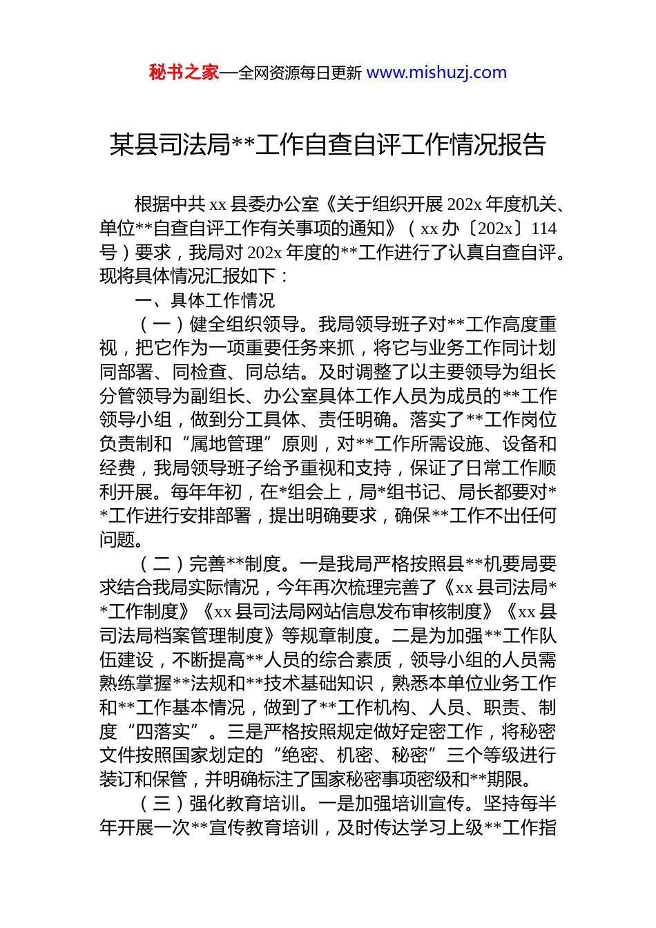 秘书之家—全网资源每日更新 www.mishuzj.com某县司法局**工作自查自评工作情况报告根据中共 xx 县委办公室《关于组织开展 202x 年度机关、单位**自查自评工作有关事项的通知》(xx 办〔202x〕114号)要求,我局对 202x 年度的**工作进行了认真自查自评。现将具体情况汇报如下:一、具体工作情况(一)健全组织领导。我局领导班子对**工作高度重视,把它作为一项重要任务来抓,将它与业务工作同计划同部署、同检查、同总结。及时调整了以主要领导为组长分管领导为副组长、办公室具体工作人员为成员的**工作领导小组,做到分工具体、责任明确。落实了**工作岗位负责制和“属地管理”原则,对**工作所需设施、设备和经费,我局领导班子给予重视和支持,保证了日常工作顺利开展。每年年初,在*组会上,局*组书记、局长都要对**工作进行安排部署,提出明确要求,确保**工作不出任何问题。(二)完善**制度。一是我局严格按照县**机要局要求结合我局实际情况,今年再次梳理完善了《xx 县司法局**工作制度》《xx 县司法局网站信息发布审核制度》《xx 县司法局档案管理制度》等规章制度。二是为加强**工作队伍建设,不断提高**人员的综合素质,领导小组的人员需熟练掌握**法规和**技术基础知识,熟悉本单位业务工作和**工作基本情况,做到了**工作机构、人员、职责、制度“四落实”。三是严格按照规定做好定密工作,将秘密文件按照国家划定的“绝密、机密、秘密”三个等级进行装订和保管,并明确标注了国家秘密事项密级和**期限。(三)强化教育培训。一是加强培训宣传。坚持每半年开展一次**宣传教育培训,及时传达学习上级**工作指秘书之家—全网资源每日更新 www.mishuzj.com示、文件和法规制度,要求大家牢固树立**工作重要性意识,切实按《**法》的规定做到不该讲的不讲,不该说的不说,促进**工作精准化和知悉范围最小化管理,做好日常工作中相关信息及数据材料的保管和存储,严防失密、泄密事件的发生。二是全局各股室进行**自查,自查工作从落实领导责任制、**制度建设、涉密文件信息资料管理、涉密计算机管理、网络管理、**介质载体的安全性等几个方面开展,让各股室工作人员在自查中发现问题、改正问题,最终促使全局干部职工在工作中牢固树立**为先意识。(四)加强人员管理。一是我局建立涉密人员管理台账并进行动态调整,对拟任(聘)用到涉密岗位工作的人员进行**教育并签订**承诺书。二是加强对涉密人员在岗、离岗的教育管理工作,**工作领导小组加强对**人员工作的业务指导和监督检查,督促其严格遵守**工作纪律,不在微信、qq 等新媒体传输国家秘密和工作秘密。三是各内设股室负责人要督促本部门涉密人员熟悉相关**事项,履行**职责,按照“谁使用,谁管理,谁负责”的原则,由使用部门负责对其进行日常**管理,确保涉密人员全覆盖、**责任落实不留死角。四是**审查工作应当遵循“事先审查、突出重点,谁公开、谁负责”的原则,既要防止属于国家秘密和危及国家安全、经济安全和社会稳定的政府信息,以及涉及商业秘密、个人隐私的政府信息被违规公开又要防止以**为理由,对不应当公开的政府信息实行封锁。(五)严格介质管理。一是加强对涉密计算机的**管理,正确设置保护口令,对网上公文的传递,做到了涉密计算机不联网,涉密文件不上网,上网文件不涉密,上网信息有审批有登记。把*政网与互联网实行物理隔离,加强涉密载体的**管理工作。对于计算机磁介质(软盘、u 盘、移动硬盘等)的管理,明确责任人、设备编号,采取专人保管、涉密文件单独存放,严禁携带存有涉密内容的磁介质到上网的计算机上加工、储存、传递处理文件。二是机关秘书之家—全网资源每日更新 www.mishuzj.com废纸、废文件的回收由**领导小组统一处理,有关文件按规定及时进行销毁。二、下步工作计划今后,我们将以这次自查自评为契机,坚持不懈地抓好对全体干部职工特别是涉密人员的教育管理,我们将进一步加大对**工作的宣传教育力度,加强业务培训和岗位训练,加强对计算机涉密工作的管理,不断完善规章制度强化**意识,坚决杜绝失泄密问题发生。