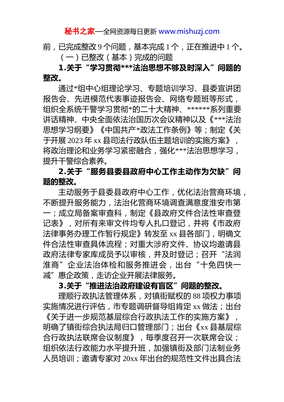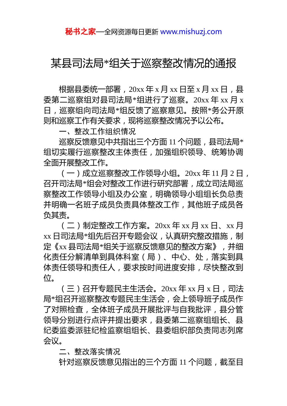 秘书之家—全网资源每日更新 www.mishuzj.com某县司法局*组关于巡察整改情况的通报根据县委统一部署,20xx 年 x 月 xx 日至 x 月 xx 日,县委第二巡察组对县司法局*组进行了巡察。20xx 年 xx 月 x日,巡察组向司法局*组反馈了巡察意见。按照*务公开原则和巡察工作有关要求,现将巡察整改情况予以公布。一、整改工作组织情况巡察反馈意见中共指出三个方面 11 个问题,县司法局*组切实履行巡察整改主体责任,加强组织领导、统筹协调全面开展整改工作。(一)成立巡察整改工作领导小组。20xx 年 11 月 2 日,召开司法局*组会对整改工作进行研究部署,成立司法局巡察整改工作领导小组及办公室,明确领导小组组长负总责并明确一名班子成员负责具体整改工作,其他班子成员各负其责。(二)制定整改工作方案。20xx 年 xx 月 xx 日、xx 月xx 日司法局*组先后召开专题会议,认真研究整改措施,制定《xx 县司法局*组关于巡察反馈意见的整改方案》,并细化责任分解清单到具体科室(局)、中心、处,落实到具体责任领导和责任人,要求按时间进度安排,尽快整改到位。(三)召开专题民主生活会。20xx 年 xx 月 x 日,司法局*组召开巡察整改专题民主生活会,会上领导班子成员作了对照检查,全体班子成员开展批评与自我批评,县分管领导分别进行点评并提出要求,县委第二巡察组组长、县纪委监委派驻纪检监察组组长、县委组织部负责同志列席会议。二、整改落实情况针对巡察反馈意见指出的三个方面 11 个问题,截至目秘书之家—全网资源每日更新 www.mishuzj.com前,已完成整改 9 个问题,基本完成 1 个,正在推进中 1 个。(一)已整改(基本)完成的问题1.关于“学习贯彻***法治思想不够及时深入”问题的整改。通过*组中心组理论学习、专题培训学习、县委宣讲团报告会、先进模范代表事迹报告会、网络专题班等形式,组织全系统干警学习贯彻*的二十大精神、******系列重要讲话精神、中央全面依法治国历次会议精神以及《***法治思想学习纲要》《中国共产*政法工作条例》等;制定《关于开展 2023 年 xx 县司法行政队伍主题培训的实施方案》,将政治理论和业务学习紧密融合,强化***法治思想学习,提升干警综合素养。2.关于“服务县委县政府中心工作主动作为欠缺”问题的整改。主动服务于县委县政府中心工作,优化法治营商环境,不断提升服务能力,法治化营商环境调查满意度淮安市第一;成立局备案审查科,制定《县政府文件合法性审查登记表》,对所有来审文件均专人扎口登记,并将《市政府法律事务办理工作暂行规定》转发至 xx 县各部门,明确文件合法性审查具体流程;对重大涉府文件、协议均邀请县政府法律专家库成员予以审核,并及时登记;召开“法润淮商”企业法治体检和服务推进会,出台“十免四快一减”惠企政策,走访企业开展法律服务。3.关于“推进法治政府建设有盲区”问题的整改。理顺行政执法管理体系,对镇街赋权的 88 项权力事项实施情况进行评估,市专题调研督导组肯定 xx 做法;出台《关于进一步规范基层综合行政执法工作的实施方案》,明确了镇街综合执法局归口管理部门;出台《xx 县基层综合行政执法联席会议制度》,每季度召开一次联席会议;组织依法行政能力水平提升班,加强镇街及部门法制业务人员培训;邀请专家对 20xx 年出台的规范性文件出具合法秘书之家—全网资源每日更新 www.mishuzj.com性审核意见,确保规范性文件制定合法合规。4.关于“公共法律服务体系建设有短板”问题的整改。强化法律服务人才建设,对 xx 县取得法律职业资格证并符合条件的人员 100%转为公职律师,同时鼓励本系统在职人员参加法考。抓好基层业务提升,召开“三台融合”联席会议,提升“三台融合”系统平台运用能力;强化智慧司法所平台登陆使用情况,20xx 年登陆使用率 100%;制定《xx 县一村(居)一法律顾问工作管理办法》,开展“一村一顾问”业务培训;推进“村村到”工程,已在 30个村(居)开展法治宣讲。加强社区矫正工作,举办业务工作培训班,出台《关于进一步做好社区矫正和安置帮教工作舆情突发事件应急处置的通知》,开...