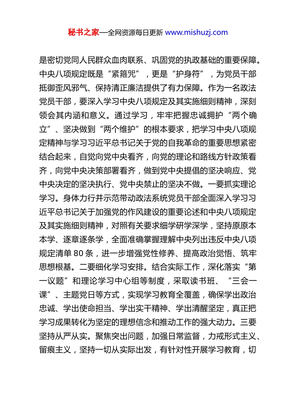 秘书之家—全网资源每日更新 www.mishuzj.com某县委常委、政法委书记 2025 年深入贯彻中央八项规定精神学习教育读书班作风建设集中研讨发言交流材料开展深入贯彻中央八项规定精神学习教育,是党中央立足全面建设社会主义现代化国家新征程关键阶段、把握百年未有之大变局作出的重大战略部署,既是巩固新时代十年作风建设成果的“深化工程”,也是以党的自我革命引领社会革命的“实践命题”,更是应对风险挑战、凝聚党心民心的“必答课题”。作为政法党员干部,要站在坚定拥护“两个确立”、坚决做到“两个维护”的政治高度,深刻认识开展学习教育的重大意义,切实把思想和行动统一到党中央决策部署、省市统一安排和县委具体要求上来,锲而不舍贯彻中央八项规定精神,推动作风建设常态化长效化,扎实做好防风险、保安全、护稳定、促发展各项工作,以永不懈怠的精神状态、一往无前的奋斗姿态、务实高效的工作作风,干字当头、奋勇争先,为奋力谱写中国式现代化建设 XX 实践新篇章贡献政法力量。下面,结合思想和工作实际,谈几点认识和体会。一、以学为先,在深思细悟中筑牢思想根基习近平总书记指出:“党的作风是党的形象,是观察党群干群关系、人心向背的晴雨表。党的作风正,人民的人心气顺,党和人民就能同甘共苦。”作风建设是党的建设的永恒主题,秘书之家—全网资源每日更新 www.mishuzj.com是密切党同人民群众血肉联系、巩固党的执政基础的重要保障。中央八项规定既是“紧箍咒”,更是“护身符”,为党员干部抵御歪风邪气、保持清正廉洁提供了有力保障。作为一名政法党员干部,要深入学习中央八项规定及其实施细则精神,深刻领会其内涵和意义。通过学习,牢牢把握忠诚拥护“两个确立”、坚决做到“两个维护”的根本要求,把学习中央八项规定精神与学习习近平总书记关于党的自我革命的重要思想紧密结合起来,自觉向党中央看齐,向党的理论和路线方针政策看齐,向党中央决策部署看齐,做到党中央提倡的坚决响应、党中央决定的坚决执行、党中央禁止的坚决不做。一要抓实理论学习。身体力行并示范带动政法系统党员干部全面深入学习习近平总书记关于加强党的作风建设的重要论述和中央八项规定及其实施细则精神,对照有关要求细学研学深学,坚持原原本本学、逐章逐条学,全面准确掌握理解中央列出违反中央八项规定清单 80 条,进一步增强党性修养、提高政治觉悟、筑牢思想根基。二要细化学习安排。结合实际工作,深化落实“第一议题”和理论学习中心组等制度,采取读书班、“三会一课”、主题党日等方式,实现学习教育全覆盖,确保学出政治忠诚、学出使命担当、学出实干精神、学出清醒坚定,真正把学习成果转化为坚定的理想信念和推动工作的强大动力。三要坚持从严从实。聚焦突出问题,加强日常监督,力戒形式主义、留痕主义,坚持一切从实际出发,有针对性开展学习教育,切秘书之家—全网资源每日更新 www.mishuzj.com实防止学习走过场,坚决防范形式化、套路化、表面化,真正让中央八项规定精神内化于心、外化于行。二、以学正风,在检视整改中坚守廉洁底线开展深入贯彻中央八项规定精神学习教育,是巩固深化主题教育和党纪学习教育成果、纵深推进全面从严治党的重要举措,是密切党群干群关系,巩固党的执政基础的必然要求,是深化政治机关建设,提升履职服务水平的有力保障。开展深入贯彻中央八项规定精神学习教育,关键在于强化作风建设。中央八项规定是新时代制定的第一部重要党内法规,是改进作风的切入口和动员令。一个“严”字,贯穿制定和落实全过程各方面。制定这一规定,指导思想就是从严要求,体现党要管党、全面从严治党。要坚持从严从实,对照中央八项规定及其实施细则,认真查摆自身存在的问题,深刻剖析自身在思想、作风、工作等方面存在的不足,坚持严的主基调不动摇,坚决刹住变异歪风,自觉抵制形式主义、官僚主义、享乐主义和奢靡之风,对违规违纪行为露头就打、从严查处,以制度约束的刚性正风肃纪,不断加固思想堤坝,做到心有所畏、言有所戒、行有所止,持续筑牢拒腐防变的思想防线。一要坚持问题导向,抓好查纠整改。深入查找、集中整治违反中央...