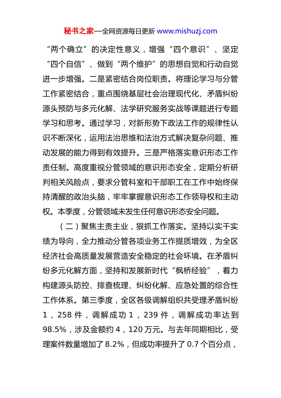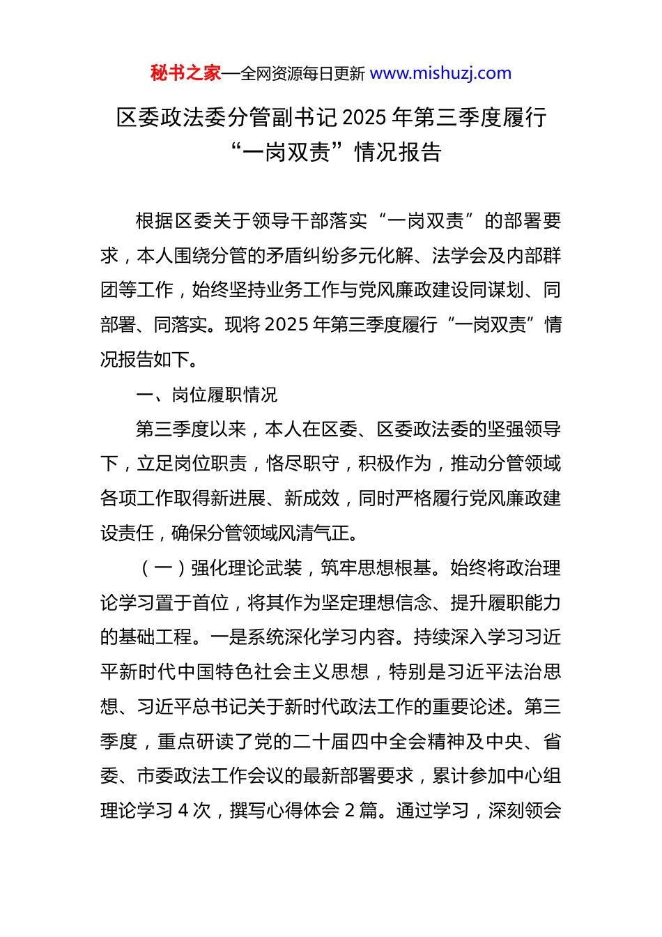 秘书之家—全网资源每日更新 www.mishuzj.com区委政法委分管副书记 2025 年第三季度履行“一岗双责”情况报告 根据区委关于领导干部落实“一岗双责”的部署要求,本人围绕分管的矛盾纠纷多元化解、法学会及内部群团等工作,始终坚持业务工作与党风廉政建设同谋划、同部署、同落实。现将 2025 年第三季度履行“一岗双责”情况报告如下。一、岗位履职情况第三季度以来,本人在区委、区委政法委的坚强领导下,立足岗位职责,恪尽职守,积极作为,推动分管领域各项工作取得新进展、新成效,同时严格履行党风廉政建设责任,确保分管领域风清气正。(一)强化理论武装,筑牢思想根基。始终将政治理论学习置于首位,将其作为坚定理想信念、提升履职能力的基础工程。一是系统深化学习内容。持续深入学习习近平新时代中国特色社会主义思想,特别是习近平法治思想、习近平总书记关于新时代政法工作的重要论述。第三季度,重点研读了党的二十届四中全会精神及中央、省委、市委政法工作会议的最新部署要求,累计参加中心组理论学习 4 次,撰写心得体会 2 篇。通过学习,深刻领会秘书之家—全网资源每日更新 www.mishuzj.com“两个确立”的决定性意义,增强“四个意识”、坚定“四个自信”、做到“两个维护”的思想自觉和行动自觉进一步增强。二是紧密结合岗位职责。将理论学习与分管工作紧密结合,重点围绕基层社会治理现代化、矛盾纠纷源头预防与多元化解、法学研究服务实战等课题进行专题学习和思考。通过学习,对新形势下政法工作的规律性认识不断深化,运用法治思维和法治方式解决复杂问题、推动发展的能力得到有效提升。三是严格落实意识形态工作责任制。高度重视分管领域的意识形态安全,定期分析研判相关风险点,要求分管科室和干部职工在工作中始终保持清醒的政治头脑,牢牢掌握意识形态工作领导权和主动权。本季度,分管领域未发生任何意识形态安全问题。(二)聚焦主责主业,狠抓工作落实。坚持以实干实绩为导向,全力推动分管各项业务工作提质增效,为全区经济社会高质量发展营造安全稳定的社会环境。在矛盾纠纷多元化解方面,坚持和发展新时代“枫桥经验”,着力构建源头防控、排查梳理、纠纷化解、应急处置的综合性工作体系。第三季度,全区各级调解组织共受理矛盾纠纷1 , 258 件 , 调 解 成 功 1 , 239 件 , 调 解 成 功 率 达 到98.5%,涉及金额约 4,120 万元。与去年同期相比,受理案件数量增加了 8.2%,但成功率提升了 0.7 个百分点,秘书之家—全网资源每日更新 www.mishuzj.com体现了调解工作质效的稳步提升。工作呈现以下特点:第一,纠纷类型相对集中。从统计数据看,物业管理、劳资争 议 、 婚 姻 家 庭 三 类 纠 纷 位 居 前 三 , 分 别 占 总 数 的21%、18%和 15%。这反映出当前城市化进程中社区治理、经济下行压力下劳动关系以及社会观念变迁带来的家庭关系等领域的矛盾较为突出。针对此情况,已指导区矛调中心联合住建、人社、妇联等部门,开展了 2 次专项排查和联合调解行动。第二,源头治理初见成效。深入推进“无讼社区(村)”创建活动,指导各镇(街道)完善社会矛盾风险评估预警机制。本季度,全区共排查出各类风险隐患 215 个,通过前置介入、主动调处,90%以上的隐患在萌芽状态得到化解,有效防止了“小矛盾”演变为“大问题”。第三,专业化调解能力增强。积极推动行业性、专业性人民调解委员会建设,本季度重点加强了在医疗、交通、知识产权等领域的调解力量。例如,成功调处了一起涉及 XX 高新技术产业园区某企业与外地公司的软件著作权纠纷,避免了长期的诉讼过程,为企业挽回了近500 万元的经济损失,保障了园区的良好营商环境。第四,智慧调解应用深化。依托市域社会治理现代化平台,积极推广线上“云调解”模式。第三季度,通过线上平台受理并成功调解纠纷 186 件,占总数的 14.8%,极大地方秘书之家—全网资源每日更新 www.mishuzj.com便了群众,提升了调解效率,这一做法顺应了全国范围内推广在线调解的趋势。在法学会工作方面,根据上级关于法学会工作应更加聚焦中...