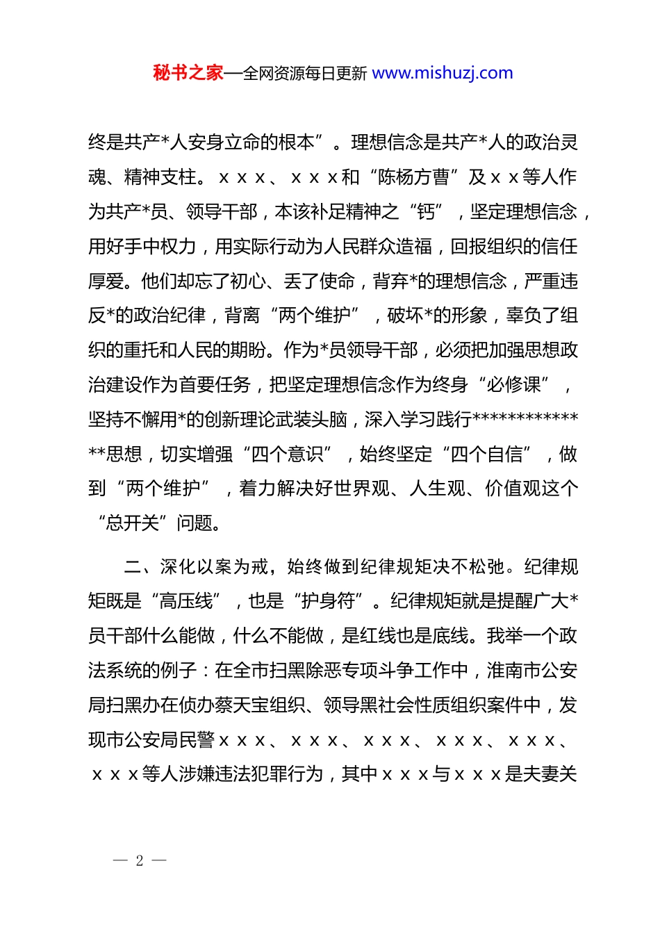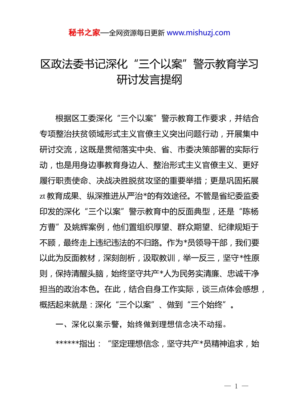 秘书之家—全网资源每日更新 www.mishuzj.com区政法委书记深化“三个以案”警示教育学习研讨发言提纲根据区工委深化“三个以案”警示教育工作要求,并结合专项整治扶贫领域形式主义官僚主义突出问题行动,开展集中研讨交流,这既是贯彻落实中央、省、市委决策部署的实际行动,也是用身边事教育身边人、整治形式主义官僚主义、更好履行职责使命、决战决胜脱贫攻坚的重要举措;更是巩固拓展zt 教育成果、纵深推进从严治*的有效途径。不管是省纪委监委印发的深化“三个以案”警示教育中的反面典型,还是“陈杨方曹”及姚辉案例,他们置组织厚望、群众期望、纪律规矩于不顾,最终走上违纪违法的不归路。作为*员领导干部,我们要以此为反面教材,深刻剖析,汲取教训,举一反三,坚守*性原则,保持清醒头脑,始终坚守共产*人为民务实清廉、忠诚干净担当的政治本色。在此,结合自身工作实际,谈三点体会感想,概括起来就是:深化“三个以案”、做到“三个始终”。一、深化以案示警,始终做到理想信念决不动摇。******指出:“坚定理想信念,坚守共产*员精神追求,始— 1 —秘书之家—全网资源每日更新 www.mishuzj.com终是共产*人安身立命的根本”。理想信念是共产*人的政治灵魂、精神支柱。xxx、xxx和“陈杨方曹”及xx等人作为共产*员、领导干部,本该补足精神之“钙”,坚定理想信念,用好手中权力,用实际行动为人民群众造福,回报组织的信任厚爱。他们却忘了初心、丢了使命,背弃*的理想信念,严重违反*的政治纪律,背离“两个维护”,破坏*的形象,辜负了组织的重托和人民的期盼。作为*员领导干部,必须把加强思想政治建设作为首要任务,把坚定理想信念作为终身“必修课”,坚持不懈用*的创新理论武装头脑,深入学习践行**************思想,切实增强“四个意识”,始终坚定“四个自信”,做到“两个维护”,着力解决好世界观、人生观、价值观这个“总开关”问题。二、深化以案为戒,始终做到纪律规矩决不松弛。纪律规矩既是“高压线”,也是“护身符”。纪律规矩就是提醒广大*员干部什么能做,什么不能做,是红线也是底线。我举一个政法系统的例子:在全市扫黑除恶专项斗争工作中,淮南市公安局扫黑办在侦办蔡天宝组织、领导黑社会性质组织案件中,发现市公安局民警xxx、xxx、xxx、xxx、xxx、xxx等人涉嫌违法犯罪行为,其中xxx与xxx是夫妻关— 2 —秘书之家—全网资源每日更新 www.mishuzj.com系,其明知xxx组织、领导的犯罪团伙具有一定的规模,且以实施违法犯罪为基本活动内容,仍然参与该犯罪团伙的资金管理。究其原因,就是xxx等人法纪意识淡薄,无视纪律红线,知法犯法、执法违法。该案例警示我们,如果把 dj 法规抛在脑后,就会丧失底线,破规矩、闯“红灯”,不断滑向危险边缘,甚至走上不归路。作为领导干部,必须坚持把纪律和规矩挺在前面,时刻绷紧纪律这根弦,严守*的“六项纪律”特别是政治纪律和政治规矩,常怀敬畏之心,做到敬畏法纪、敬畏规矩、敬畏权力、敬畏人民,远离底线,不踩“红线”,踏踏实实干事,干干净净做人,始终做一个讲政治、守纪律、懂规矩的明白人。三、深化以案促改,始终做到手中权力决不滥用。权力是把“双刃剑”,秉公为民用权,可以惠民利民、成就事业,公权滥用,则会害了自己。在刚才提到的案例中,xxx原系xx市公安局xxx分局刑警大队副大队长,作为打击黑恶势力的主要力量,本应成为社会正义的守护者,却在黑恶分子小恩小惠的拉拢腐蚀下,滥用职权,多次帮助犯罪团伙催要“欠款”,安排或默许民警xx、xxx等人以刑警队民警身份向多名受害者施压,迫使受害人向犯罪嫌疑人“协商”还款。***— 3 —秘书之家—全网资源每日更新 www.mishuzj.com***指出:“我们的权力是*和人民赋予的,是为*和人民做事用的,只能用来为*分忧、为国干事、为民谋利。”*员干部一定要牢固树立正确的权力观,珍惜权力、管好权力、慎用权力,始终牢记手中的权力是*和人民赋予的,要把对*和人民负责,要把为人民谋利益作为行使权力的出发点和归宿,绝不能把权力变成个人谋取私利的工具。作为领导干部...