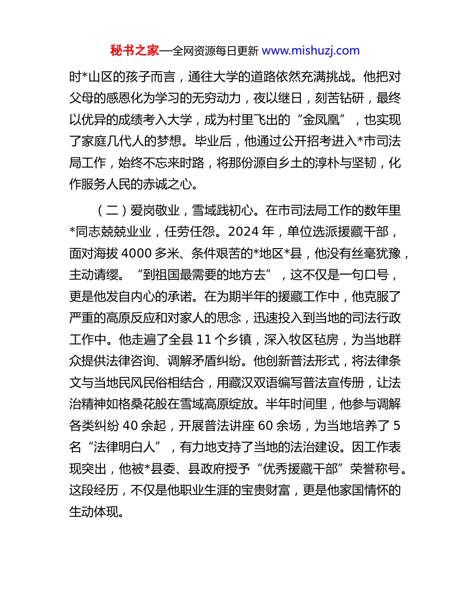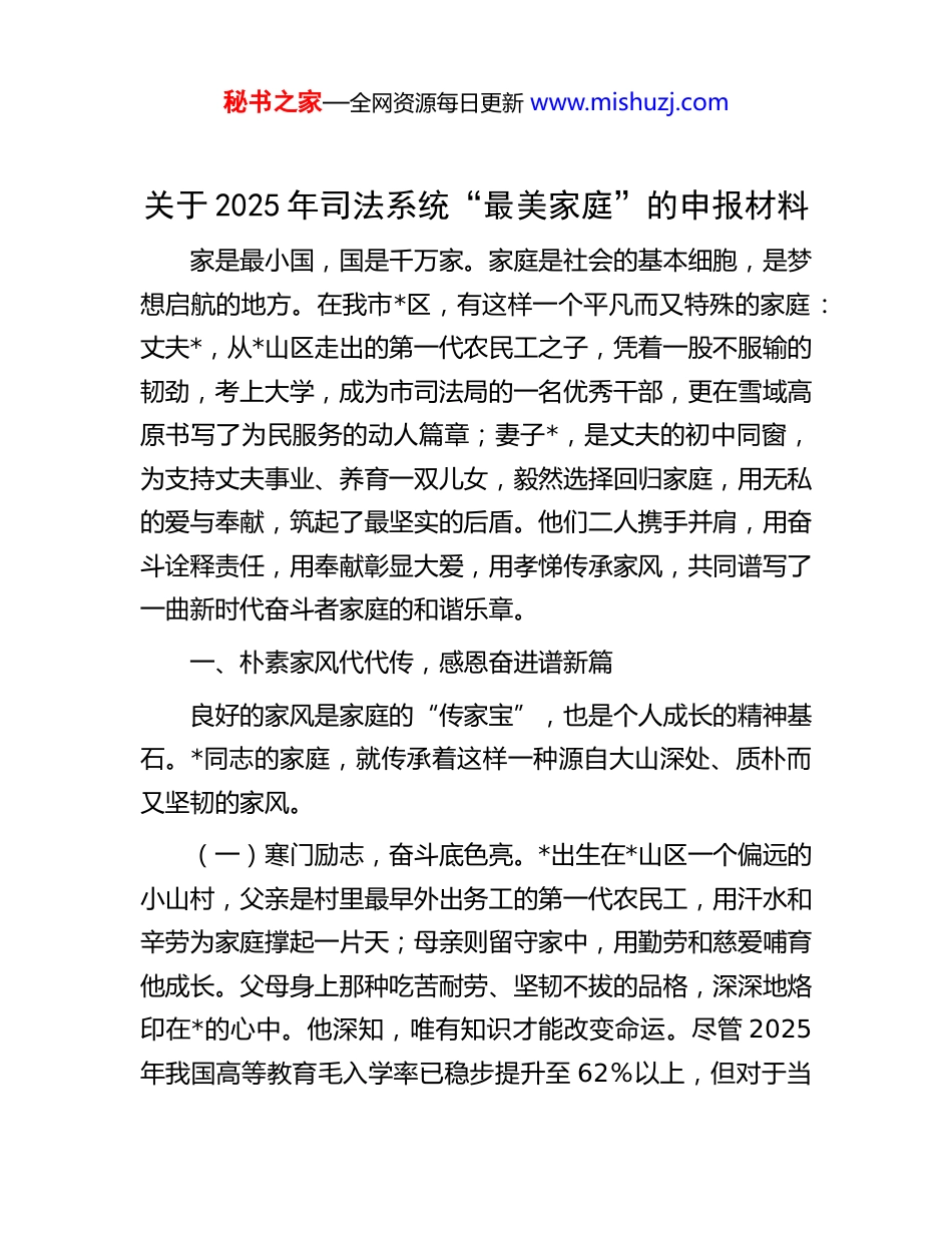 秘书之家—全网资源每日更新 www.mishuzj.com关于 2025 年司法系统“最美家庭”的申报材料家是最小国,国是千万家。家庭是社会的基本细胞,是梦想启航的地方。在我市*区,有这样一个平凡而又特殊的家庭:丈夫*,从*山区走出的第一代农民工之子,凭着一股不服输的韧劲,考上大学,成为市司法局的一名优秀干部,更在雪域高原书写了为民服务的动人篇章;妻子*,是丈夫的初中同窗,为支持丈夫事业、养育一双儿女,毅然选择回归家庭,用无私的爱与奉献,筑起了最坚实的后盾。他们二人携手并肩,用奋斗诠释责任,用奉献彰显大爱,用孝悌传承家风,共同谱写了一曲新时代奋斗者家庭的和谐乐章。一、朴素家风代代传,感恩奋进谱新篇良好的家风是家庭的“传家宝”,也是个人成长的精神基石。*同志的家庭,就传承着这样一种源自大山深处、质朴而又坚韧的家风。(一)寒门励志,奋斗底色亮。*出生在*山区一个偏远的小山村,父亲是村里最早外出务工的第一代农民工,用汗水和辛劳为家庭撑起一片天;母亲则留守家中,用勤劳和慈爱哺育他成长。父母身上那种吃苦耐劳、坚韧不拔的品格,深深地烙印在*的心中。他深知,唯有知识才能改变命运。尽管 2025年我国高等教育毛入学率已稳步提升至 62%以上,但对于当秘书之家—全网资源每日更新 www.mishuzj.com时*山区的孩子而言,通往大学的道路依然充满挑战。他把对父母的感恩化为学习的无穷动力,夜以继日,刻苦钻研,最终以优异的成绩考入大学,成为村里飞出的“金凤凰”,也实现了家庭几代人的梦想。毕业后,他通过公开招考进入*市司法局工作,始终不忘来时路,将那份源自乡土的淳朴与坚韧,化作服务人民的赤诚之心。(二)爱岗敬业,雪域践初心。在市司法局工作的数年里*同志兢兢业业,任劳任怨。2024 年,单位选派援藏干部,面对海拔 4000 多米、条件艰苦的*地区*县,他没有丝毫犹豫,主动请缨。“到祖国最需要的地方去”,这不仅是一句口号,更是他发自内心的承诺。在为期半年的援藏工作中,他克服了严重的高原反应和对家人的思念,迅速投入到当地的司法行政工作中。他走遍了全县 11 个乡镇,深入牧区毡房,为当地群众提供法律咨询、调解矛盾纠纷。他创新普法形式,将法律条文与当地民风民俗相结合,用藏汉双语编写普法宣传册,让法治精神如格桑花般在雪域高原绽放。半年时间里,他参与调解各类纠纷 40 余起,开展普法讲座 60 余场,为当地培养了 5名“法律明白人”,有力地支持了当地的法治建设。因工作表现突出,他被*县委、县政府授予“优秀援藏干部”荣誉称号。这段经历,不仅是他职业生涯的宝贵财富,更是他家国情怀的生动体现。秘书之家—全网资源每日更新 www.mishuzj.com(三)勤学不辍,提升促发展。进入市司法局工作后,他并未满足于已有的知识储备,而是始终保持勤学不辍的态度。面对不断变化的法律法规和日益复杂的司法工作,他利用业余时间参加各种法律培训和学习交流活动,不断提升自己的业务能力和综合素质。他深入研究司法实践中的热点难点问题,撰写了多篇有价值的调研文章,其中部分文章还在省级司法刊物上发表。同时,他还积极向单位的老同志请教,学习他们丰富的工作经验和处理问题的方法。通过不断学习和实践,他逐渐成长为单位的业务骨干,为更好地服务人民群众奠定了坚实的基础。二、夫妻同心相濡沫,言传身教育栋梁家庭的和睦与幸福,离不开夫妻双方的同心同德与经营。*与妻子*的爱情故事,始于青涩的少年时代,在岁月的沉淀中愈发醇厚。(一)相濡以沫,大爱无言。妻子*是*的初中同学,二人青梅竹马,感情笃深。她见证了丈夫从一个山村少年到国家干部的全部奋斗历程,也始终是丈夫最坚定的支持者。大学毕业后,她也曾有自己的职业规划和人生梦想。然而,随着两个孩子的相继出生,特别是丈夫援藏期间,家庭的重担完全落在了她一个人肩上。为了让丈夫安心工作,为了给孩子们创造一个稳定温馨的成长环境,她毅然做出了巨大的人生抉择——放秘书之家—全网资源每日更新 www.mishuzj.com弃自己的职业发展,成为一名全职母亲。她从未有过一句怨言,日复一日,用柔弱的肩膀挑起了家庭的重担,将柴米油盐的平淡...