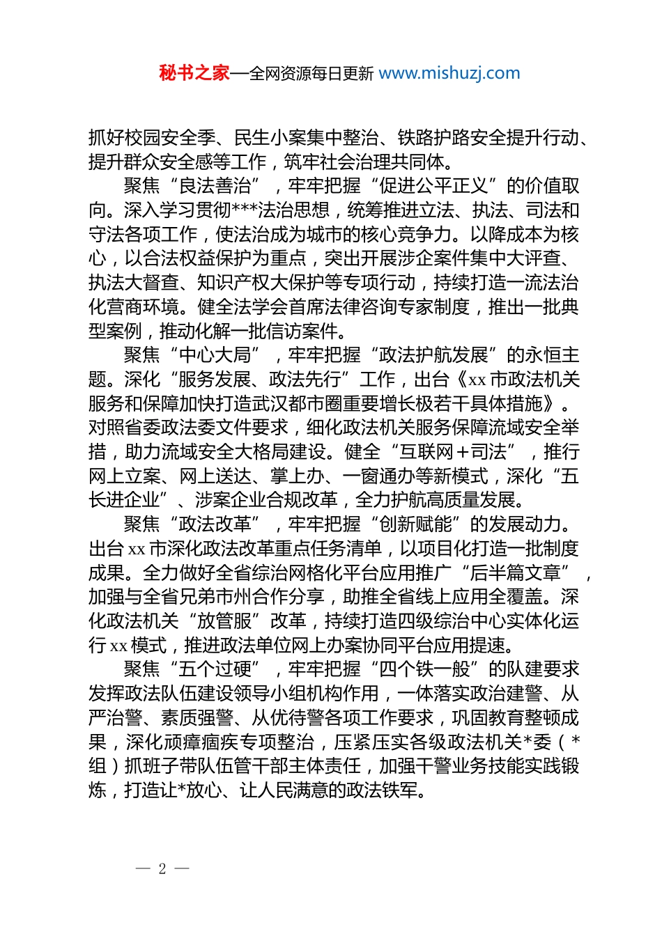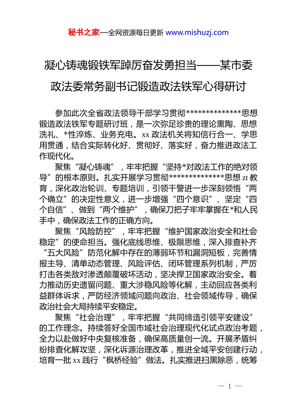 秘书之家—全网资源每日更新 www.mishuzj.com凝心铸魂锻铁军踔厉奋发勇担当——某市委政法委常务副书记锻造政法铁军心得研讨参加此次全省政法领导干部学习贯彻**************思想锻造政法铁军专题研讨班,是一次弥足珍贵的理论熏陶、思想洗礼、*性淬炼、业务充电。xx 政法机关将知信行合一、学思用贯通,结合实际转化好、贯彻好、落实好,奋力推进政法工作现代化。聚焦“凝心铸魂”,牢牢把握“坚持*对政法工作的绝对领导”的根本原则。扎实开展学习贯彻**************思想 zt 教育,深化政治轮训、专题培训,引领干警进一步深刻领悟“两个确立”的决定性意义,进一步增强“四个意识”、坚定“四个自信”、做到“两个维护”,确保刀把子牢牢掌握在*和人民手中,确保政法工作的正确方向。聚焦“风险防控”,牢牢把握“维护国家政治安全和社会稳定”的使命担当。强化底线思维、极限思维,深入排查补齐“五大风险”防范化解中存在的薄弱环节和漏洞短板,完善情报主导、清单动态管理、风险评估、闭环管理系列机制,严厉打击各类敌对渗透颠覆破坏活动,坚决捍卫国家政治安全。着力推动历史遗留问题、重大涉稳风险等化解,主动回应各类利益群体诉求,严防经济领域问题向政治、社会领域传导,确保政治社会大局持续平安稳定。聚焦“社会治理”,牢牢把握“共同缔造引领平安建设”的工作理念。持续答好全国市域社会治理现代化试点政治考题,全力以赴做好中央复核准备,确保高质量创一流。开展矛盾纠纷排查化解攻坚,深化诉源治理改革,推进全域平安创建行动,培育一批 xx 践行“枫桥经验”做法。扎实推进扫黑除恶,统筹— 1 —秘书之家—全网资源每日更新 www.mishuzj.com抓好校园安全季、民生小案集中整治、铁路护路安全提升行动、提升群众安全感等工作,筑牢社会治理共同体。聚焦“良法善治”,牢牢把握“促进公平正义”的价值取向。深入学习贯彻***法治思想,统筹推进立法、执法、司法和守法各项工作,使法治成为城市的核心竞争力。以降成本为核心,以合法权益保护为重点,突出开展涉企案件集中大评查、执法大督查、知识产权大保护等专项行动,持续打造一流法治化营商环境。健全法学会首席法律咨询专家制度,推出一批典型案例,推动化解一批信访案件。聚焦“中心大局”,牢牢把握“政法护航发展”的永恒主题。深化“服务发展、政法先行”工作,出台《xx 市政法机关服务和保障加快打造武汉都市圈重要增长极若干具体措施》。对照省委政法委文件要求,细化政法机关服务保障流域安全举措,助力流域安全大格局建设。健全“互联网+司法”,推行网上立案、网上送达、掌上办、一窗通办等新模式,深化“五长进企业”、涉案企业合规改革,全力护航高质量发展。聚焦“政法改革”,牢牢把握“创新赋能”的发展动力。出台 xx 市深化政法改革重点任务清单,以项目化打造一批制度成果。全力做好全省综治网格化平台应用推广“后半篇文章”,加强与全省兄弟市州合作分享,助推全省线上应用全覆盖。深化政法机关“放管服”改革,持续打造四级综治中心实体化运行 xx 模式,推进政法单位网上办案协同平台应用提速。聚焦“五个过硬”,牢牢把握“四个铁一般”的队建要求发挥政法队伍建设领导小组机构作用,一体落实政治建警、从严治警、素质强警、从优待警各项工作要求,巩固教育整顿成果,深化顽瘴痼疾专项整治,压紧压实各级政法机关*委(*组)抓班子带队伍管干部主体责任,加强干警业务技能实践锻炼,打造让*放心、让人民满意的政法铁军。— 2 —
