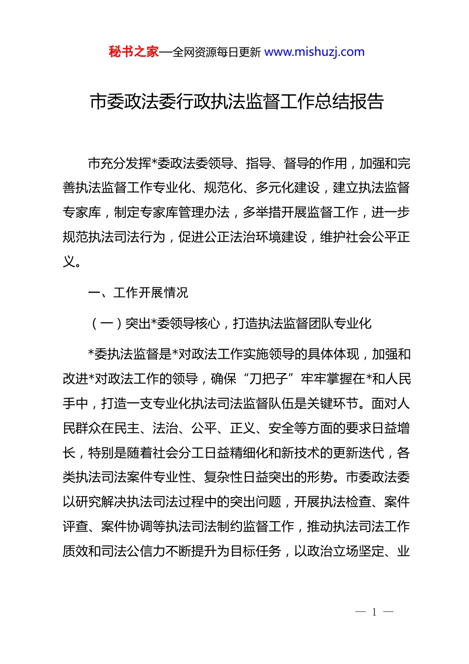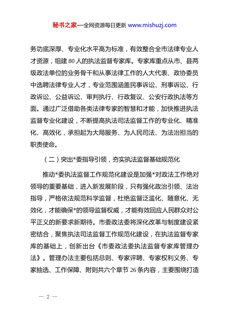 秘书之家—全网资源每日更新 www.mishuzj.com市委政法委行政执法监督工作总结报告市充分发挥*委政法委领导、指导、督导的作用,加强和完善执法监督工作专业化、规范化、多元化建设,建立执法监督专家库,制定专家库管理办法,多举措开展监督工作,进一步规范执法司法行为,促进公正法治环境建设,维护社会公平正义。一、工作开展情况(一)突出*委领导核心,打造执法监督团队专业化*委执法监督是*对政法工作实施领导的具体体现,加强和改进*对政法工作的领导,确保“刀把子”牢牢掌握在*和人民手中,打造一支专业化执法司法监督队伍是关键环节。面对人民群众在民主、法治、公平、正义、安全等方面的要求日益增长,特别是随着社会分工日益精细化和新技术的更新迭代,各类执法司法案件专业性、复杂性日益突出的形势。市委政法委以研究解决执法司法过程中的突出问题,开展执法检查、案件评查、案件协调等执法司法制约监督工作,推动执法司法工作质效和司法公信力不断提升为目标任务,以政治立场坚定、业— 1 —秘书之家—全网资源每日更新 www.mishuzj.com务功底深厚、专业化水平高为标准,有效整合全市法律专业人才资源,组建 80 人的执法监督专家库。专家库重点从市、县两级政法单位的业务骨干和从事法律工作的人大代表、政协委员中选聘法律专业人才,专业范围涵盖民事诉讼、刑事诉讼、行政诉讼、公益诉讼、审判执行、行政复议、公安行政执法等方面。通过广泛借助各类法律专家的智慧和才能,加快推进执法监督专业化建设,不断提高执法司法监督工作的专业化、精准化、高效化,承担起为大局服务、为人民司法、为法治担当的职责使命。(二)突出*委指导引领,夯实执法监督基础规范化推动*委执法监督工作规范化建设是加强*对政法工作绝对领导的重要基础,进入新发展阶段,只有强化政治引领、法治指导,严格依法规范科学监督,杜绝监督泛滥化、随意化、无效化,才能确保*的领导监督权威,才能有效回应人民群众对公平正义的新要求新期待。市委政法委将深化改革与制度建设紧密结合,聚焦执法司法监督工作规范化建设,在执法监督专家库的基础上,创新出台《市委政法委执法监督专家库管理办法》。管理办法主要包括总则、专家评聘、专家权利义务、专家抽选、工作保障、附则共六个章节 26 条内容,主要围绕打造— 2 —秘书之家—全网资源每日更新 www.mishuzj.com高水平的法律专家团队,规范改善执法监督工作管理机制,切实提高执法司法监督能力,明确了建设专家库的目的、专家的入库标准、职责与权利,规范了专家库的使用和管理,完善了执法监督的工作举措、工作保障等。管理办法的出台,有利于避免执法监督工作的随意性和盲目性,提升监督工作的质量、效率和权威;有利于强化执法监督工作的前瞻性和针对性,确保监督工作具备合法、合理、科学、协调、稳定、持续等诸多属性;有利于提升执法监督工作的公正性和客观性,充分发挥专家团队的法律专业和实践经验优势。(三)突出*委督导检查,锻造执法监督模式多元化执法监督工作是*委掌握和了解政法部门执法司法状况的有效途径,推进执法监督体系多元化建设,是发现、整改执法司法突出问题的有力抓手,更是助推、保障经济社会高质量发展的重要举措。市委政法委依托执法监督专家库,根据管理办法规定抽调专家,采取复杂案件集中评查、突出问题执法检查、重大案件协调处置等举措,构建多元化执法监督新格局,在查纠执法司法典型问题,规范执法司法行为,促进公正法治环境建设上成效明显。2024 年以来,共抽调执法监督专家 31 人,对230 件复杂案件进行集中评查,案件类型涵盖民商事纠纷、刑— 3 —秘书之家—全网资源每日更新 www.mishuzj.com事纠纷、行政纠纷、审判执行、行政执法案件等,发现各类案件问题 76 项。共组织专家 40 余人次,对九项 17 条执法司法突出问题开展实地执法检查督导,对 10 余起中央、省委政法委交办、督办案件、涉法涉诉信访案、群众反映强烈、社会高度关注的案事件进行协调处置。为保障执法监督工作的科学性、一致性,*委政法委依据中央、省级政法部门出台的有关法律法规,并结合各政法部门的...
