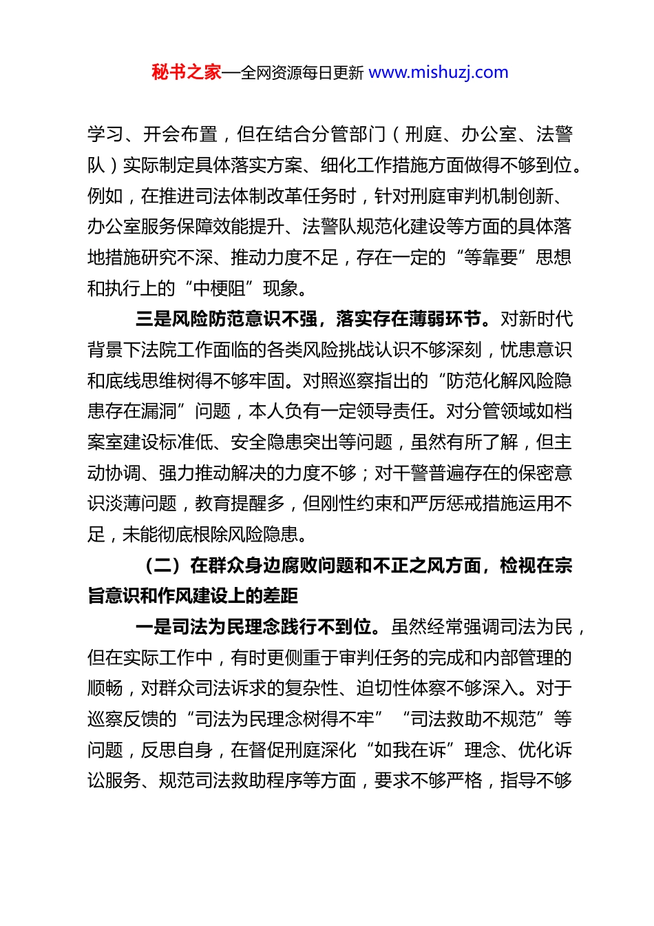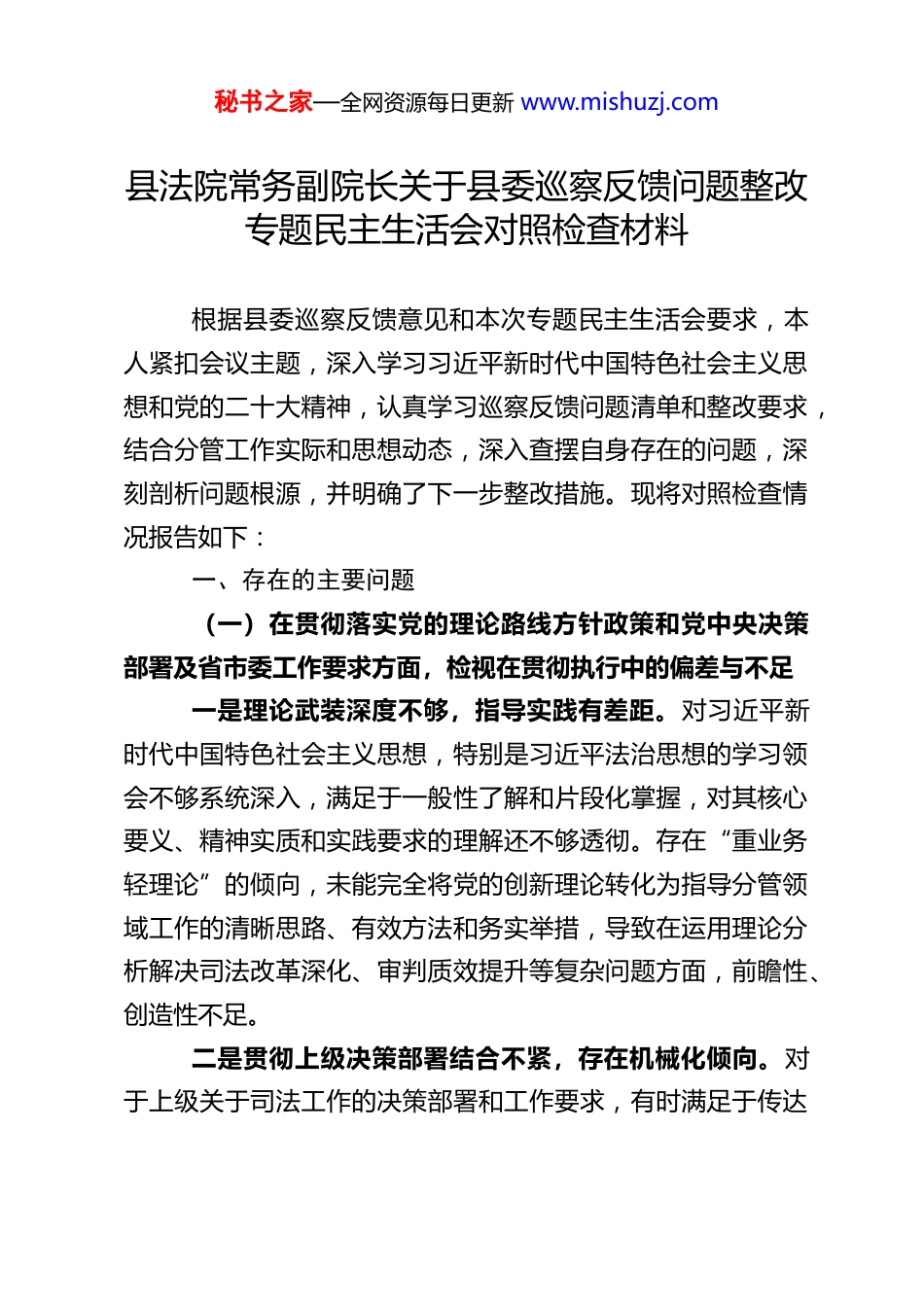 秘书之家—全网资源每日更新 www.mishuzj.com县法院常务副院长关于县委巡察反馈问题整改专题民主生活会对照检查材料根据县委巡察反馈意见和本次专题民主生活会要求,本人紧扣会议主题,深入学习习近平新时代中国特色社会主义思想和党的二十大精神,认真学习巡察反馈问题清单和整改要求,结合分管工作实际和思想动态,深入查摆自身存在的问题,深刻剖析问题根源,并明确了下一步整改措施。现将对照检查情况报告如下:一、存在的主要问题(一)在贯彻落实党的理论路线方针政策和党中央决策部署及省市委工作要求方面,检视在贯彻执行中的偏差与不足一是理论武装深度不够,指导实践有差距。对习近平新时代中国特色社会主义思想,特别是习近平法治思想的学习领会不够系统深入,满足于一般性了解和片段化掌握,对其核心要义、精神实质和实践要求的理解还不够透彻。存在“重业务轻理论”的倾向,未能完全将党的创新理论转化为指导分管领域工作的清晰思路、有效方法和务实举措,导致在运用理论分析解决司法改革深化、审判质效提升等复杂问题方面,前瞻性、创造性不足。二是贯彻上级决策部署结合不紧,存在机械化倾向。对于上级关于司法工作的决策部署和工作要求,有时满足于传达秘书之家—全网资源每日更新 www.mishuzj.com学习、开会布置,但在结合分管部门(刑庭、办公室、法警队)实际制定具体落实方案、细化工作措施方面做得不够到位。例如,在推进司法体制改革任务时,针对刑庭审判机制创新、办公室服务保障效能提升、法警队规范化建设等方面的具体落地措施研究不深、推动力度不足,存在一定的“等靠要”思想和执行上的“中梗阻”现象。三是风险防范意识不强,落实存在薄弱环节。对新时代背景下法院工作面临的各类风险挑战认识不够深刻,忧患意识和底线思维树得不够牢固。对照巡察指出的“防范化解风险隐患存在漏洞”问题,本人负有一定领导责任。对分管领域如档案室建设标准低、安全隐患突出等问题,虽然有所了解,但主动协调、强力推动解决的力度不够;对干警普遍存在的保密意识淡薄问题,教育提醒多,但刚性约束和严厉惩戒措施运用不足,未能彻底根除风险隐患。(二)在群众身边腐败问题和不正之风方面,检视在宗旨意识和作风建设上的差距一是司法为民理念践行不到位。虽然经常强调司法为民,但在实际工作中,有时更侧重于审判任务的完成和内部管理的顺畅,对群众司法诉求的复杂性、迫切性体察不够深入。对于巡察反馈的“司法为民理念树得不牢”“司法救助不规范”等问题,反思自身,在督促刑庭深化“如我在诉”理念、优化诉讼服务、规范司法救助程序等方面,要求不够严格,指导不够秘书之家—全网资源每日更新 www.mishuzj.com具体,导致个别案件办理效果和社会效果未能达到最佳统一,司法救助的精准性、规范性有待提高。二是工作作风不够扎实深入。存在一定的官僚主义和形式主义倾向。忙于事务性工作多,深入审判一线、深入干警、深入群众调查研究不够经常,对分管部门存在的深层次问题掌握不够全面精准。例如,对于办公室收发文办理不严谨、效率不高等作风问题,未能及时发现并有效纠治;对于干警反映的一些实际困难和问题,有时解决不够彻底、及时。三是纪律规矩执行刚性不足。对分管部门的干警日常教育监督管理偏重于工作业绩,对纪律作风的常态化监督检查抓得不够紧、不够严。对于巡察指出的“纪律作风执行不严”等问题,虽然进行了强调,但在动真碰硬、严肃查处方面存在失之于宽、失之于软的情况。对一些苗头性、倾向性问题,提醒、批评多,运用监督执纪“第一种形态”不够充分,未能形成足够的震慑效应。(三)在贯彻落实新时代党的组织路线方面,检视在发挥政治功能和组织力上的不足一是分管部门党组织政治功能发挥不充分。作为分管领导,对刑庭、办公室、法警队党支部建设的指导和支持力度有待加强。未能完全将抓党建与抓业务紧密结合起来,存在“两张皮”现象。指导党支部落实“三会一课”、组织生活会等制度有时流于形式,未能充分发挥党支部在政治引领、凝聚人心、秘书之家—全网资源每日更新 www.mishuzj.com推动落实方面的战斗堡垒作用,特别是在攻坚克难、改革...