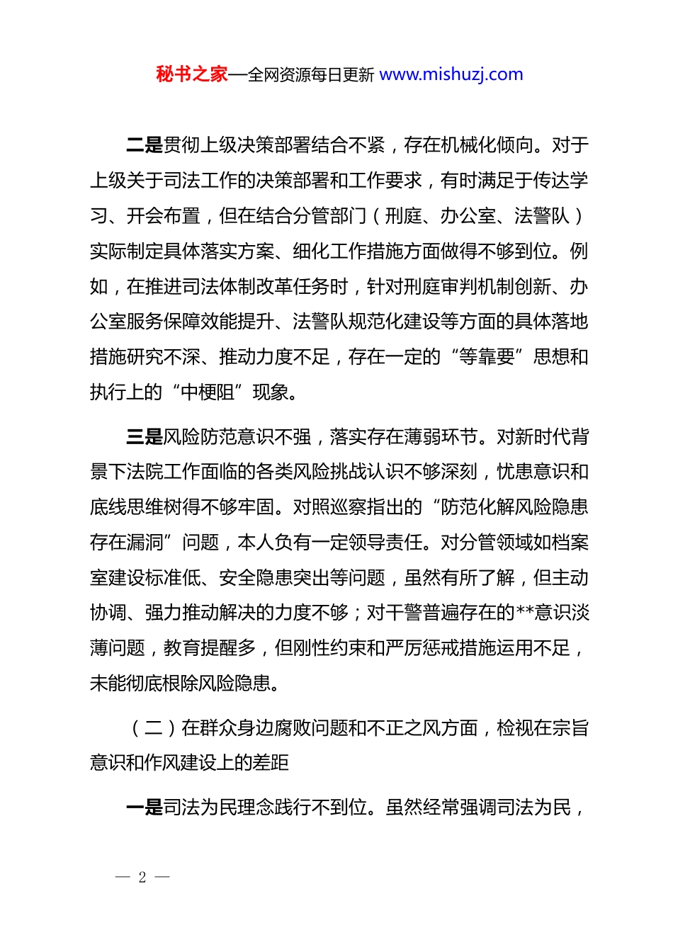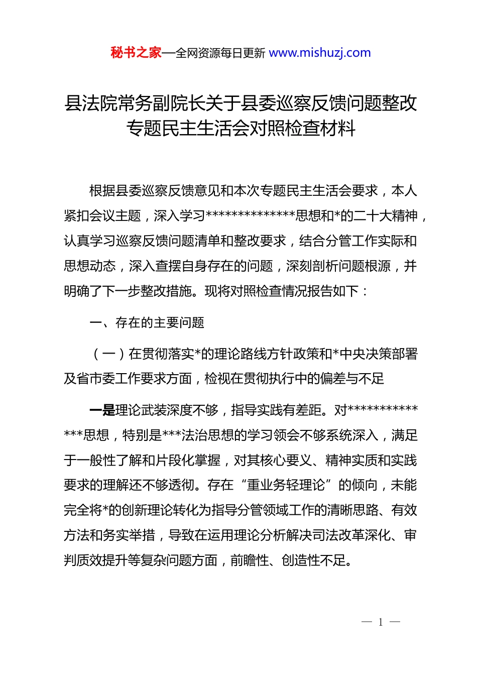 秘书之家—全网资源每日更新 www.mishuzj.com县法院常务副院长关于县委巡察反馈问题整改专题民主生活会对照检查材料根据县委巡察反馈意见和本次专题民主生活会要求,本人紧扣会议主题,深入学习**************思想和*的二十大精神,认真学习巡察反馈问题清单和整改要求,结合分管工作实际和思想动态,深入查摆自身存在的问题,深刻剖析问题根源,并明确了下一步整改措施。现将对照检查情况报告如下:一、存在的主要问题(一)在贯彻落实*的理论路线方针政策和*中央决策部署及省市委工作要求方面,检视在贯彻执行中的偏差与不足一是理论武装深度不够,指导实践有差距。对**************思想,特别是***法治思想的学习领会不够系统深入,满足于一般性了解和片段化掌握,对其核心要义、精神实质和实践要求的理解还不够透彻。存在“重业务轻理论”的倾向,未能完全将*的创新理论转化为指导分管领域工作的清晰思路、有效方法和务实举措,导致在运用理论分析解决司法改革深化、审判质效提升等复杂问题方面,前瞻性、创造性不足。— 1 —秘书之家—全网资源每日更新 www.mishuzj.com二是贯彻上级决策部署结合不紧,存在机械化倾向。对于上级关于司法工作的决策部署和工作要求,有时满足于传达学习、开会布置,但在结合分管部门(刑庭、办公室、法警队)实际制定具体落实方案、细化工作措施方面做得不够到位。例如,在推进司法体制改革任务时,针对刑庭审判机制创新、办公室服务保障效能提升、法警队规范化建设等方面的具体落地措施研究不深、推动力度不足,存在一定的“等靠要”思想和执行上的“中梗阻”现象。三是风险防范意识不强,落实存在薄弱环节。对新时代背景下法院工作面临的各类风险挑战认识不够深刻,忧患意识和底线思维树得不够牢固。对照巡察指出的“防范化解风险隐患存在漏洞”问题,本人负有一定领导责任。对分管领域如档案室建设标准低、安全隐患突出等问题,虽然有所了解,但主动协调、强力推动解决的力度不够;对干警普遍存在的**意识淡薄问题,教育提醒多,但刚性约束和严厉惩戒措施运用不足,未能彻底根除风险隐患。(二)在群众身边腐败问题和不正之风方面,检视在宗旨意识和作风建设上的差距一是司法为民理念践行不到位。虽然经常强调司法为民,— 2 —秘书之家—全网资源每日更新 www.mishuzj.com但在实际工作中,有时更侧重于审判任务的完成和内部管理的顺畅,对群众司法诉求的复杂性、迫切性体察不够深入。对于巡察反馈的“司法为民理念树得不牢”“司法救助不规范”等问题,反思自身,在督促刑庭深化“如我在诉”理念、优化诉讼服务、规范司法救助程序等方面,要求不够严格,指导不够具体,导致个别案件办理效果和社会效果未能达到最佳统一,司法救助的精准性、规范性有待提高。二是工作作风不够扎实深入。存在一定的官僚主义和形式主义倾向。忙于事务性工作多,深入审判一线、深入干警、深入群众调查研究不够经常,对分管部门存在的深层次问题掌握不够全面精准。例如,对于办公室收发文办理不严谨、效率不高等作风问题,未能及时发现并有效纠治;对于干警反映的一些实际困难和问题,有时解决不够彻底、及时。三是纪律规矩执行刚性不足。对分管部门的干警日常教育监督管理偏重于工作业绩,对纪律作风的常态化监督检查抓得不够紧、不够严。对于巡察指出的“纪律作风执行不严”等问题,虽然进行了强调,但在动真碰硬、严肃查处方面存在失之于宽、失之于软的情况。对一些苗头性、倾向性问题,提醒、批评多,运用监督执纪“第一种形态”不够充分,未能形成足— 3 —秘书之家—全网资源每日更新 www.mishuzj.com够的震慑效应。(三)在贯彻落实新时代*的组织路线方面,检视在发挥政治功能和组织力上的不足一是分管部门*组织政治功能发挥不充分。作为分管领导,对刑庭、办公室、法警队*支部建设的指导和支持力度有待加强。未能完全将抓 dj 与抓业务紧密结合起来,存在“两张皮”现象。指导*支部落实“三会一课”、组织生活会等制度有时流于形式,未能充分发挥*支部在政治引领、凝聚人心、推动落实方面的战斗堡垒作用,特别是在攻坚克难、改革创新中*组织的...