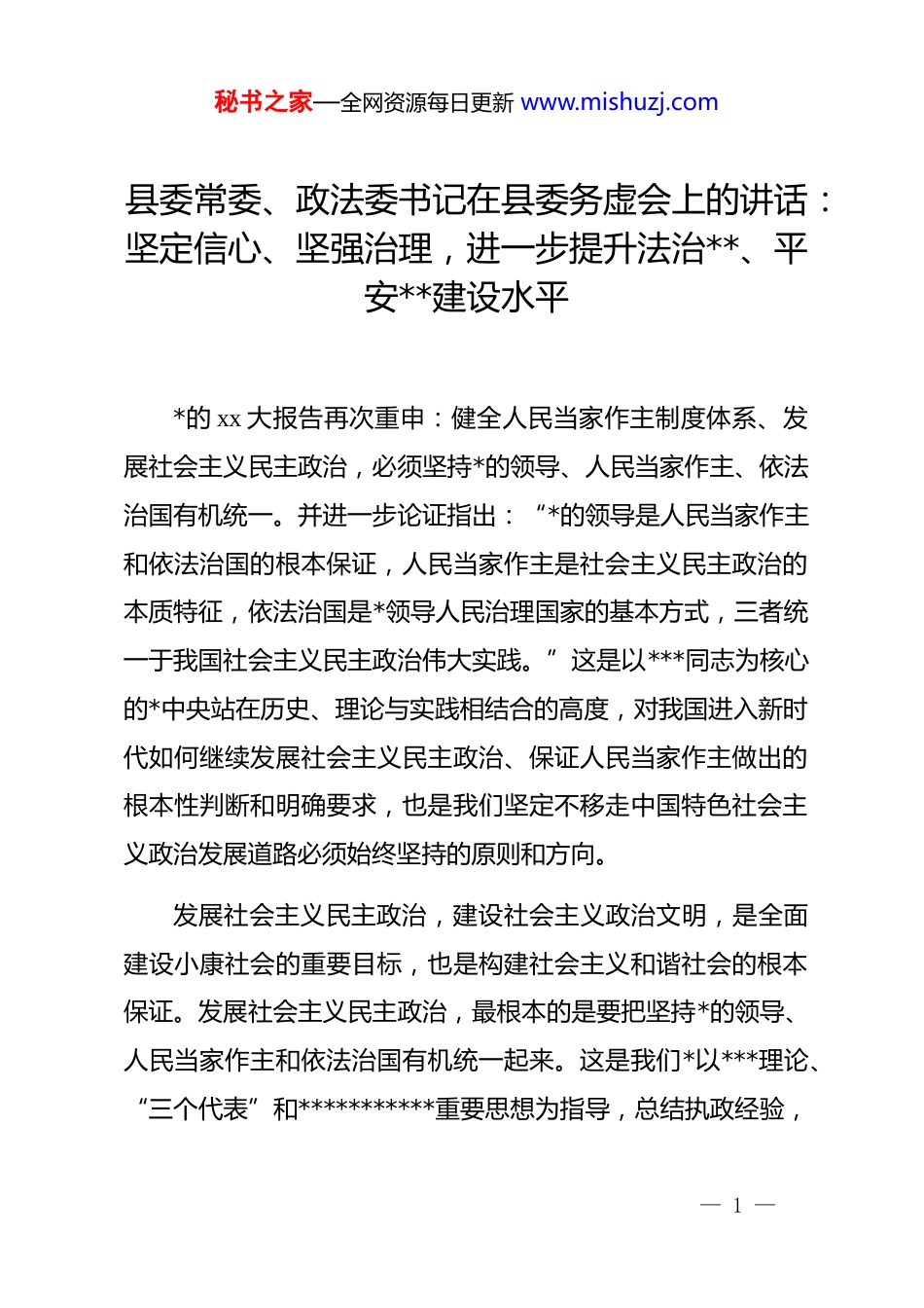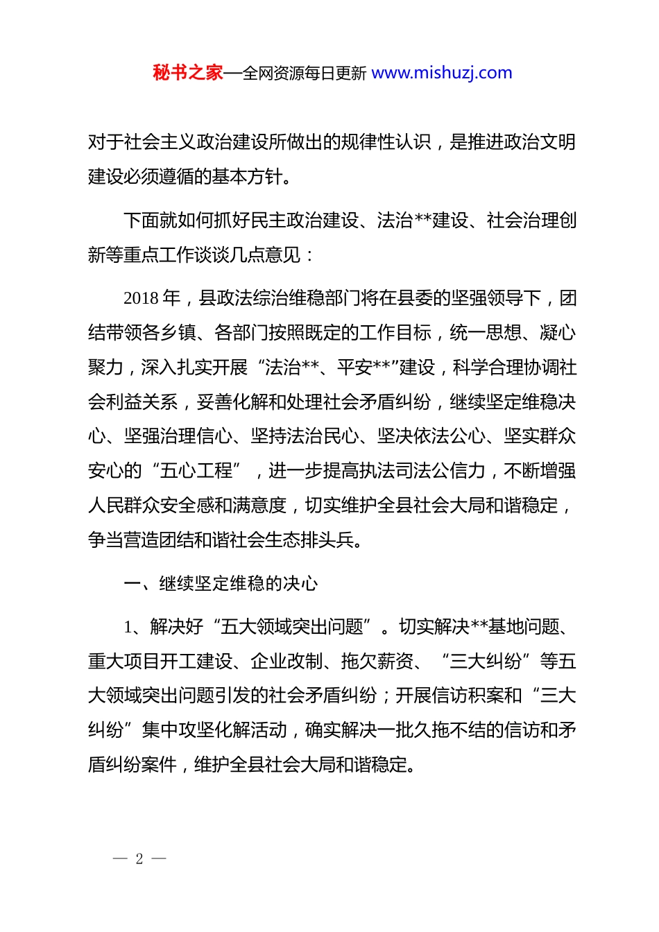 秘书之家—全网资源每日更新 www.mishuzj.com县委常委、政法委书记在县委务虚会上的讲话:坚定信心、坚强治理,进一步提升法治**、平安**建设水平*的 xx 大报告再次重申:健全人民当家作主制度体系、发展社会主义民主政治,必须坚持*的领导、人民当家作主、依法治国有机统一。并进一步论证指出:“*的领导是人民当家作主和依法治国的根本保证,人民当家作主是社会主义民主政治的本质特征,依法治国是*领导人民治理国家的基本方式,三者统一于我国社会主义民主政治伟大实践。”这是以***同志为核心的*中央站在历史、理论与实践相结合的高度,对我国进入新时代如何继续发展社会主义民主政治、保证人民当家作主做出的根本性判断和明确要求,也是我们坚定不移走中国特色社会主义政治发展道路必须始终坚持的原则和方向。发展社会主义民主政治,建设社会主义政治文明,是全面建设小康社会的重要目标,也是构建社会主义和谐社会的根本保证。发展社会主义民主政治,最根本的是要把坚持*的领导、人民当家作主和依法治国有机统一起来。这是我们*以***理论、“三个代表”和***********重要思想为指导,总结执政经验,— 1 —秘书之家—全网资源每日更新 www.mishuzj.com对于社会主义政治建设所做出的规律性认识,是推进政治文明建设必须遵循的基本方针。下面就如何抓好民主政治建设、法治**建设、社会治理创新等重点工作谈谈几点意见:2018 年,县政法综治维稳部门将在县委的坚强领导下,团结带领各乡镇、各部门按照既定的工作目标,统一思想、凝心聚力,深入扎实开展“法治**、平安**”建设,科学合理协调社会利益关系,妥善化解和处理社会矛盾纠纷,继续坚定维稳决心、坚强治理信心、坚持法治民心、坚决依法公心、坚实群众安心的“五心工程”,进一步提高执法司法公信力,不断增强人民群众安全感和满意度,切实维护全县社会大局和谐稳定,争当营造团结和谐社会生态排头兵。一、继续坚定维稳的决心1、解决好“五大领域突出问题”。切实解决**基地问题、重大项目开工建设、企业改制、拖欠薪资、“三大纠纷”等五大领域突出问题引发的社会矛盾纠纷;开展信访积案和“三大纠纷”集中攻坚化解活动,确实解决一批久拖不结的信访和矛盾纠纷案件,维护全县社会大局和谐稳定。— 2 —秘书之家—全网资源每日更新 www.mishuzj.com2、深化四项机制化解矛盾纠纷。深化机制,创新载体,充分运用“四个三”工作法、“诉与非诉”、律师信访代理、“农情乡解”四项工作机制持续深入开展矛盾纠纷精准排查精细化解工作,建立健全矛盾纠纷大调解和多元化纠纷解决工作新机制,将矛盾纠纷多元化解纳入社会治安综合治理体系,努力化解各类矛盾纠纷,定纷止争。特别是对矛盾纠纷和信访案件的维稳化解,要认真按照******指示的“诉求合理解决到位,诉求无理思想教育到位,生活困难的帮扶救助到位,行为违法的依法处理”的三到位一处理各负其责,以“五个一”(一个包案领导,一个工作班子,一套化解方案,一套稳控措施,一个化解报告)和“五包”(包掌握情况、包解决困难、包教育转化、包稳控管理、包依法处理)。3、抓好三个层面的安全稳定工作。第一:要抓好全年各敏感时段和重大节庆活动期间安全稳定工作,要早谋划,早部署,早落实,确保平稳度过。第二:要抓好信访突出问题化解,要组织开展进京赴邕非正常上访突出问题专项整治行动,集中力量攻坚化解,不留尾巴、不留隐患。第三:要抓好突发涉稳案(事)件的化解,不能让一些突发的案(事)件牵扯我们全年的精力,影响全年稳定工作的大局。— 3 —秘书之家—全网资源每日更新 www.mishuzj.com二、继续坚强治理的信心1、严厉打击,加大社会治安面的管控力度。持续深入开展“神剑”系列专项行动,以六个坚决防止:“坚决防止发生暴力恐怖活动,坚决防止发生危害国家安全的重大事件,坚决防止发生大规模群体性事件,坚决防止非正常进京赴邕上访活动,坚决防止重大治安灾害事故发生,坚决防止有害信息在互联网和手机短信中大面积传播扩散”。严厉打击各类多发性犯罪;加大新型犯罪防范打击力度;严肃查办涉农领域犯罪案件和职务犯罪,为治安秩序平稳...