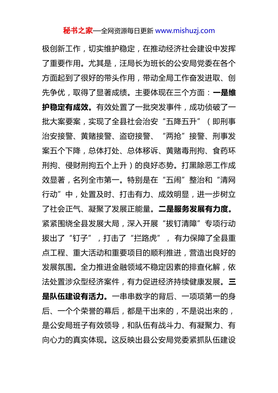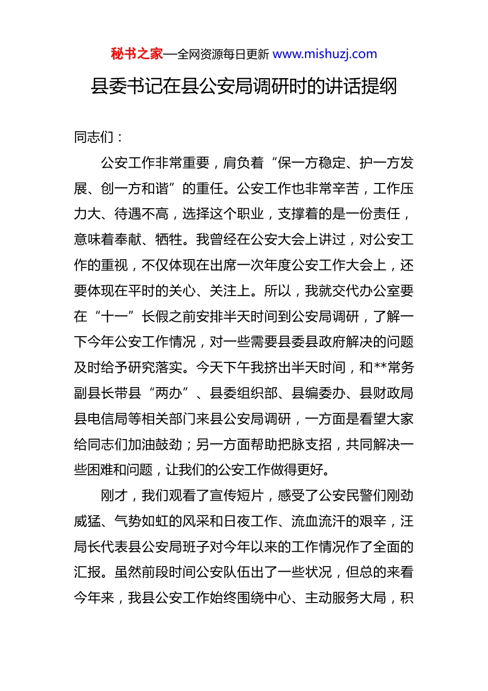 秘书之家—全网资源每日更新 www.mishuzj.com县委书记在县公安局调研时的讲话提纲同志们: 公安工作非常重要,肩负着“保一方稳定、护一方发展、创一方和谐”的重任。公安工作也非常辛苦,工作压力大、待遇不高,选择这个职业,支撑着的是一份责任,意味着奉献、牺牲。我曾经在公安大会上讲过,对公安工作的重视,不仅体现在出席一次年度公安工作大会上,还要体现在平时的关心、关注上。所以,我就交代办公室要在“十一”长假之前安排半天时间到公安局调研,了解一下今年公安工作情况,对一些需要县委县政府解决的问题及时给予研究落实。今天下午我挤出半天时间,和**常务副县长带县“两办”、县委组织部、县编委办、县财政局县电信局等相关部门来县公安局调研,一方面是看望大家给同志们加油鼓劲;另一方面帮助把脉支招,共同解决一些困难和问题,让我们的公安工作做得更好。 刚才,我们观看了宣传短片,感受了公安民警们刚劲威猛、气势如虹的风采和日夜工作、流血流汗的艰辛,汪局长代表县公安局班子对今年以来的工作情况作了全面的汇报。虽然前段时间公安队伍出了一些状况,但总的来看今年来,我县公安工作始终围绕中心、主动服务大局,积秘书之家—全网资源每日更新 www.mishuzj.com极创新工作,切实维护稳定,在推动经济社会建设中发挥了重要作用。尤其是,汪局长为班长的公安局党委在各个方面起到了很好的带头作用,带动全局工作奋发进取、创先争优,取得了显著成绩。主要体现在三个方面:一是维护稳定有成效。有效处置了一批突发事件,成功侦破了一批大案要案,实现了全县社会治安“五降五升”(即刑事治安接警、黄赌接警、盗窃接警、“两抢”接警、刑事发案五个下降,总体打处、总体移诉、黄赌毒刑拘、食药环刑拘、侵财刑拘五个上升)的良好态势。打黑除恶工作成效显著,名列全市第一。特别是在“五闹”整治和“清网行动”中,处置及时、打击有力、成效明显,进一步树立了社会正气、凝聚了发展正能量。二是服务发展有力度。紧紧围绕全县发展大局,深入开展“拔钉清障”专项行动拔出了“钉子”,打击了“拦路虎”, 有力保障了全县重点工程、重大活动和重要项目的顺利推进,营造出良好的发展氛围。全力推进金融领域不稳定因素的排查化解,依法处置涉众型经济案件,有力促进经济持续健康发展。三是队伍建设有活力。一串串数字的背后、一项项第一的身后、一个个荣誉的幕后,都是干出来的,不是说出来的,是公安局班子有效领导,和队伍有战斗力、有凝聚力、有向心力的真实体现。这反映出县公安局党委紧抓队伍建设秘书之家—全网资源每日更新 www.mishuzj.com不放松,从严治警不懈怠的结果。 在肯定成绩的同时,我们应当清醒地看到,在全县进入转型发展、赶超发展的新阶段,随着形势的发展,公安机关担负的任务越来越重,面临的执法环境越来越复杂,人民群众期盼也越来越高,做好公安工作责任重大,压力千钧。大家一定要积极寻找自身差距,积极主动作为,带头履职尽责,着力为全县经济社会发展保驾护航。 下面,我再提四点意见: 一、发展大局要护得稳 公安工作千头万绪,但中心只有一个,那就是服从和服务于经济发展。今年是全面完成**的收官之年,全面深化改革的关键之年,也是**和今后更长时期经济社会发展的规划之年,我县的改革、发展双重任务都很重。尤其是随着**镇国家新型城镇化综合试点改革的实施、对台经贸合作的深化,以及**等重点工程的加快推进,全县公安机关和广大公安干警肩负保障发展的任务更重、压力更大、使命也更光荣。公安机关务必要发挥好“护旗手”作用,始终与县委、县政府的中心工作相协调,与发展大局相合拍,真正为“加快发展、赶超发展”这个大局保好驾、护好航。 一要在服务重点项目建设上冲在前。要真正沉下去、秘书之家—全网资源每日更新 www.mishuzj.com深下去,自觉把为经济建设保驾护航作为重大任务,把优化发展环境作为重要职责,切实做到项目建设到哪里,服务就跟踪到哪里;工程建设到哪里,保障就提供到哪里。尤其对建设过程中强买强卖、强揽工程、阻挠施工进场以及“项目霸、材料霸、搬运霸”等行为,要严厉打击、绝不手软,...