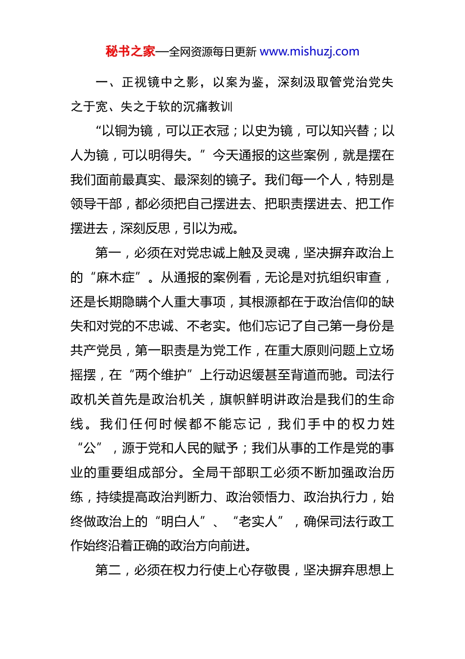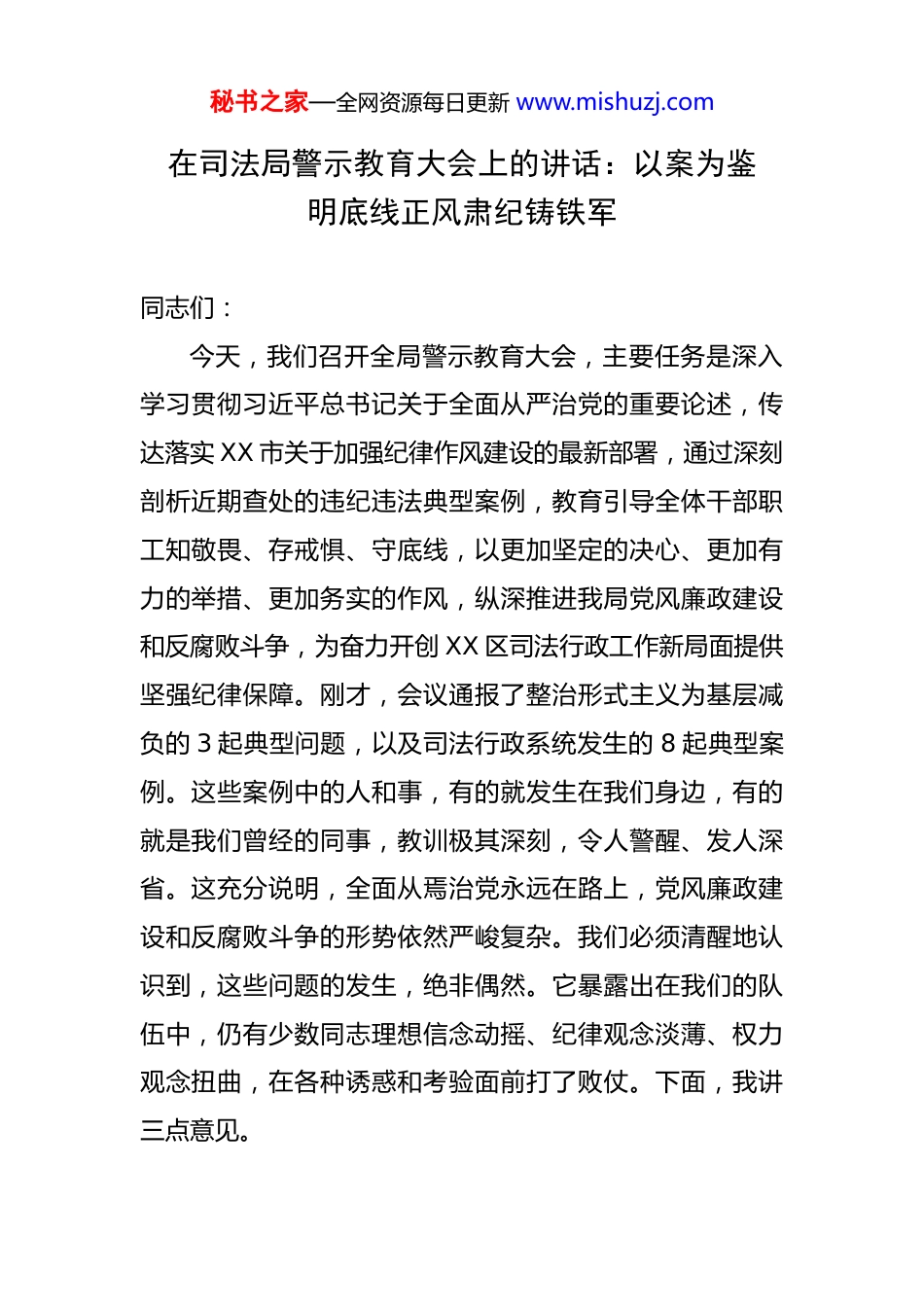 秘书之家—全网资源每日更新 www.mishuzj.com在司法局警示教育大会上的讲话:以案为鉴明底线正风肃纪铸铁军 同志们:今天,我们召开全局警示教育大会,主要任务是深入学习贯彻习近平总书记关于全面从严治党的重要论述,传达落实 XX 市关于加强纪律作风建设的最新部署,通过深刻剖析近期查处的违纪违法典型案例,教育引导全体干部职工知敬畏、存戒惧、守底线,以更加坚定的决心、更加有力的举措、更加务实的作风,纵深推进我局党风廉政建设和反腐败斗争,为奋力开创 XX 区司法行政工作新局面提供坚强纪律保障。刚才,会议通报了整治形式主义为基层减负的 3 起典型问题,以及司法行政系统发生的 8 起典型案例。这些案例中的人和事,有的就发生在我们身边,有的就是我们曾经的同事,教训极其深刻,令人警醒、发人深省。这充分说明,全面从焉治党永远在路上,党风廉政建设和反腐败斗争的形势依然严峻复杂。我们必须清醒地认识到,这些问题的发生,绝非偶然。它暴露出在我们的队伍中,仍有少数同志理想信念动摇、纪律观念淡薄、权力观念扭曲,在各种诱惑和考验面前打了败仗。下面,我讲三点意见。秘书之家—全网资源每日更新 www.mishuzj.com一、正视镜中之影,以案为鉴,深刻汲取管党治党失之于宽、失之于软的沉痛教训“以铜为镜,可以正衣冠;以史为镜,可以知兴替;以人为镜,可以明得失。”今天通报的这些案例,就是摆在我们面前最真实、最深刻的镜子。我们每一个人,特别是领导干部,都必须把自己摆进去、把职责摆进去、把工作摆进去,深刻反思,引以为戒。第一,必须在对党忠诚上触及灵魂,坚决摒弃政治上的“麻木症”。从通报的案例看,无论是对抗组织审查,还是长期隐瞒个人重大事项,其根源都在于政治信仰的缺失和对党的不忠诚、不老实。他们忘记了自己第一身份是共产党员,第一职责是为党工作,在重大原则问题上立场摇摆,在“两个维护”上行动迟缓甚至背道而驰。司法行政机关首先是政治机关,旗帜鲜明讲政治是我们的生命线 。 我 们 任 何 时 候 都 不 能 忘 记 , 我 们 手 中 的 权 力 姓“公”,源于党和人民的赋予;我们从事的工作是党的事业的重要组成部分。全局干部职工必须不断加强政治历练,持续提高政治判断力、政治领悟力、政治执行力,始终做政治上的“明白人”、“老实人”,确保司法行政工作始终沿着正确的政治方向前进。第二,必须在权力行使上心存敬畏,坚决摒弃思想上秘书之家—全网资源每日更新 www.mishuzj.com的“侥幸心”。权力是一把“双刃剑”,为民则利,为己则害。有的案例中,当事人把公权异化为私器,在行政审批、案件办理、项目采购中以权谋私,最终滑入犯罪的深渊;有的则利用职务便利,违规经商办企业、违规兼职取酬,搞“一家两制”;还有的沉迷于“酒杯中的奢靡”“牌桌上的放纵”,在推杯换盏、吃喝玩乐中迷失了自我,触碰了纪律红线。这些活生生的例子警示我们,权力运行的笼子扎得再紧,如果思想上没有“紧箍咒”,就总会有人想方设法钻空子。我们必须牢固树立正确的权力观,时刻保持对权力的敬畏之心,严格按照法定权限、规则、程序办事,习惯在监督下工作和生活,确保权力在阳光下运行,绝不越雷池一步。第三,必须在作风建设上常抓不懈,坚决摒弃行为上的“小节论”。“堤溃蚁穴,气泄针芒”。大量案例表明,领导干部的腐化堕落,往往是从一顿饭、一瓶酒、一张卡、一份“薄礼”开始的,是从不注意“小节”开始的。诸如公车私用、违规收受礼品礼金、大操大办婚丧喜庆等问题,看似是“小事小节”,实则是“四风”问题的顽固表现,是腐败滋生的重要温床。我们必须深刻认识到,作风问题无小事,小节不守,大节必失。要持续深化对纪律规定的学习理解,对“四风”隐形变异新动向时刻秘书之家—全网资源每日更新 www.mishuzj.com保持高度警惕,坚决远离形形色色的“小圈子”,警惕饱含目的的“小意思”,管住消磨意志的“小爱好”,真正做到稳住心神、管住行为、守住清白,让清正廉洁的风气内化于心、外化于行。二、绷紧纪律之弦,以纪为尺,坚定不移把全面从严治党要求落到实处纪律是管党治党的“戒尺”,...