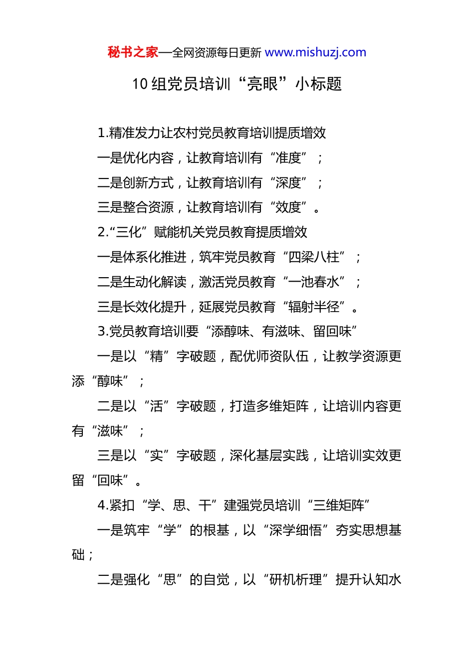 秘书之家—全网资源每日更新 www.mishuzj.com10 组党员培训“亮眼”小标题 1.精准发力让农村党员教育培训提质增效一是优化内容,让教育培训有“准度”;二是创新方式,让教育培训有“深度”;三是整合资源,让教育培训有“效度”。2.“三化”赋能机关党员教育提质增效一是体系化推进,筑牢党员教育“四梁八柱”;二是生动化解读,激活党员教育“一池春水”;三是长效化提升,延展党员教育“辐射半径”。3.党员教育培训要“添醇味、有滋味、留回味”一是以“精”字破题,配优师资队伍,让教学资源更添“醇味”;二是以“活”字破题,打造多维矩阵,让培训内容更有“滋味”;三是以“实”字破题,深化基层实践,让培训实效更留“回味”。4.紧扣“学、思、干”建强党员培训“三维矩阵”一是筑牢“学”的根基,以“深学细悟”夯实思想基础;二是强化“思”的自觉,以“研机析理”提升认知水秘书之家—全网资源每日更新 www.mishuzj.com平;三是突出“干”的导向,以“躬身实践”彰显担当作为。5.“声”入人心让党员教育培训更有效一是以“理论之声”破题,在深入浅出中让政策观点“听得进”;二是以“实践之声”赋能,在知行合一中让教育培训“用得上”;三是以“初心之声”铸魂,在正心明道中让初心使命“守得住”。6.细化、优化、深化让党员教育培训更务实一是深入调研摸实情,以因人施教细化教育内容;二是丰富载体亮实招,以鲜活形式优化学习方法;三是紧贴工作讲实话,以激励担当深化培训效果。7.把握“四个坚持”书写党员教育培训“更”字篇一是坚持靶向铸魂,让培训内容“有料”更对味;二是坚持破壁拓新,让培训形式“有趣”更入心;三是坚持健全机制,让培训推进“有序”更规范。8.步步到位推动党员教育培训做细、做优、做深一是向需求要精准,以分类供给把课程做细;二是向载体要活力,以融媒融合把方式做优;秘书之家—全网资源每日更新 www.mishuzj.com三是向实践要成色,以真评真用把成效做深。9.农村党员培训要“有深度、富新意、含实味”一是聚焦理想信念“铸魂”,在“理论补钙、实践强身”中让农村党员培训“有深度”;二是围绕党建创新“提质”,在“云端畅学、本土精学”中让农村党员培训“富新意”;三是立足实干担当“赋能”,在“榜样引领、民呼我为”中让农村党员培训“含实味”。10.党员培训要“声声入心、渐渐入情、满满入行”一是从思想态度上“走心”,加强理论武装,“声声”精准传达到“心”;二是从方式方法上“走深”,融入情感培育,“渐渐”触动引发出“情”;三是从学做结合上“走实”,强化实践导向,“满满”转化落实为“行”。
