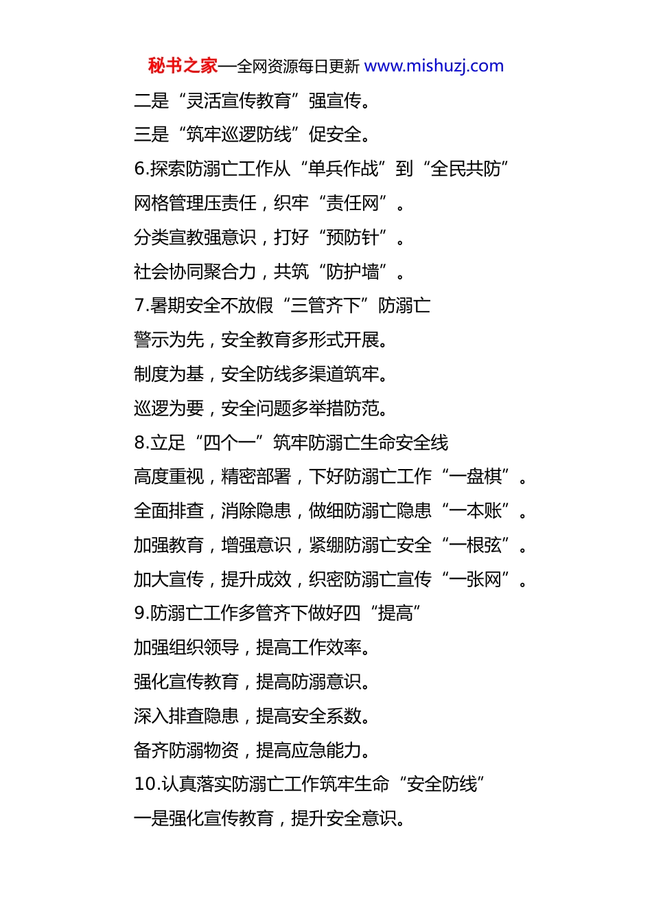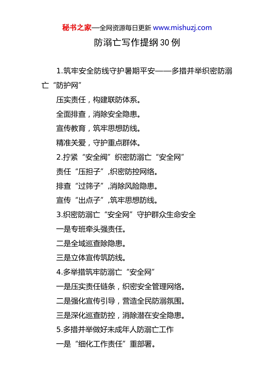 秘书之家—全网资源每日更新 www.mishuzj.com防溺亡写作提纲 30 例 1.筑牢安全防线守护暑期平安——多措并举织密防溺亡“防护网”压实责任,构建联防体系。全面排查,消除安全隐患。宣传教育,筑牢思想防线。精准关爱,守护重点群体。2.拧紧“安全阀”织密防溺亡“安全网”责任“压担子”,织密防控网络。排查“过筛子”,消除风险隐患。宣传“出点子”,筑牢思想防线。3.织密防溺亡“安全网”守护群众生命安全一是专班牵头强责任。二是全域巡查除隐患。三是立体宣传筑防线。4.多举措筑牢防溺亡“安全网”一是压实责任链条,织密安全管理网络。二是强化宣传引导,营造全民防溺氛围。三是深化巡查防控,消除潜在安全隐患。5.多措并举做好未成年人防溺亡工作一是“细化工作责任”重部署。秘书之家—全网资源每日更新 www.mishuzj.com二是“灵活宣传教育”强宣传。三是“筑牢巡逻防线”促安全。6.探索防溺亡工作从“单兵作战”到“全民共防”网格管理压责任,织牢“责任网”。分类宣教强意识,打好“预防针”。社会协同聚合力,共筑“防护墙”。7.暑期安全不放假“三管齐下”防溺亡警示为先,安全教育多形式开展。制度为基,安全防线多渠道筑牢。巡逻为要,安全问题多举措防范。8.立足“四个一”筑牢防溺亡生命安全线高度重视,精密部署,下好防溺亡工作“一盘棋”。全面排查,消除隐患,做细防溺亡隐患“一本账”。加强教育,增强意识,紧绷防溺亡安全“一根弦”。加大宣传,提升成效,织密防溺亡宣传“一张网”。9.防溺亡工作多管齐下做好四“提高”加强组织领导,提高工作效率。强化宣传教育,提高防溺意识。深入排查隐患,提高安全系数。备齐防溺物资,提高应急能力。10.认真落实防溺亡工作筑牢生命“安全防线”一是强化宣传教育,提升安全意识。秘书之家—全网资源每日更新 www.mishuzj.com二是全面排查隐患,筑牢防护屏障。三是健全联防机制,压实责任链条。11.开展防溺亡排查工作保障群众生命安全一是多方联动,压实责任。二是多管齐下,排查隐患。三是多点发力,加大宣传。12.“四项举措”持续推进防溺亡工作保持长效一是加强组织领导,党政同责部署加压。二是细化防控举措,“三个一遍”完善提升。三是凝聚各方合力,“四位一体”持续推进。四是浓厚宣传氛围,乡村组户全面覆盖。13.筑牢防溺亡安全防线全力守护群众生命安全提高政治站位,压实责任链条。全面摸排整治,筑牢安全屏障。多维宣传引导,凝聚共治合力。14.多措并举织密防溺亡安全网高度重视,夯实防溺亡职责。多措并举,发挥防溺亡效能。全力保障,配全防溺亡物资。15.“三强化”切实开展未成年人防溺亡工作一是强化组织领导,压实安全责任。二是强化教育宣传,提高安全意识。秘书之家—全网资源每日更新 www.mishuzj.com三是强化隐患排查,筑牢安全防线。16.切实织牢防溺亡工作“安全网”一是“清”责任。二是“广”宣传。三是“细”排查。四是“实”措施。17.持续筑牢防溺水安全网一是加强领导,强化责任意识。二是广泛宣传,增强安全意识。三是全面排查,加强日常巡查。18.织密织牢“防溺水安全网”加强宣传教育,织密“宣传网”。加强隐患排查,织密“防控网”。加强日常巡逻,织密“责任网”。加强巡查督查,织密“监督网”。19.多措并举织密防溺水“防护网”一是加强组织领导,压实工作责任。二是强化宣传教育,增强防患意识。三是全面排查隐患,筑牢安全防线。20.“四措联动”防溺亡守牢生命“安全线”责任压实,构建三级防控责任体系。隐患清零,筑牢水域安全防护屏障。秘书之家—全网资源每日更新 www.mishuzj.com宣教覆盖,拧紧安全意识思想阀门。协同联动,织密立体防护网络体系。21.聚焦暑期安全,筑牢未成年人防溺亡屏障广渠道宣传,营造浓厚氛围。多主题活动,增强安全意识。高频次排查,守护水域安全。22.多举措筑牢暑期防溺亡安全屏障压实责任链条,构建全域防控体系。多维宣传教育,筑牢安全思想防线。全域隐患排查,夯实风险防控基础。凝聚联动合力,织密群防群治网络。23.筑牢汛期安全防线扎实开展未成年人防溺亡工作精心部署,拧紧防溺水“责任阀”。宣传引导,吹响防溺水“集结号”。网...