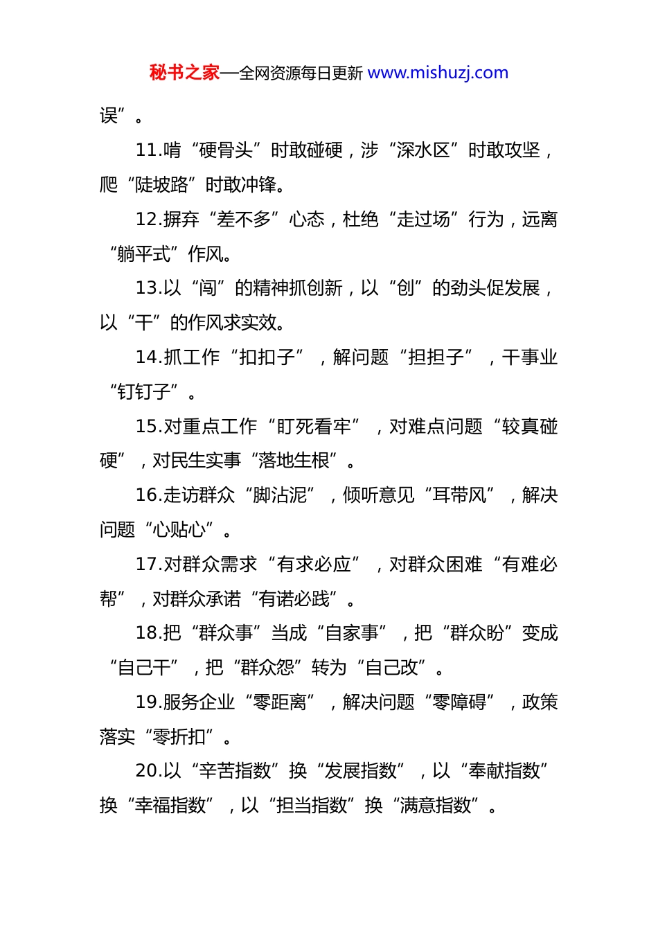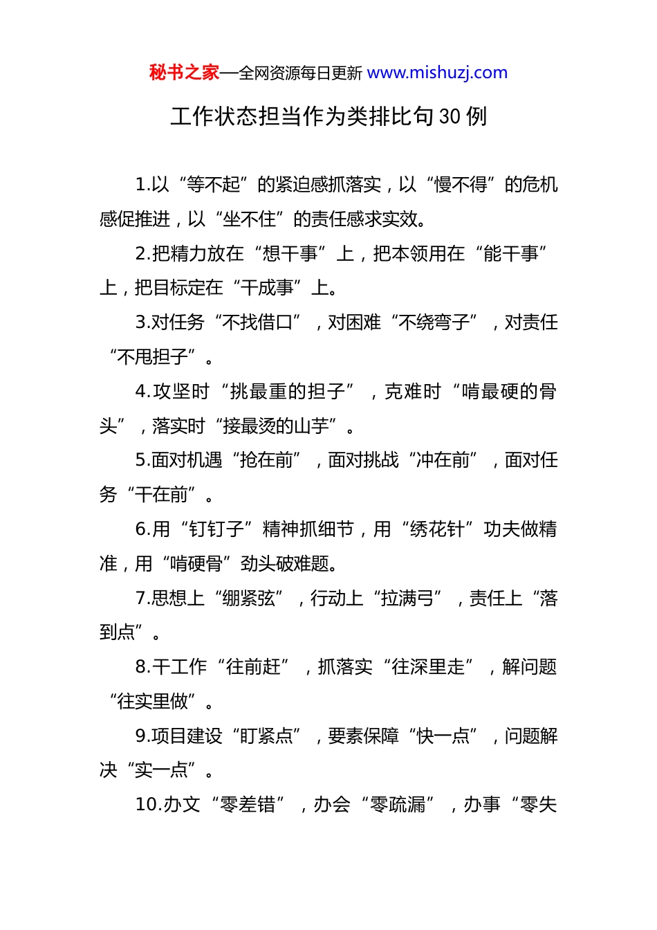 秘书之家—全网资源每日更新 www.mishuzj.com工作状态担当作为类排比句 30 例 1.以“等不起”的紧迫感抓落实,以“慢不得”的危机感促推进,以“坐不住”的责任感求实效。2.把精力放在“想干事”上,把本领用在“能干事”上,把目标定在“干成事”上。3.对任务“不找借口”,对困难“不绕弯子”,对责任“不甩担子”。4.攻坚时“挑最重的担子”,克难时“啃最硬的骨头”,落实时“接最烫的山芋”。5.面对机遇“抢在前”,面对挑战“冲在前”,面对任务“干在前”。6.用“钉钉子”精神抓细节,用“绣花针”功夫做精准,用“啃硬骨”劲头破难题。7.思想上“绷紧弦”,行动上“拉满弓”,责任上“落到点”。8.干工作“往前赶”,抓落实“往深里走”,解问题“往实里做”。9.项目建设“盯紧点”,要素保障“快一点”,问题解决“实一点”。10.办文“零差错”,办会“零疏漏”,办事“零失秘书之家—全网资源每日更新 www.mishuzj.com误”。11.啃“硬骨头”时敢碰硬,涉“深水区”时敢攻坚,爬“陡坡路”时敢冲锋。12.摒弃“差不多”心态,杜绝“走过场”行为,远离“躺平式”作风。13.以“闯”的精神抓创新,以“创”的劲头促发展,以“干”的作风求实效。14.抓工作“扣扣子”,解问题“担担子”,干事业“钉钉子”。15.对重点工作“盯死看牢”,对难点问题“较真碰硬”,对民生实事“落地生根”。16.走访群众“脚沾泥”,倾听意见“耳带风”,解决问题“心贴心”。17.对群众需求“有求必应”,对群众困难“有难必帮”,对群众承诺“有诺必践”。18.把“群众事”当成“自家事”,把“群众盼”变成“自己干”,把“群众怨”转为“自己改”。19.服务企业“零距离”,解决问题“零障碍”,政策落实“零折扣”。20.以“辛苦指数”换“发展指数”,以“奉献指数”换“幸福指数”,以“担当指数”换“满意指数”。秘书之家—全网资源每日更新 www.mishuzj.com21.对工作“零拖延”,对任务“零推诿”,对责任“零逃避”。22.学习上“充电”不松劲,工作上“放电”不停歇,作风上“防漏”不松懈。23.作风上“严要求”,工作上“高标准”,服务上“优质量”。24.用“责任心”对待每一项任务,用“专注心”做好每一件事情,用“敬畏心”遵守每一项纪律。25.思想上“不滑坡”,行动上“不落后”,业绩上“不掉队”。26.谋划工作“一盘棋”,推进工作“一股劲”,落实工作“一条心”。27.把“要我干”变成“我要干”,把“被动抓”变成“主动推”,把“应付做”变成“用心干”。28.推进工作“实打实”,解决问题“硬碰硬”,成效检验“真对真”。29.抓落实“一竿子插到底”,解问题“一把尺量到边”,促发展“一条路走到底”。30.工作中“多思考”,落实中“多行动”,总结中“多反思”。
