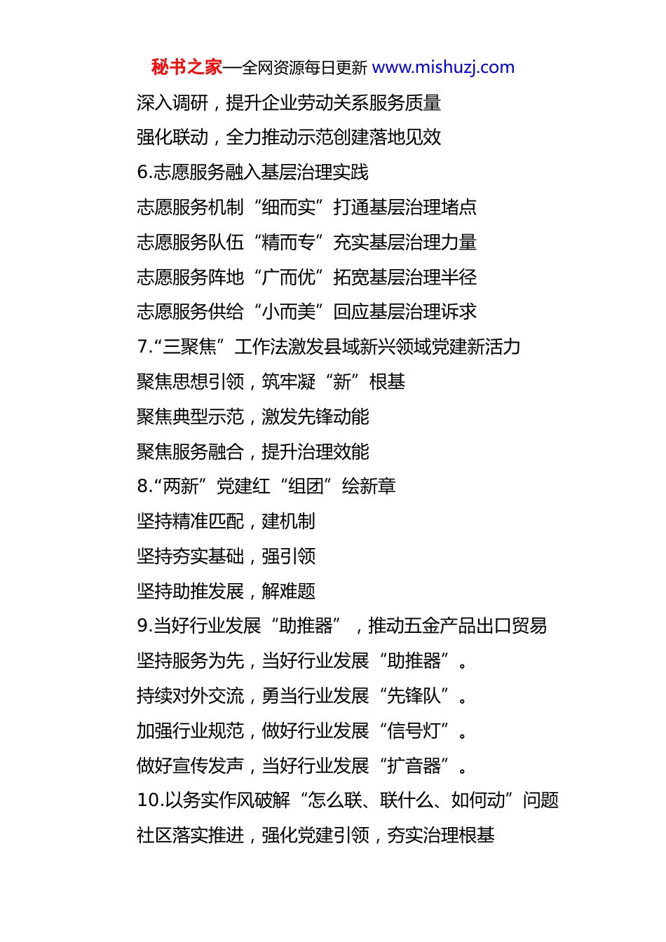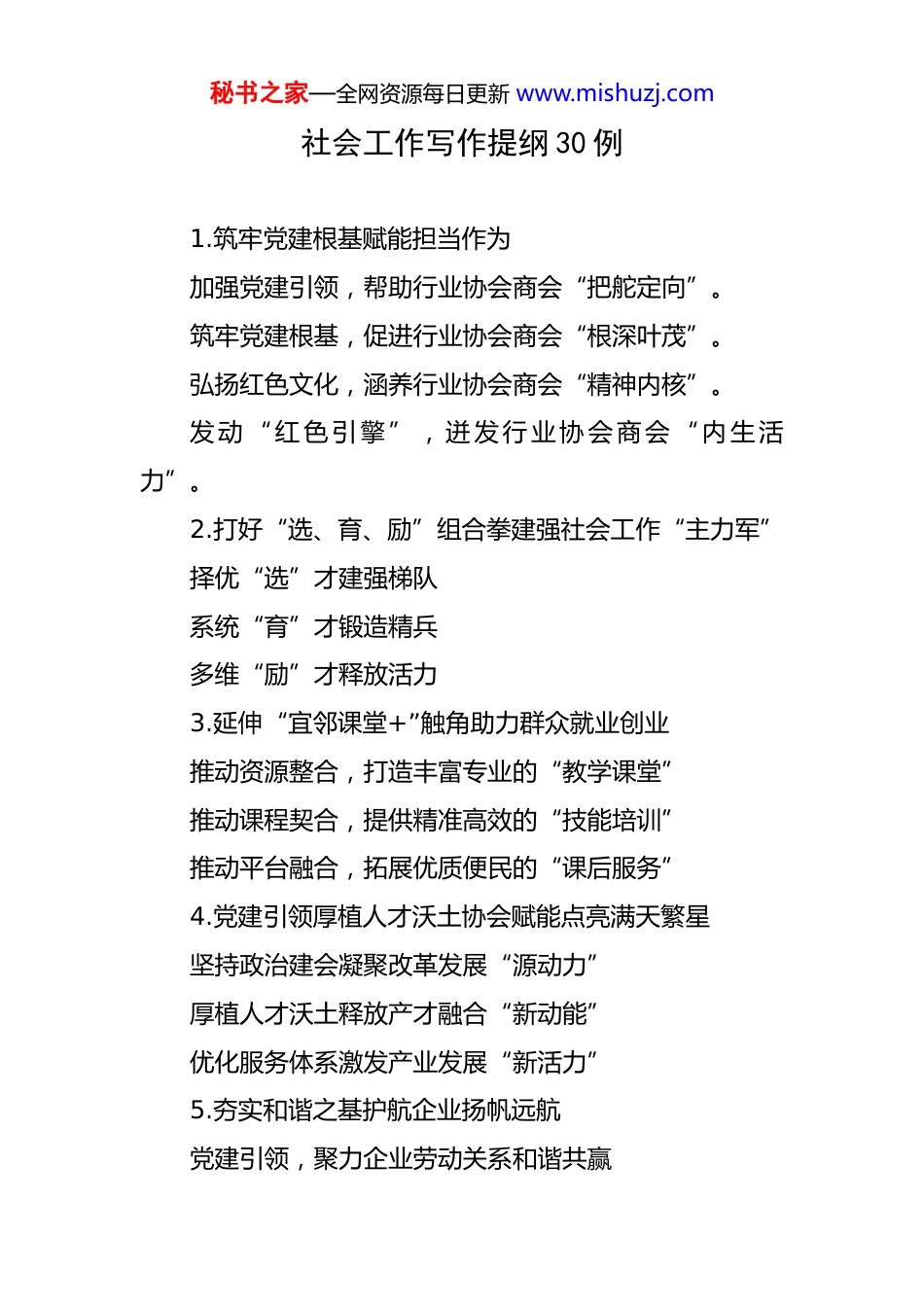 秘书之家—全网资源每日更新 www.mishuzj.com社会工作写作提纲 30 例 1.筑牢党建根基赋能担当作为加强党建引领,帮助行业协会商会“把舵定向”。筑牢党建根基,促进行业协会商会“根深叶茂”。弘扬红色文化,涵养行业协会商会“精神内核”。发动“红色引擎”,迸发行业协会商会“内生活力”。2.打好“选、育、励”组合拳建强社会工作“主力军”择优“选”才建强梯队系统“育”才锻造精兵多维“励”才释放活力3.延伸“宜邻课堂+”触角助力群众就业创业推动资源整合,打造丰富专业的“教学课堂”推动课程契合,提供精准高效的“技能培训”推动平台融合,拓展优质便民的“课后服务”4.党建引领厚植人才沃土协会赋能点亮满天繁星坚持政治建会凝聚改革发展“源动力”厚植人才沃土释放产才融合“新动能”优化服务体系激发产业发展“新活力”5.夯实和谐之基护航企业扬帆远航党建引领,聚力企业劳动关系和谐共赢秘书之家—全网资源每日更新 www.mishuzj.com深入调研,提升企业劳动关系服务质量强化联动,全力推动示范创建落地见效6.志愿服务融入基层治理实践志愿服务机制“细而实”打通基层治理堵点志愿服务队伍“精而专”充实基层治理力量志愿服务阵地“广而优”拓宽基层治理半径志愿服务供给“小而美”回应基层治理诉求7.“三聚焦”工作法激发县域新兴领域党建新活力聚焦思想引领,筑牢凝“新”根基聚焦典型示范,激发先锋动能聚焦服务融合,提升治理效能8.“两新”党建红“组团”绘新章坚持精准匹配,建机制坚持夯实基础,强引领坚持助推发展,解难题9.当好行业发展“助推器”,推动五金产品出口贸易坚持服务为先,当好行业发展“助推器”。持续对外交流,勇当行业发展“先锋队”。加强行业规范,做好行业发展“信号灯”。做好宣传发声,当好行业发展“扩音器”。10.以务实作风破解“怎么联、联什么、如何动”问题社区落实推进,强化党建引领,夯实治理根基秘书之家—全网资源每日更新 www.mishuzj.com社会组织协同,聚焦民生需求,提升服务效能社会工作者支撑,专业力量下沉,破解治理难题志愿服务常态化,激活内生动力,共建和谐家园慈善资源助力,凝聚爱心力量,补齐民生短板11.新兴领域给党建工作的开展带来的挑战组织覆盖存在“空白地带”。工作机制存在“双重滞后”。作用发挥逐渐“效能弱化”。12.创新“三维融合”的工作方法,实现党建工作效能向高质量发展势能的持续转化推动党建与业务相融合。推动线上与线下相融合。推动服务与管理相融合。13.三联聚能,强化基层治理联管事务,共筑自治“主阵地”。联调矛盾,打造解纷“终点站”。联育新风,培育文明“新风尚”。14.聚焦“四力四化”谱写群众志愿服务新篇章聚焦党建统筹引领力,推进志愿服务常态化聚焦有求必应战斗力,推进志愿服务精准化聚焦群众需求保障力,推进志愿服务便利化聚焦特色项目影响力,推进志愿服务品牌化秘书之家—全网资源每日更新 www.mishuzj.com15.“党建红+志愿红”点亮暖心服务之光强化党建引领,释放协同共治效能激发志愿活力,奉献友爱薪火传扬筑牢制度根基,激发治理内生动力精准服务惠民,打造特色品牌矩阵16.地企联动携手共治释放党建引领基层治理叠加效能坚持党建引领、地企联动,构建协同化治理格局坚持资源整合、优化提升,打造一体化治理支撑坚持“三治融合”、互动贯通,释放集成化治理效能坚持赓续血脉、锻造队伍,提升专业化治理能力坚持“双网融合”、精细智管,完善网格化治理方式17.“五敲五应”建机制,架起志愿服务“连心桥”代表敲响传递门,畅通渠道迎掌声。驻区敲定发展门,共商共建映生辉。社区敲开关爱门,精准服务赢民心。物业敲击安全门,守护生活增业绩。网格敲动信息门,沟通疏导应关切。18.共奏和谐曲乡村换新颜建强组织,筑牢基层治理根基多方治理,凝聚基层治理合力振兴产业,提升基层治理效能19.铸牢共同体共治“接边地”秘书之家—全网资源每日更新 www.mishuzj.com固本——筑牢接边治理“压舱石”。提效——织密基层治理“防护网”。聚能——激活多方共治“动力源”。20.强基固本,推动基层治理强组织堡垒,锻造治理“主心骨”。强区域联动,构建协同“共同体...