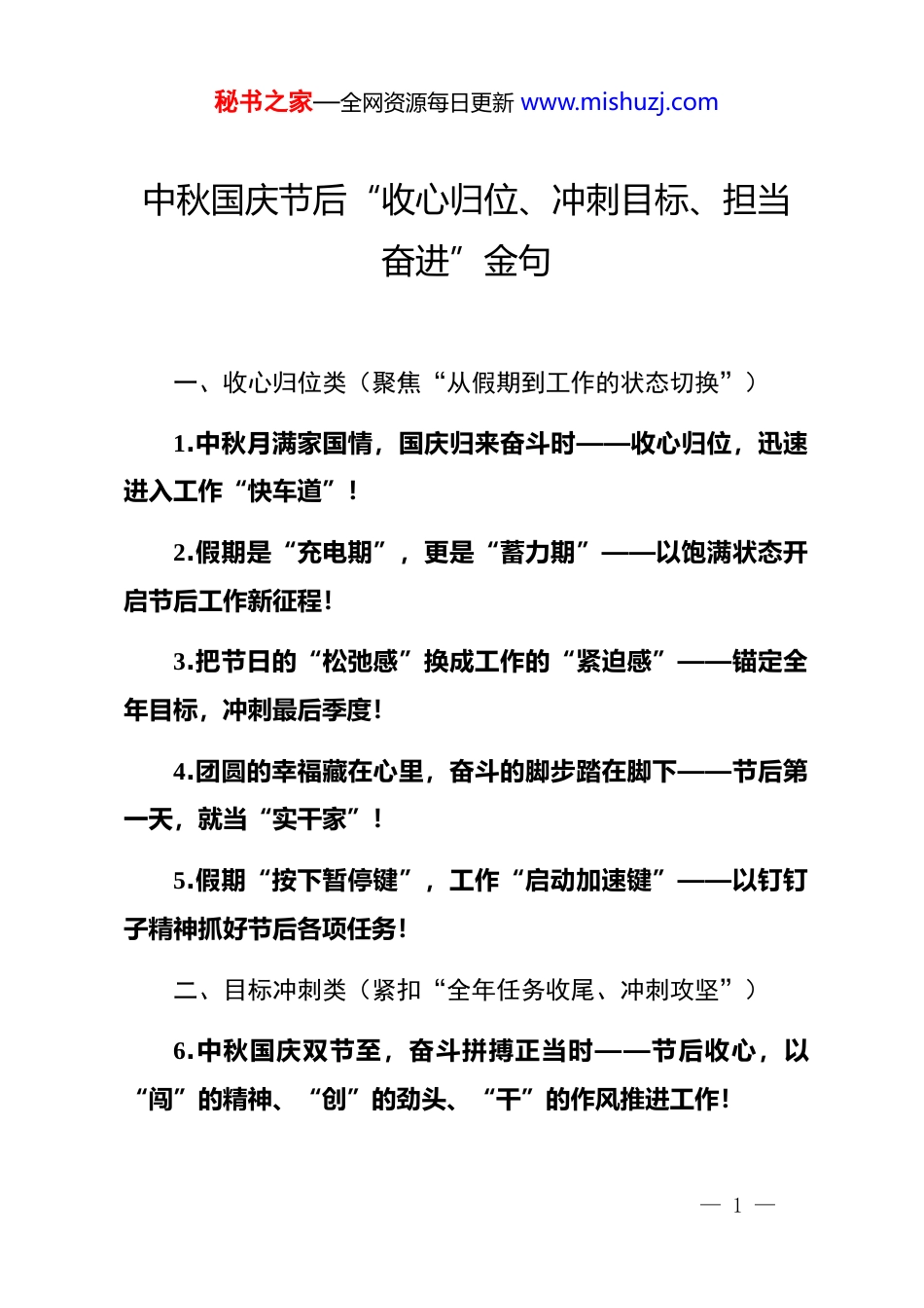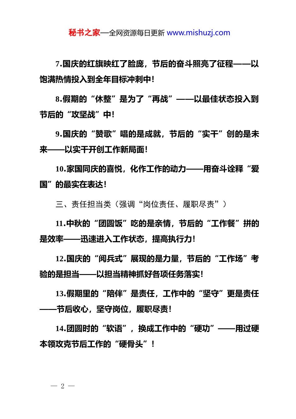 秘书之家—全网资源每日更新 www.mishuzj.com中秋国庆节后“收心归位、冲刺目标、担当奋进”金句一、收心归位类(聚焦“从假期到工作的状态切换”)1.中秋月满家国情,国庆归来奋斗时——收心归位,迅速进入工作“快车道”!2.假期是“充电期”,更是“蓄力期”——以饱满状态开启节后工作新征程!3.把节日的“松弛感”换成工作的“紧迫感”——锚定全年目标,冲刺最后季度!4.团圆的幸福藏在心里,奋斗的脚步踏在脚下——节后第一天,就当“实干家”!5.假期“按下暂停键”,工作“启动加速键”——以钉钉子精神抓好节后各项任务!二、目标冲刺类(紧扣“全年任务收尾、冲刺攻坚”)6.中秋国庆双节至,奋斗拼搏正当时——节后收心,以“闯”的精神、“创”的劲头、“干”的作风推进工作!— 1 —秘书之家—全网资源每日更新 www.mishuzj.com7.国庆的红旗映红了脸庞,节后的奋斗照亮了征程——以饱满热情投入到全年目标冲刺中!8.假期的“休整”是为了“再战”——以最佳状态投入到节后的“攻坚战”中!9.国庆的“赞歌”唱的是成就,节后的“实干”创的是未来——以实干开创工作新局面!10.家国同庆的喜悦,化作工作的动力——用奋斗诠释“爱国”的最实在表达!三、责任担当类(强调“岗位责任、履职尽责”)11.中秋的“团圆饭”吃的是亲情,节后的“工作餐”拼的是效率——迅速进入工作状态,提高执行力!12.国庆的“阅兵式”展现的是力量,节后的“工作场”考验的是担当——以担当精神抓好各项任务落实!13.假期里的“陪伴”是责任,工作中的“坚守”更是责任——节后收心,坚守岗位,履职尽责!14.团圆时的“软语”,换成工作中的“硬功”——用过硬本领攻克节后工作的“硬骨头”!— 2 —秘书之家—全网资源每日更新 www.mishuzj.com15.中秋的“月亮”照亮了回家的路,节后的“太阳”照亮了工作的路——带着光明,奔赴新的任务!四、务实作风类(突出“真抓实干、马上就办”)16.假期的“诗和远方”,不如工作的“脚踏实地”——迅速归位,聚焦全年目标不放松!17.赏过明月,看过盛典,更要干出成绩——节后工作,从“心”开始,向“实”发力!18.中秋的月饼甜在嘴里,工作的成果甜在心里——用实干把节日的甜蜜转化为事业的成果!19.国庆的“烟花”绽放的是美丽,节后的“业绩”绽放的是精彩——以业绩检验节后工作的成效!20.把节日的“幸福感”转化为“责任感”——节后第一天,就当“冲锋者”!五、团结奋进类(融合“家国情怀、团队协作”)21.家国同庆的温暖,转化为干事创业的热情——用奋斗续写假期后的“精彩篇章”!22.国庆的欢呼犹在耳,中秋的温情仍暖心——带着家国的— 3 —秘书之家—全网资源每日更新 www.mishuzj.com力量,奔赴工作的战场!23.中秋的“桂花香”飘满街头,节后的“奋斗声”响彻职场——用奋斗书写节后的“新篇章”!24.假期的“快乐”变成工作的“动力”——节后第一天,就以“满格电”状态投入工作!25.家国情怀记心间,奋斗拼搏在眼前——节后动员,用行动诠释“爱岗敬业”的深刻内涵!六、创新进取类(引导“突破常规、主动作为”)26.假期是“思考期”,节后是“行动期”——把假期的“灵感”转化为工作的“创新点”!27.中秋的“传统味”里藏着“新活力”——节后工作,用创新思维破解发展难题!28.国庆的“新成就”激励我们“新作为”——以创新举措推动工作再上新台阶!29.假期里的“新体验”,变成工作中的“新方法”——用创新提升节后工作效率!30.中秋国庆的“双节效应”,激发工作的“双轮驱动”—— 4 —秘书之家—全网资源每日更新 www.mishuzj.com—以创新+实干开启节后工作新境界!— 5 —