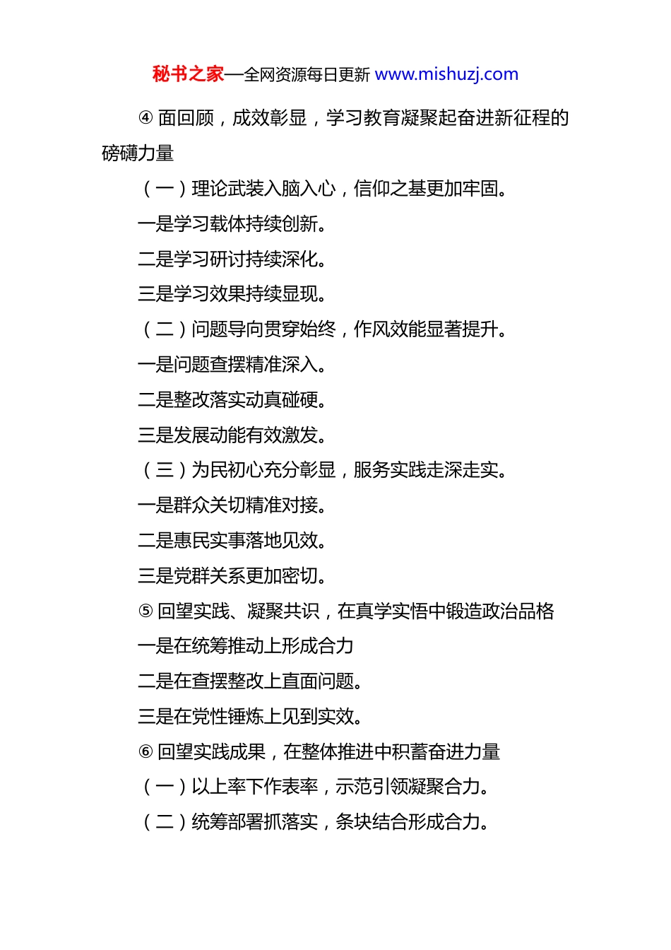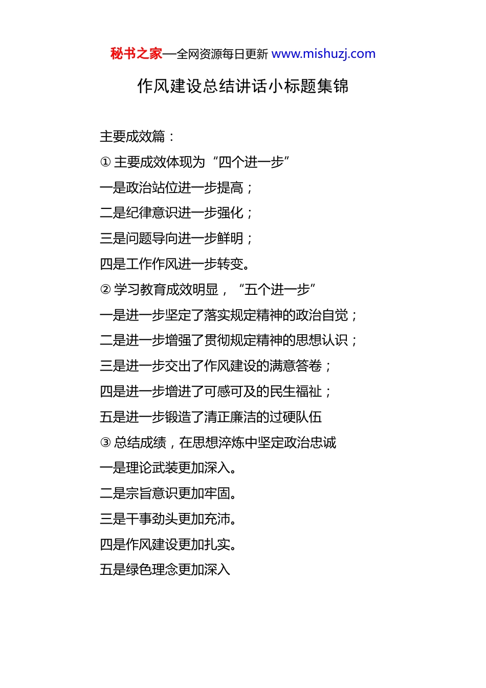秘书之家—全网资源每日更新 www.mishuzj.com作风建设总结讲话小标题集锦 主要成效篇:① 主要成效体现为“四个进一步”一是政治站位进一步提高;二是纪律意识进一步强化;三是问题导向进一步鲜明;四是工作作风进一步转变。② 学习教育成效明显,“五个进一步”一是进一步坚定了落实规定精神的政治自觉;二是进一步增强了贯彻规定精神的思想认识;三是进一步交出了作风建设的满意答卷;四是进一步增进了可感可及的民生福祉;五是进一步锻造了清正廉洁的过硬队伍③ 总结成绩,在思想淬炼中坚定政治忠诚一是理论武装更加深入。二是宗旨意识更加牢固。三是干事劲头更加充沛。四是作风建设更加扎实。五是绿色理念更加深入秘书之家—全网资源每日更新 www.mishuzj.com④ 面回顾,成效彰显,学习教育凝聚起奋进新征程的磅礴力量(一)理论武装入脑入心,信仰之基更加牢固。一是学习载体持续创新。二是学习研讨持续深化。三是学习效果持续显现。(二)问题导向贯穿始终,作风效能显著提升。一是问题查摆精准深入。二是整改落实动真碰硬。三是发展动能有效激发。(三)为民初心充分彰显,服务实践走深走实。一是群众关切精准对接。二是惠民实事落地见效。三是党群关系更加密切。⑤ 回望实践、凝聚共识,在真学实悟中锻造政治品格一是在统筹推动上形成合力二是在查摆整改上直面问题。三是在党性锤炼上见到实效。⑥ 回望实践成果,在整体推进中积蓄奋进力量(一)以上率下作表率,示范引领凝聚合力。(二)统筹部署抓落实,条块结合形成合力。秘书之家—全网资源每日更新 www.mishuzj.com(三)分层分类强指导,压紧压实责任链条。经验做法篇:第①组:一是坚持谋划在先、督促靠前,工作推进有序。二是坚持头雁引领、班子示范,工作氛围浓厚。三是坚持学习打头、实改开局,干部担当有为。四是坚持围绕中心、服务大局,工作推进有力。第②组:一、巩固拓展学习教育成果,必须坚持强化政治理论武装。二、巩固拓展学习教育成果,必须坚持发挥示范引领作用。三、巩固拓展学习教育成果,必须坚持系统推进、一体推动。四、巩固拓展学习教育成果,必须坚持找准查实短板问题。存在不足篇:第①组:正视不足、刀刃向内,在深刻反思中校准前进方向(一)思想认识还不够到位。(二)学习方式还不够扎实。秘书之家—全网资源每日更新 www.mishuzj.com(三)查摆整改还不够深入。(四)成果转化还不够充分。第②组:正视不足,在刀刃向内中找准问题根源一是学习的深度和广度不够均衡,二是整改的力度和效果不够彻底,三是成果的转化和固化不够到位,四是责任的传导和压实存在“层层递减”第③组:正视差距,深挖根源,精准把脉持续深化面临的关键挑战(一)学用转化的深度与效度有待加强。一是理论指导实践的能力尚有不足。二是成果转化存在层级温差。三是攻坚克难的锐气仍需提升。(二)制度建设的系统性与刚性有待提升。一是制度体系的集成度不足。二是制度执行的穿透力不够。三是动态完善的机制不够健全。(三)群众工作的精准性与长效性有待深化。一是问题解决的彻底性需巩固。二是需求响应的前瞻性需增强。三是共建共治共享的机制需完善。秘书之家—全网资源每日更新 www.mishuzj.com下一步工作打算篇第①组:继往开来、巩固深化,在常态长效中推动走深走实(一)在理论武装上持续用力。(二)在整改落实上久久为功。(三)在激励担当上树立导向。(四)在作风建设上常抓不懈。第②组:(一)要在深化认识上持续走深,锤炼绝 dui 忠诚的政治品格。(二)要在纠治“四风”上持续走实,筑牢作风建设的思想根基。(三)要在正风肃纪上持续走稳,弘扬务实廉洁的良好风尚。(四)要在担当实干上持续走远,展现踔厉奋发的担当作为。第③组:一是学习的深度和广度不够均衡,二是整改的力度和效果不够彻底,三是成果的转化和固化不够到位,四是责任的传导和压实存在“层层递减”秘书之家—全网资源每日更新 www.mishuzj.com第④组:着眼长远,常态长效,奋力推动学习教育成果转化为高质量发展新优势(一)聚力理论深化工程,在思想引领上构筑新高度。一要健全常态学习机制。二要创新学习方式载体。...